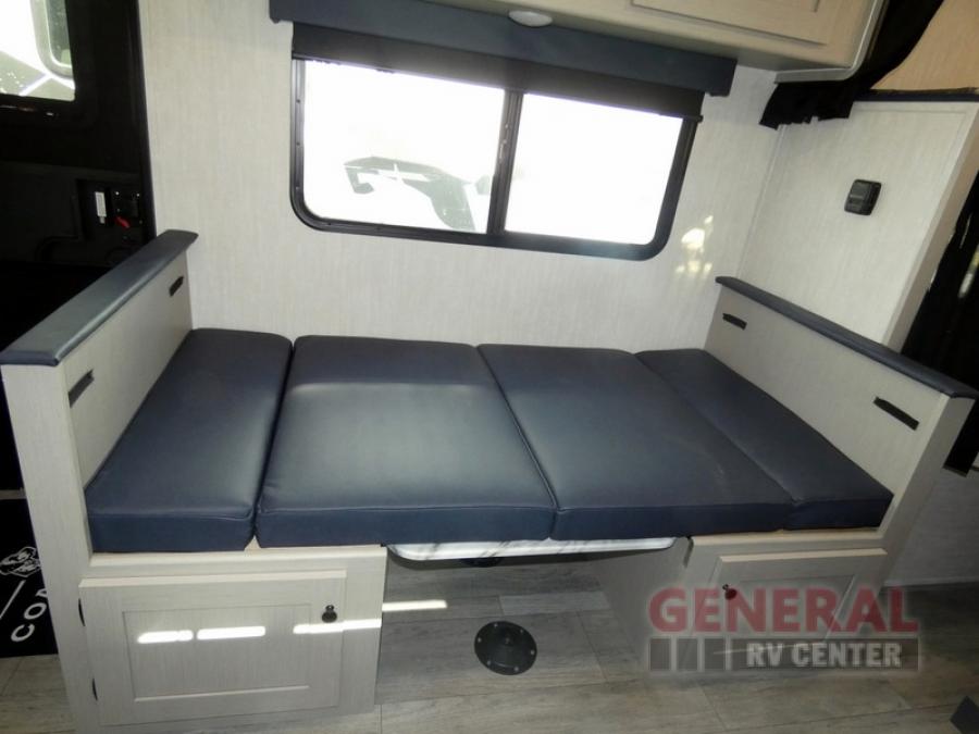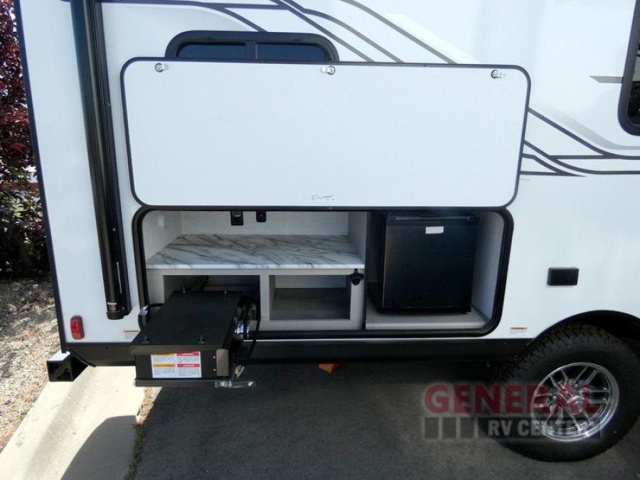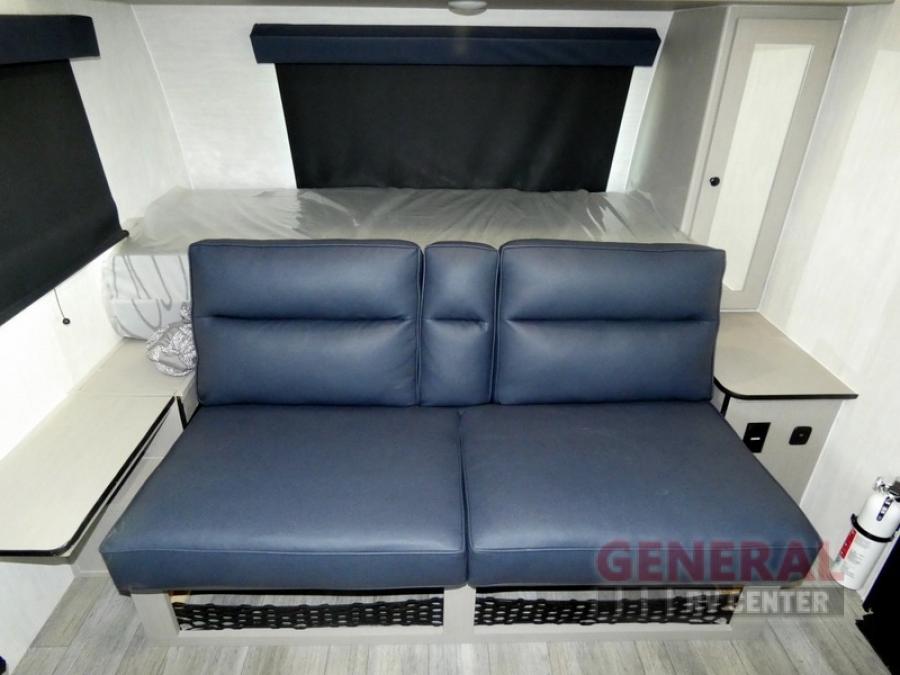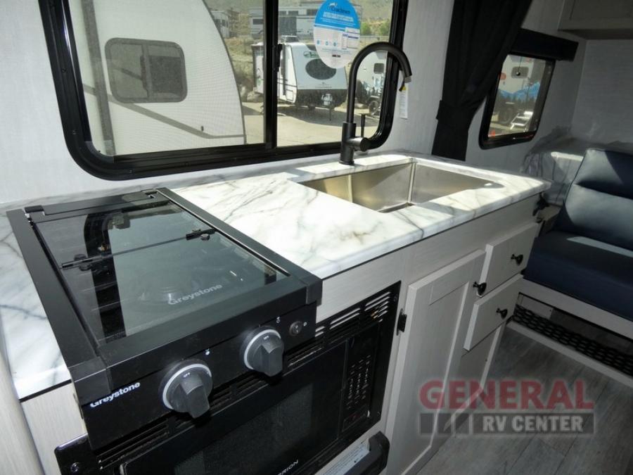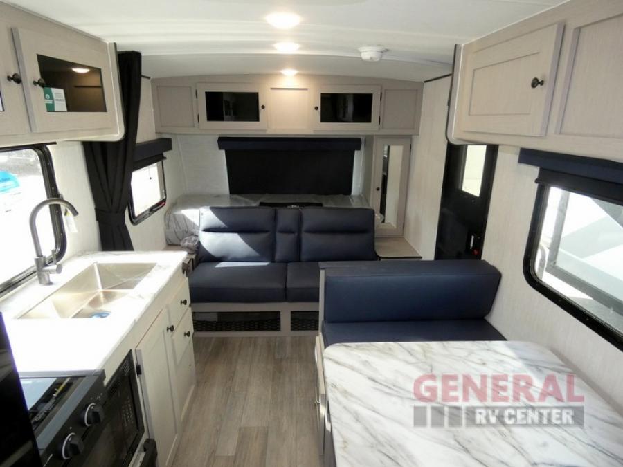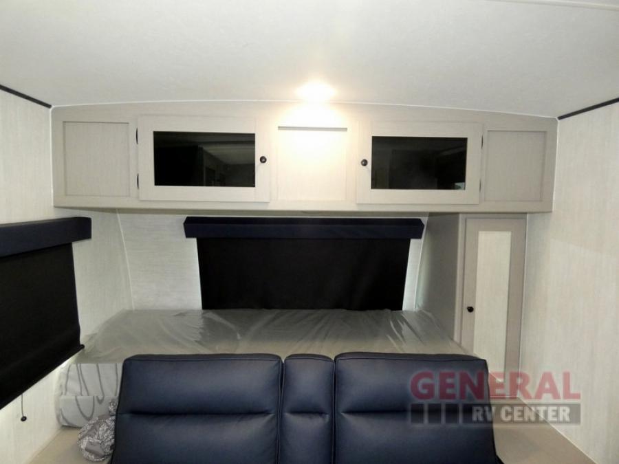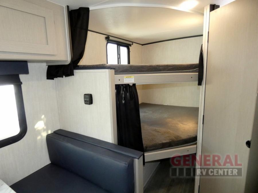 This travel trailer offers versatility with a front Murphy bed depending on your needs. There is a rear corner double bed bunk above a lower flip up double bed and a booth dinette that can transform into an extra sleeping space when you're not using it to enjoy a meal or play a card game. Everyone can stay clean with tub/shower in the rear corner bathroom and keep their bellies full with the two burner cooktop and 8 cu. ft. 12V refrigerator. You can even cook outdoors with the exterior camp kitchen while staying protected by the power awning with LED lighting!