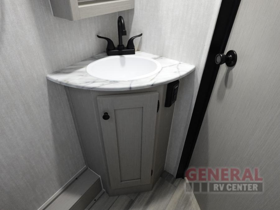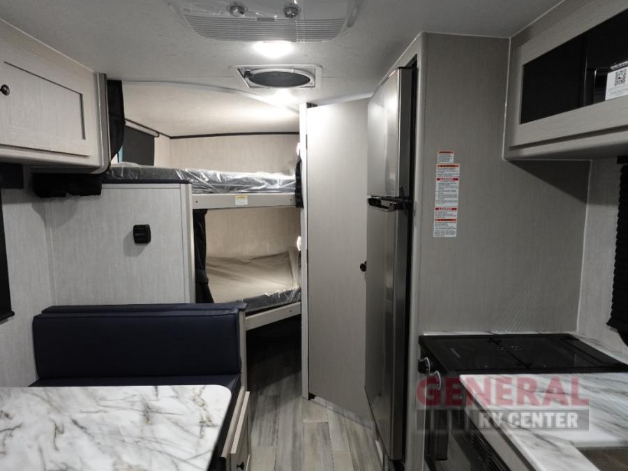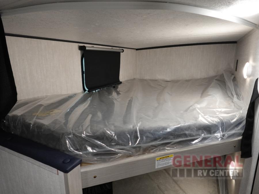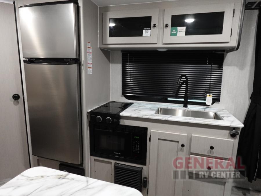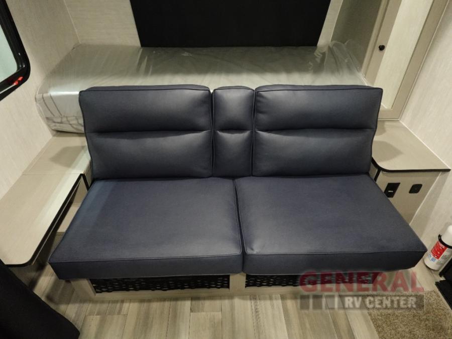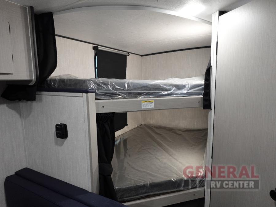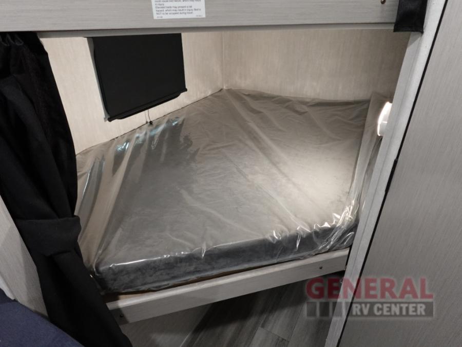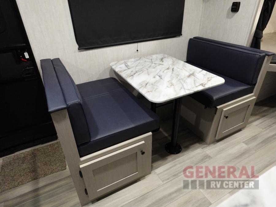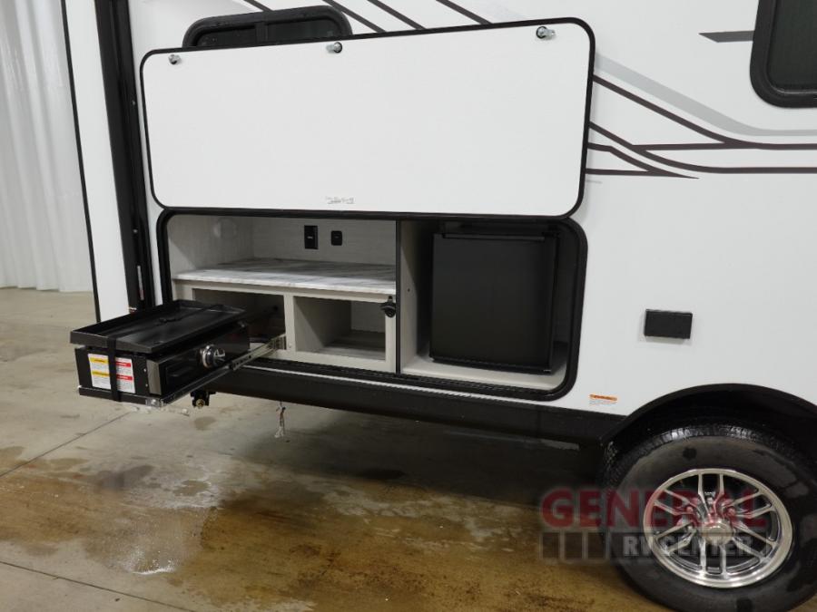 This travel trailer offers versatility with a front Murphy bed. There is a rear corner double bed bunk above a lower flip up double bed and a booth dinette that can transform into an extra sleeping space when you're not using it to enjoy a meal or play a card game. Everyone can stay clean with tub/shower in the rear corner bathroom and keep their bellies full with the two burner cooktop and 8 cu. ft. 12V refrigerator. You can even cook outdoors with the exterior camp kitchen while staying protected by the power awning with LED lighting!