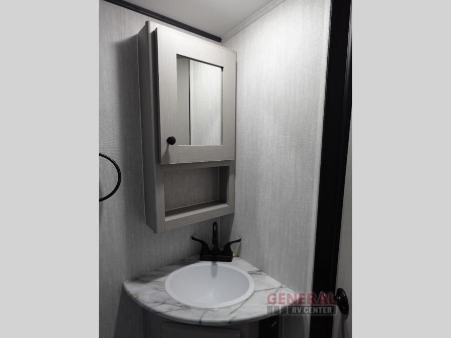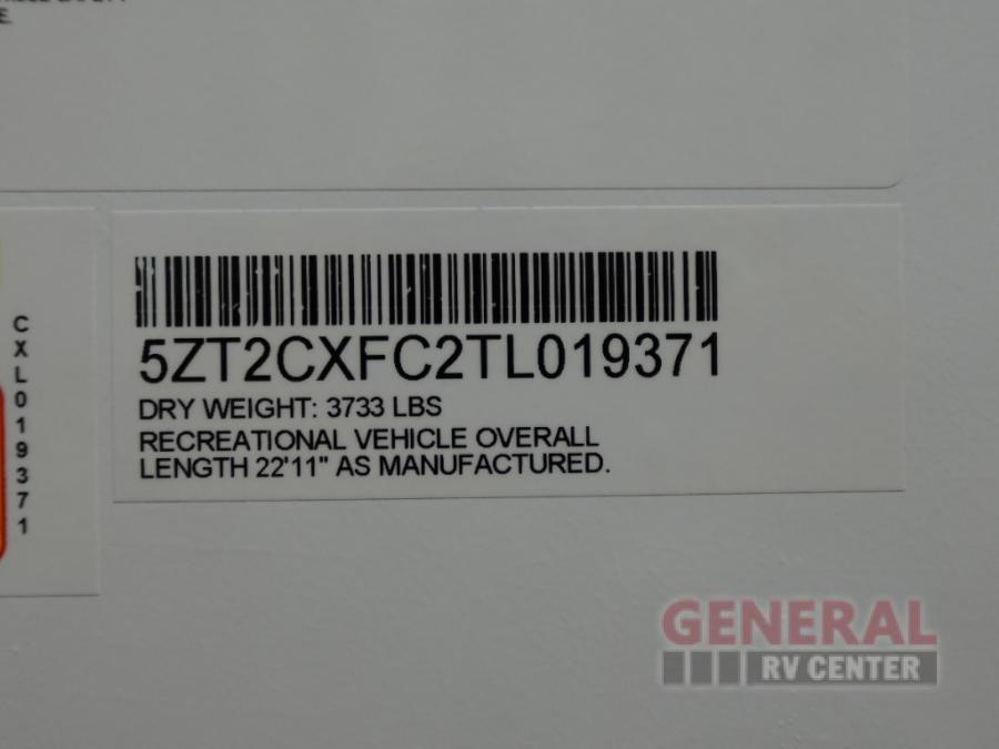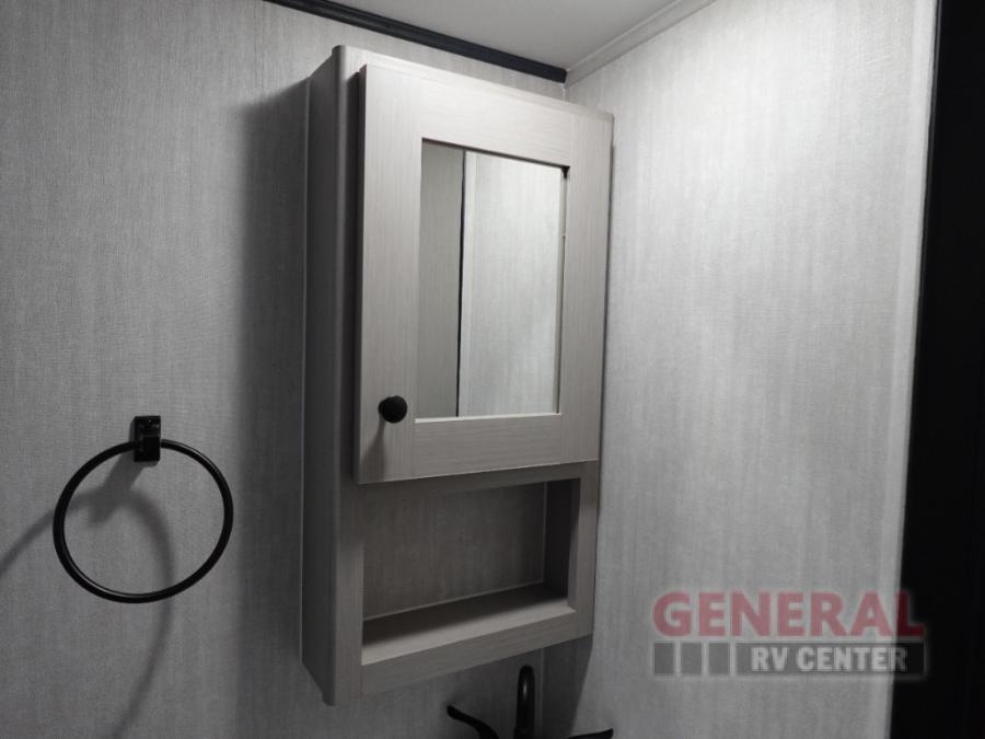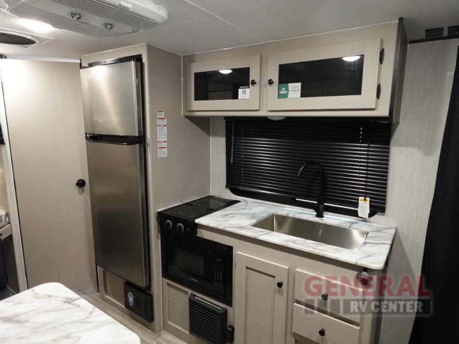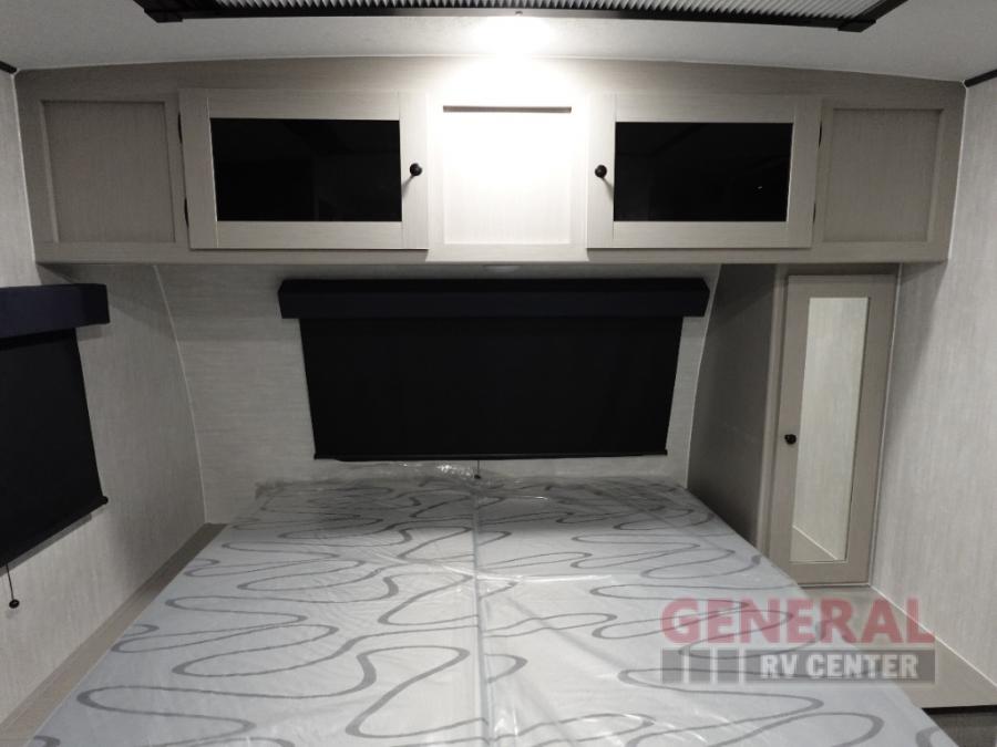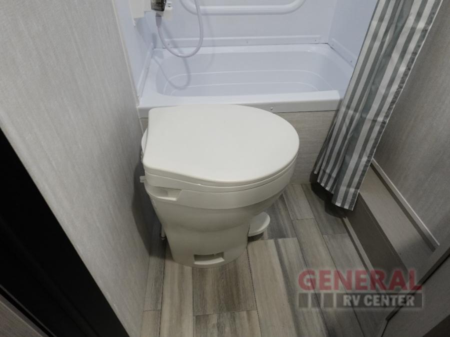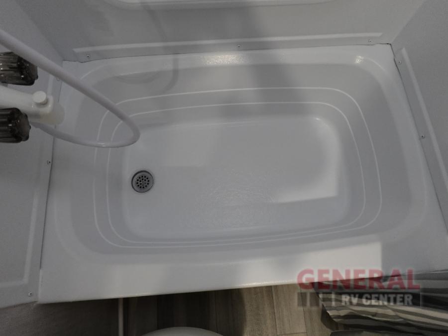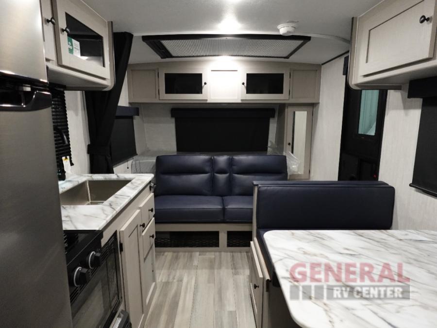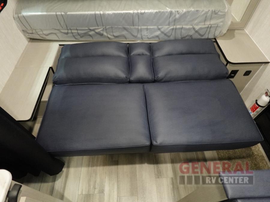 This travel trailer offers versatility with a front Murphy bed. There is a rear corner double bed bunk above a lower flip up double bed and a booth dinette that can transform into an extra sleeping space when you're not using it to enjoy a meal or play a card game. Everyone can stay clean with tub/shower in the rear corner bathroom and keep their bellies full with the two burner cooktop and 8 cu. ft. 12V refrigerator. You can even cook outdoors with the exterior camp kitchen while staying protected by the power awning with LED lighting!