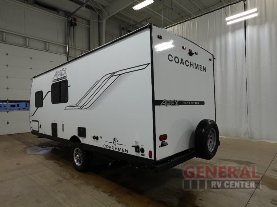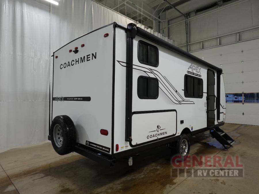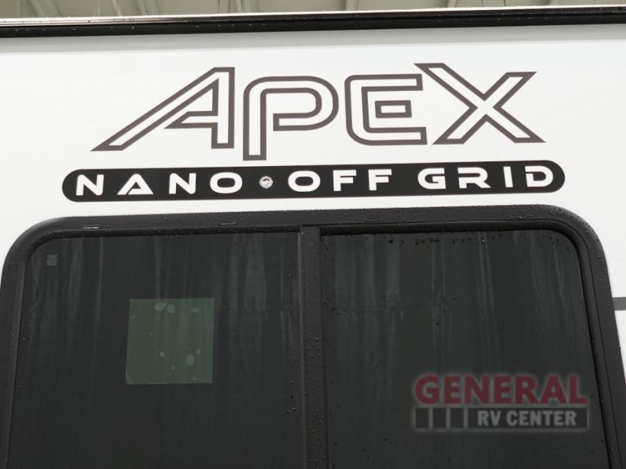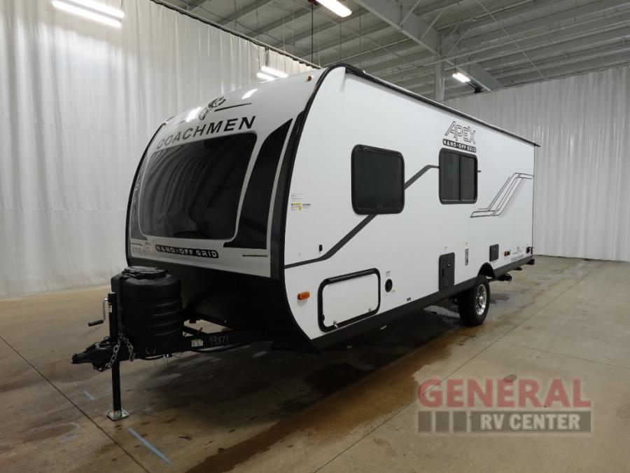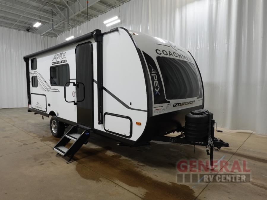 You will find comfort, convenience, and a sturdy construction with each of these Coachmen RV Apex Nano travel trailers! They are held together with an aluma-cage construction, an I-beam chassis, plus vacuum-bonded laminated dual Azdel fiberglass walls for double the protection against the elements. The 200-watt solar panel with a 30 amp control charger is included within the Off-Grid Package, along with two 20 lb. LP tanks, a high velocity power roof vent, plus 12V outlets to keep you powered up. More exterior feature include a hot/cold shower, four stabilizer jacks, a power awning with LED lighting, and magnetic baggage door catches to easily pack and unload your gear. You will love the interior of your Apex Nano with Congoleum residential flooring, one-piece seamless edge countertops, matte black hardware in the galley, and a hand-crafted wood medicine cabinet in the bath.