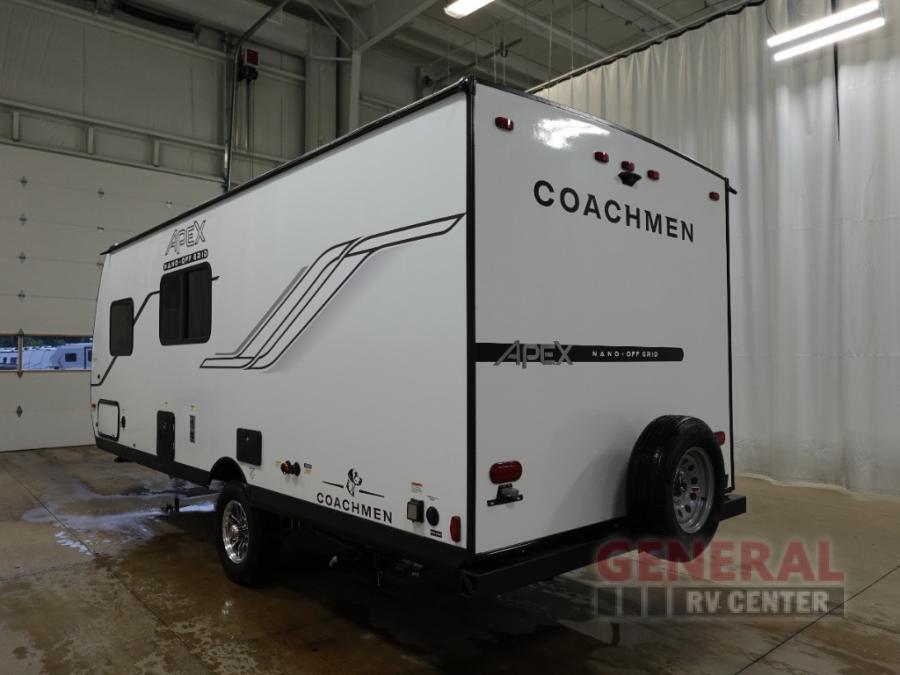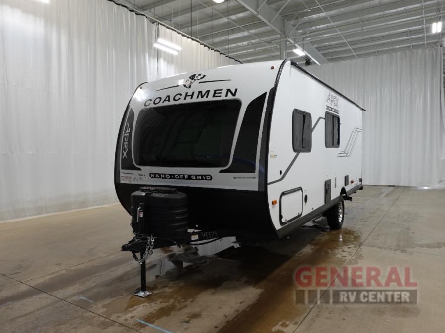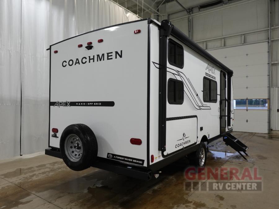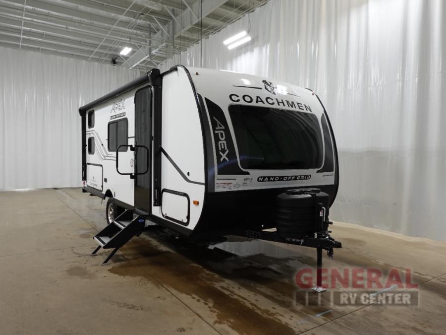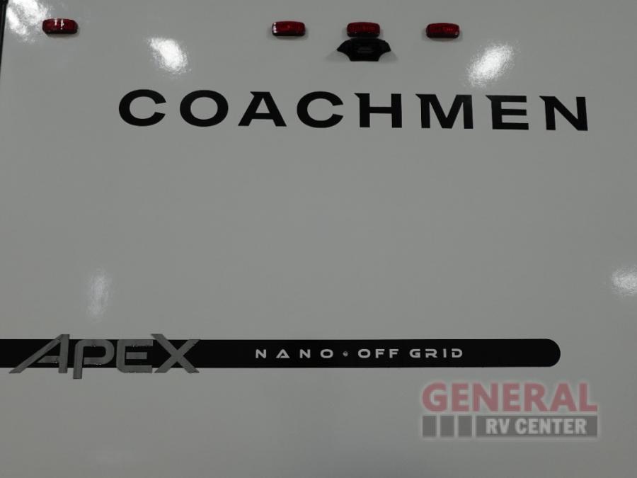 You will find comfort, convenience, and a sturdy construction with each of these Coachmen RV Apex Nano travel trailers! They are held together with an aluma-cage construction, an I-beam chassis, plus vacuum-bonded laminated dual Azdel fiberglass walls for double the protection against the elements. The 200-watt solar panel with a 30 amp control charger is included within the Off-Grid Package, along with two 20 lb. LP tanks, a high velocity power roof vent, plus 12V outlets to keep you powered up. More exterior feature include a hot/cold shower, four stabilizer jacks, a power awning with LED lighting, and magnetic baggage door catches to easily pack and unload your gear. You will love the interior of your Apex Nano with Congoleum residential flooring, one-piece seamless edge countertops, matte black hardware in the galley, and a hand-crafted wood medicine cabinet in the bath.