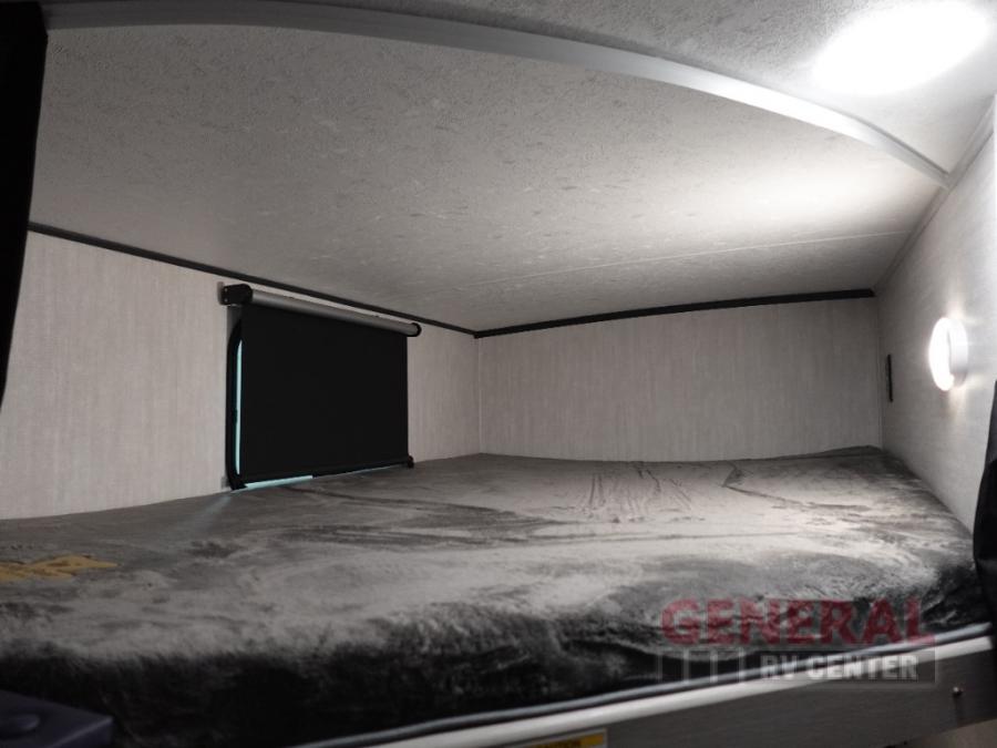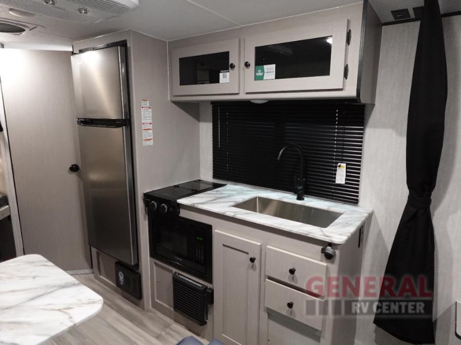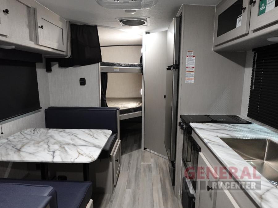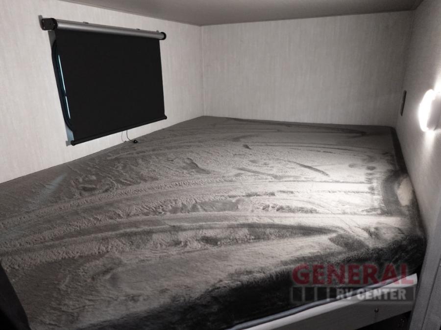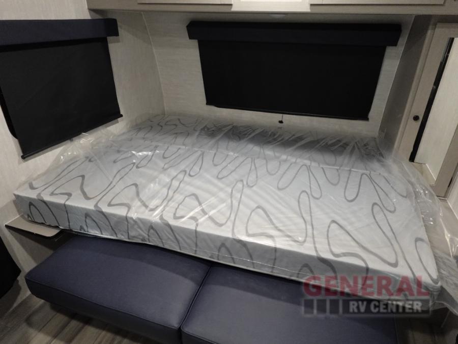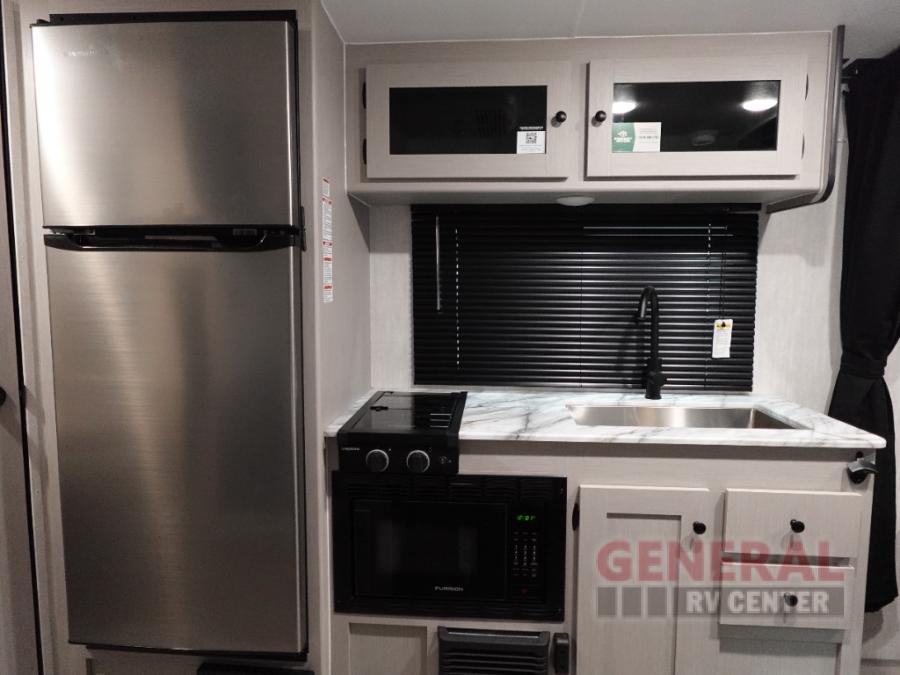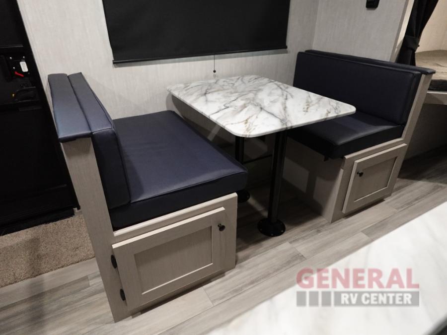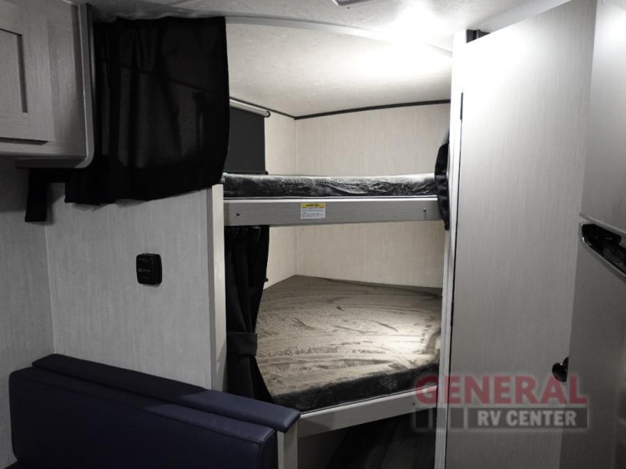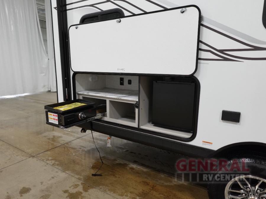 This travel trailer offers versatility with a front Murphy Bed. There is a rear corner double bed bunk above a lower flip up double bed and a booth dinette that can transform into an extra sleeping space when you're not using it to enjoy a meal or play a card game. Everyone can stay clean with tub/shower in the rear corner bathroom and keep their bellies full with the two burner cooktop and 8 cu. ft. 12V refrigerator. You can even cook outdoors with the exterior camp kitchen while staying protected by the power awning with LED lighting!