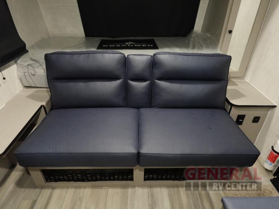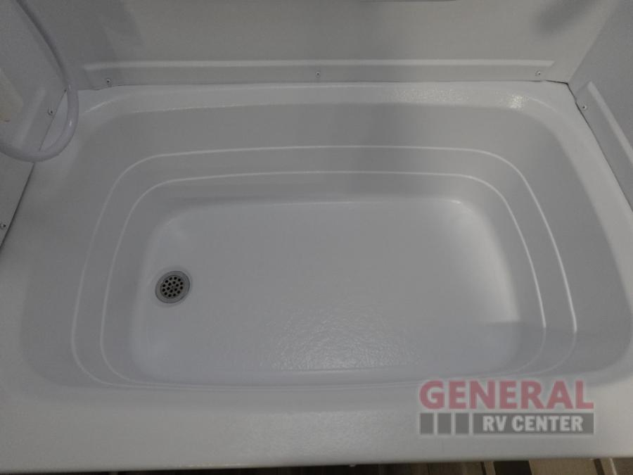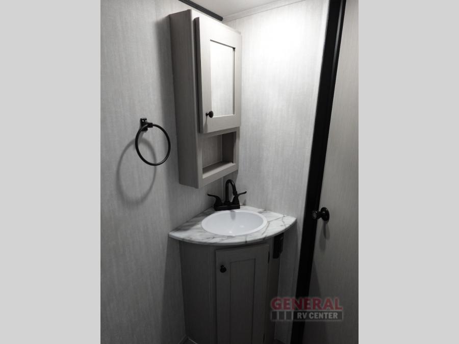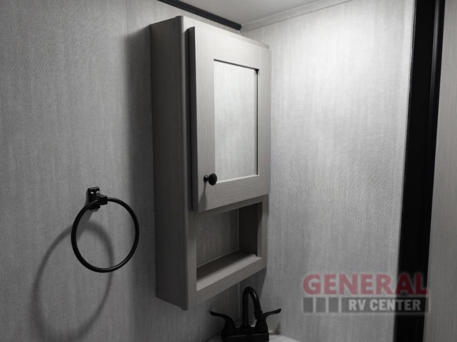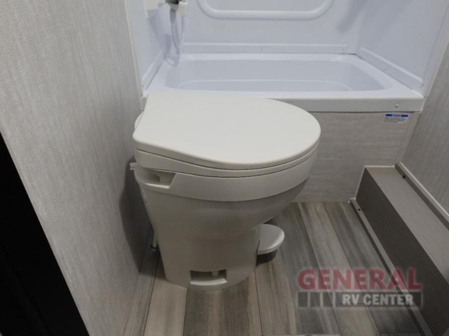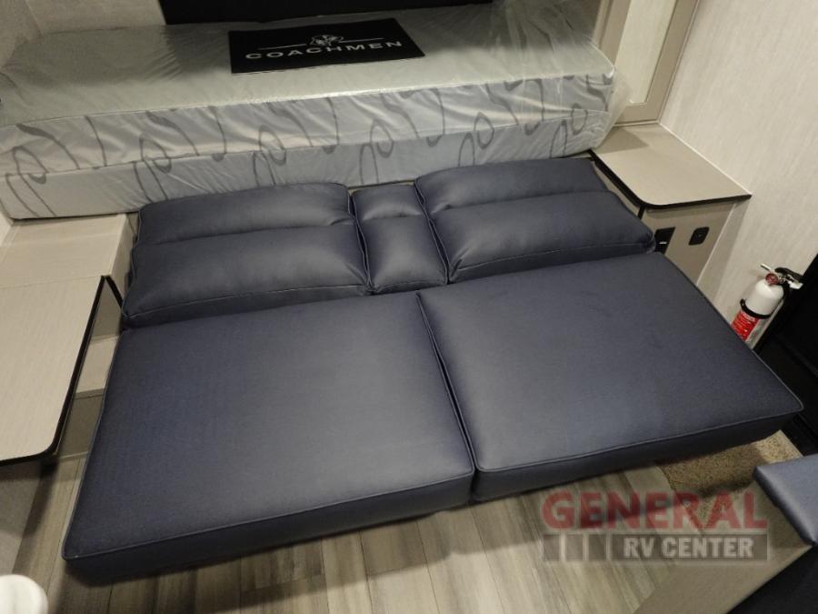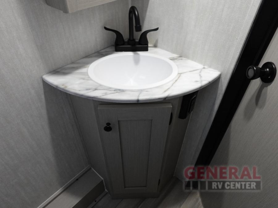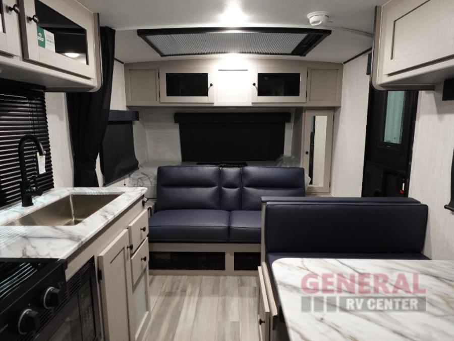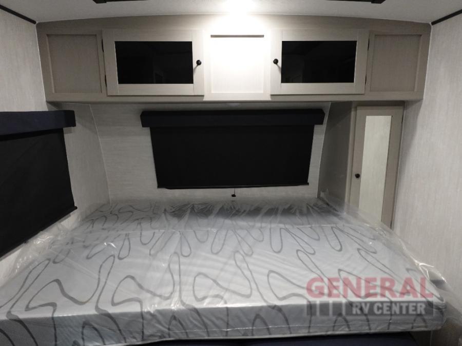 This travel trailer offers versatility with a front Murphy Bed. There is a rear corner double bed bunk above a lower flip up double bed and a booth dinette that can transform into an extra sleeping space when you're not using it to enjoy a meal or play a card game. Everyone can stay clean with tub/shower in the rear corner bathroom and keep their bellies full with the two burner cooktop and 8 cu. ft. 12V refrigerator. You can even cook outdoors with the exterior camp kitchen while staying protected by the power awning with LED lighting!