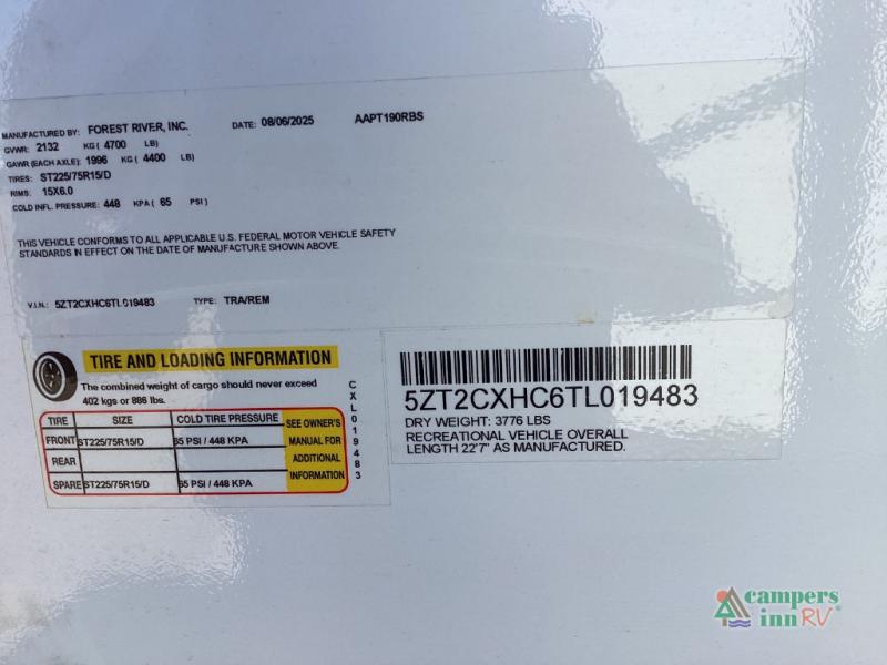 3,670?lb dry weight, 4,700?lb GVWR, 461?lb hitch weight and 52?gal fresh tank capacity—all within easy tow range of many half-ton vehicles.