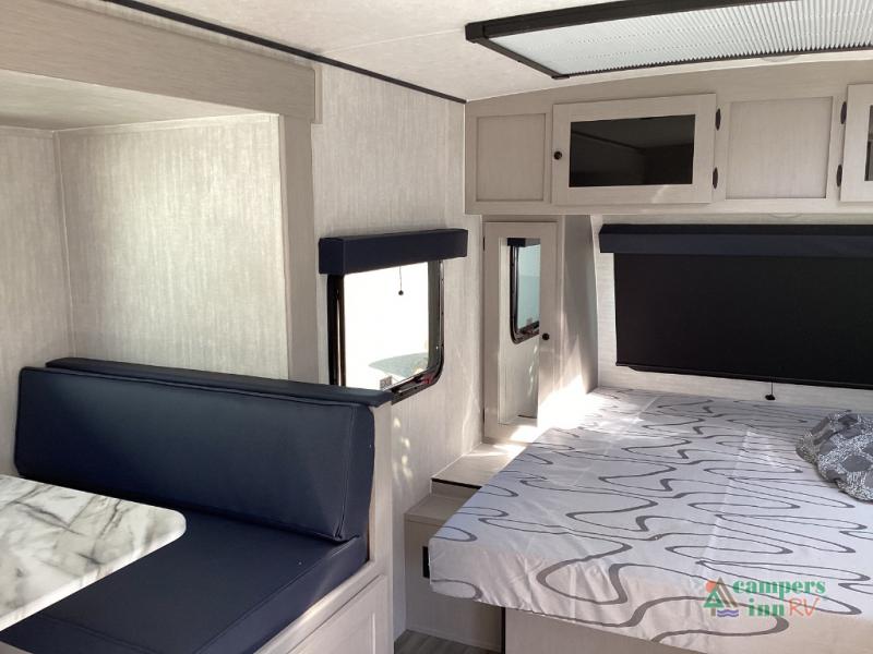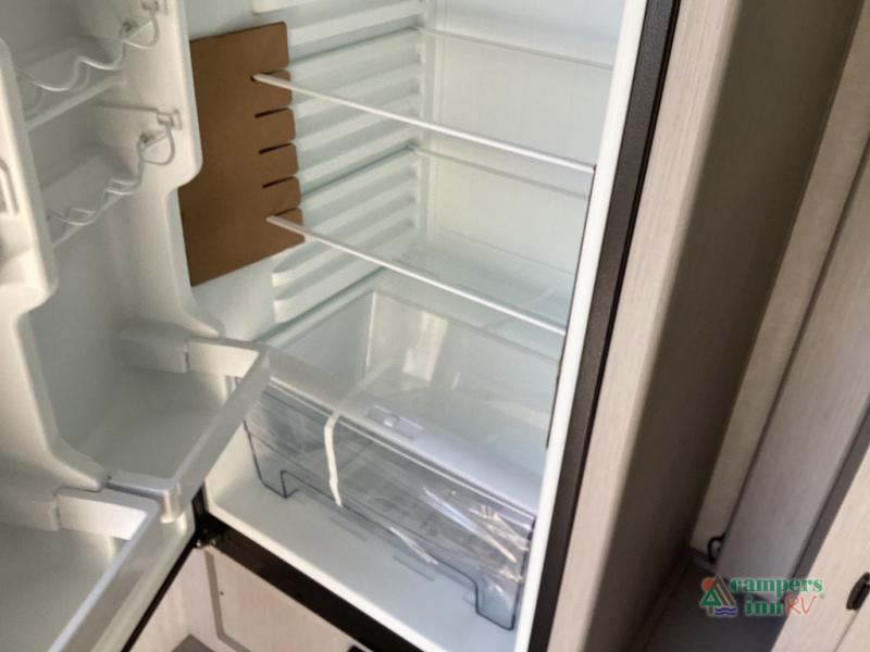 Features clean-lined countertops, smart cabinetry, stellar 8 cu. ft. 12V fridge, digital antenna/WiFi-ready, and a booth dinette or sofa suite for flexible living space.