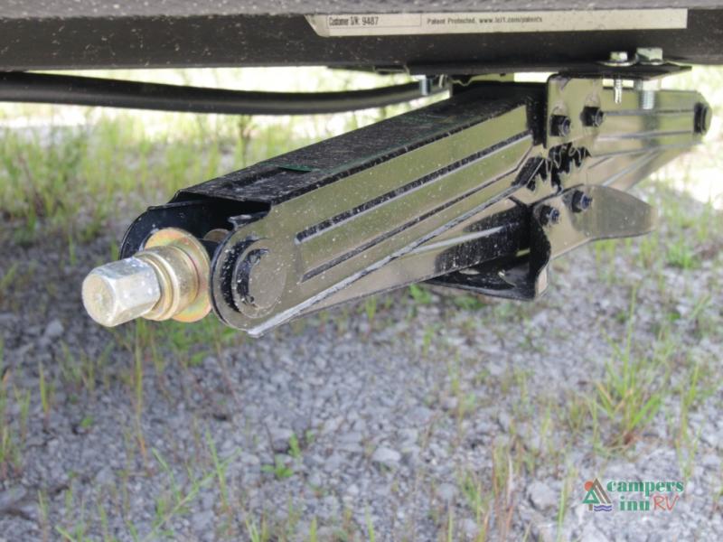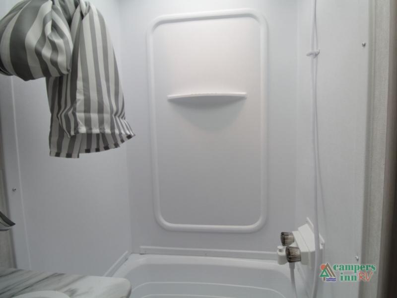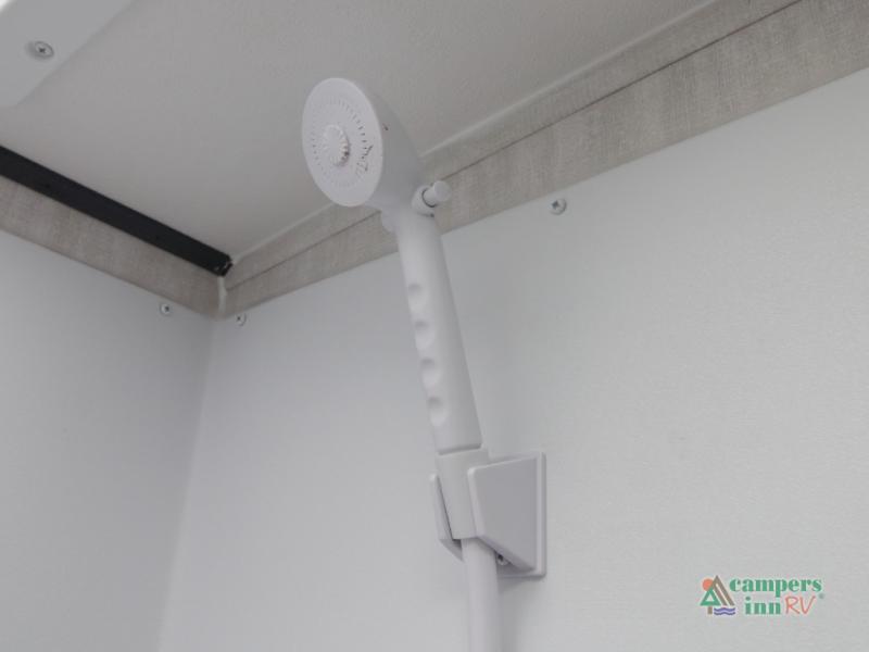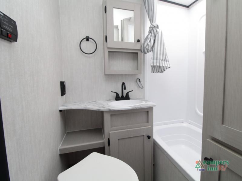 The rear corner bathroom includes a tub/shower and wardrobe, giving you comfort and convenience without leaving the campsite. Outdoors, you’ll find pass-through storage, stabilizer jacks, and an exterior hot/cold shower for quick cleanups.