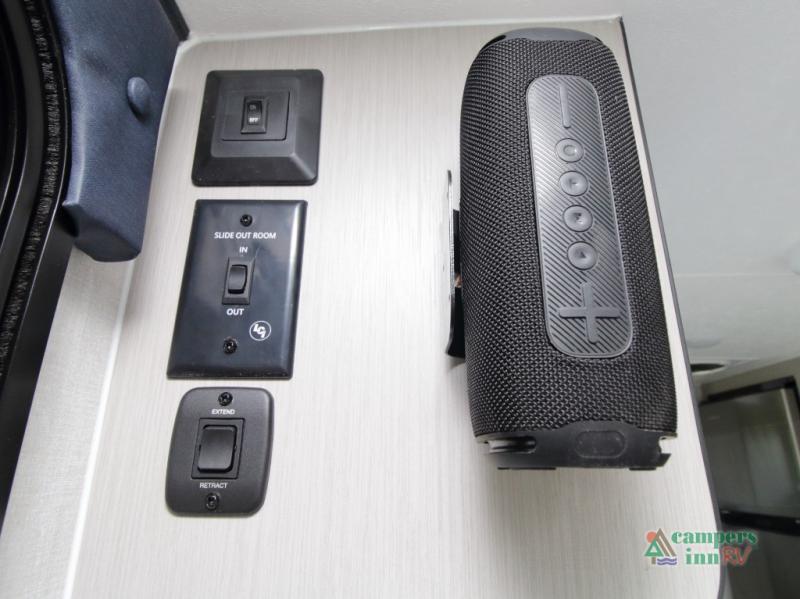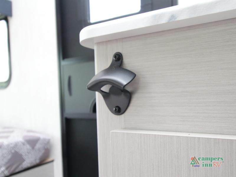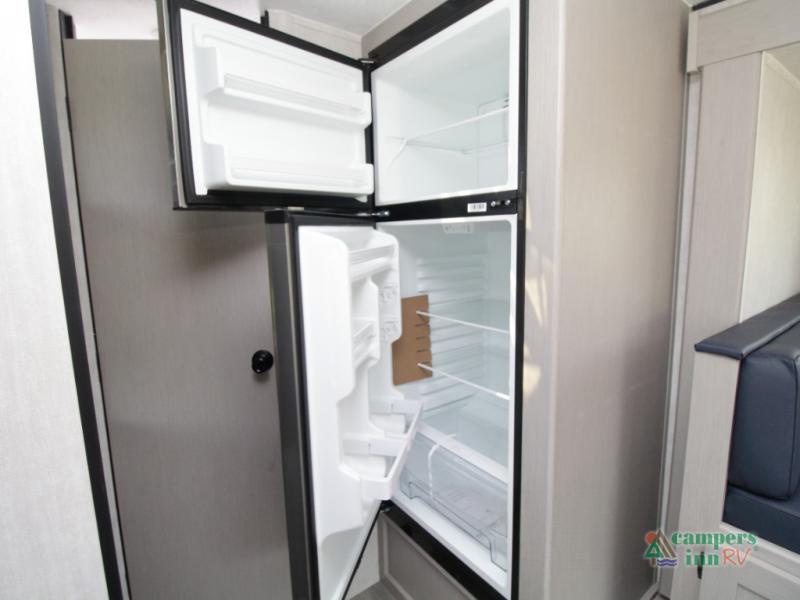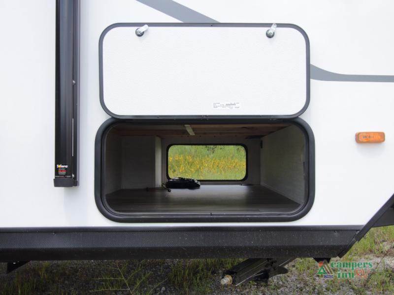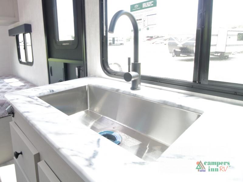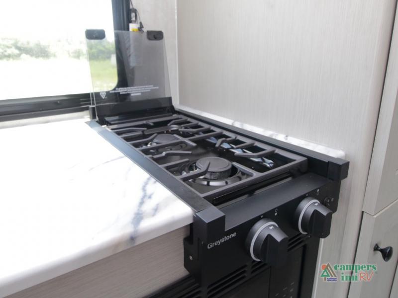 Cooking is simple and flexible with a fully equipped indoor kitchen featuring a two-burner cooktop, microwave, and 8 cu. ft. 12V refrigerator. For those who prefer fresh air, the outdoor camp kitchen makes it easy to prepare meals under the power awning with LED lighting.