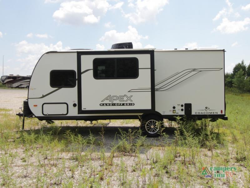 Built to last, the Apex Nano features aluma-cage construction, laminated Azdel fiberglass walls, and an I-beam chassis. With the Off-Grid Package, you get a 200-watt solar panel, 30-amp charge controller, dual LP tanks, and 12V outlets, keeping you powered wherever your adventures take you.