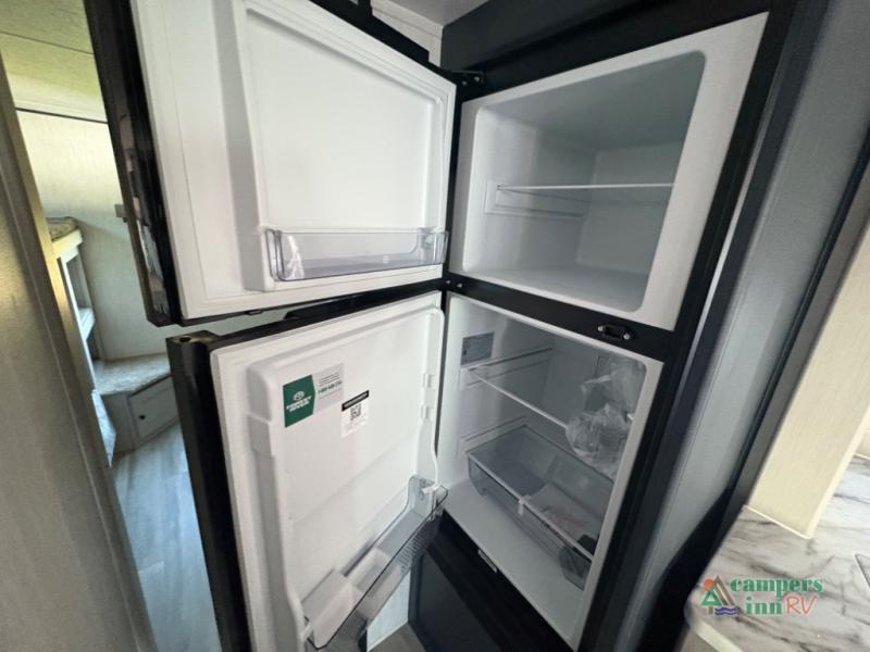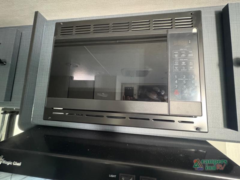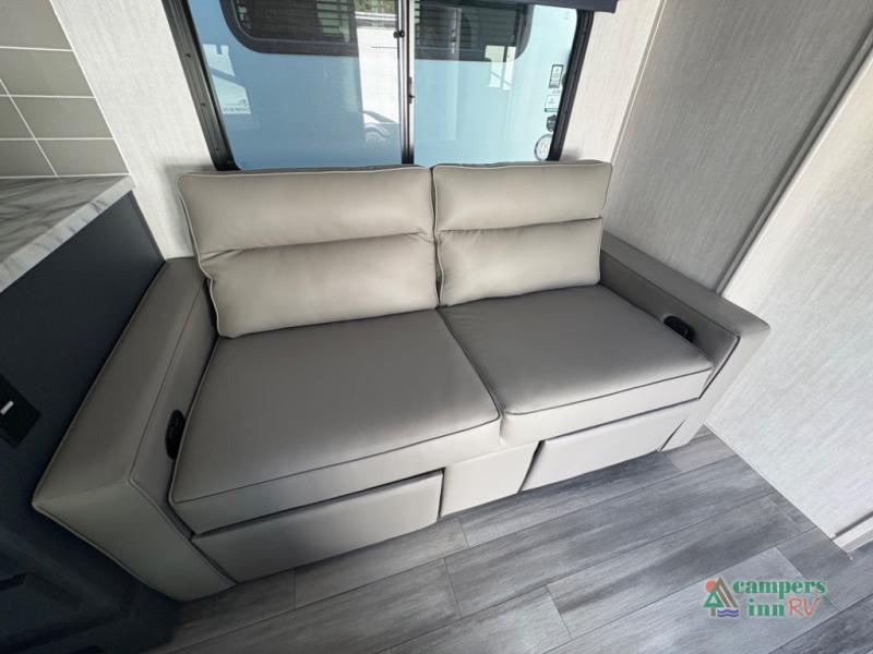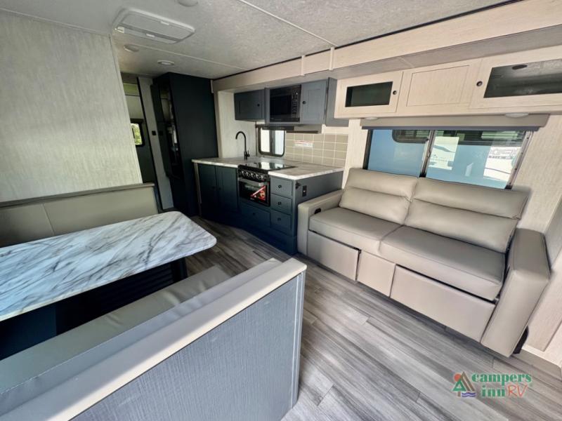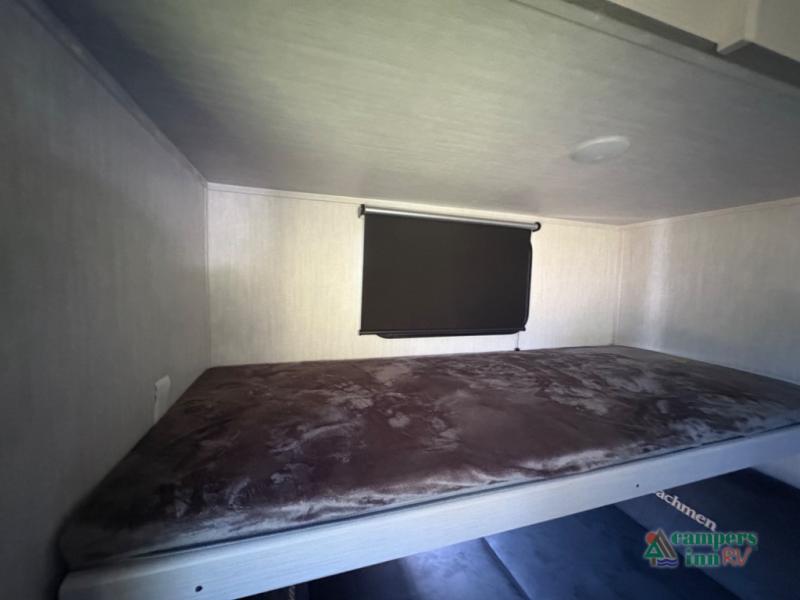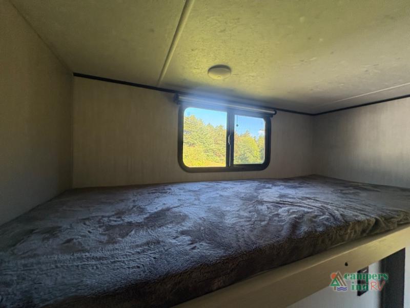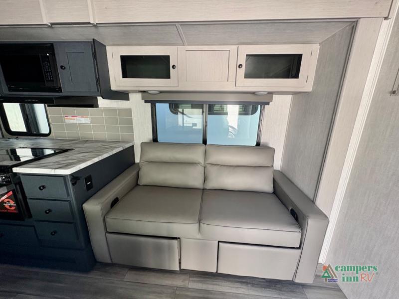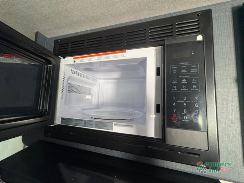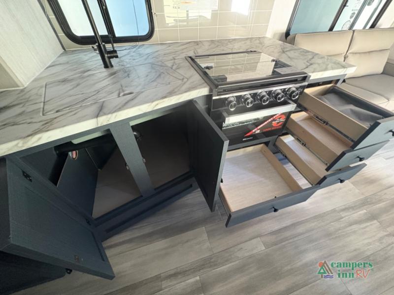 Double slides, a bunkhouse, plus a private bedroom and sleeping for nine make this model ready for anything! There is a private bunkhouse with a slide out futon and an overhead bunk, plus a second bunk for the kids to enjoy. Up front, a queen bed with super storage will provide two a comfortable night's rest in a private bedroom, and any other guests can sleep on the booth dinette and sofa in the main living area. The chef can cook indoors, or outdoors on the outside kitchen, and since there is an 18' power awning with LED lights, you can enjoy a bit of outdoor living space as well!