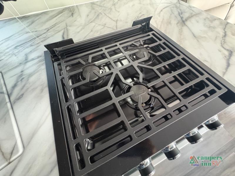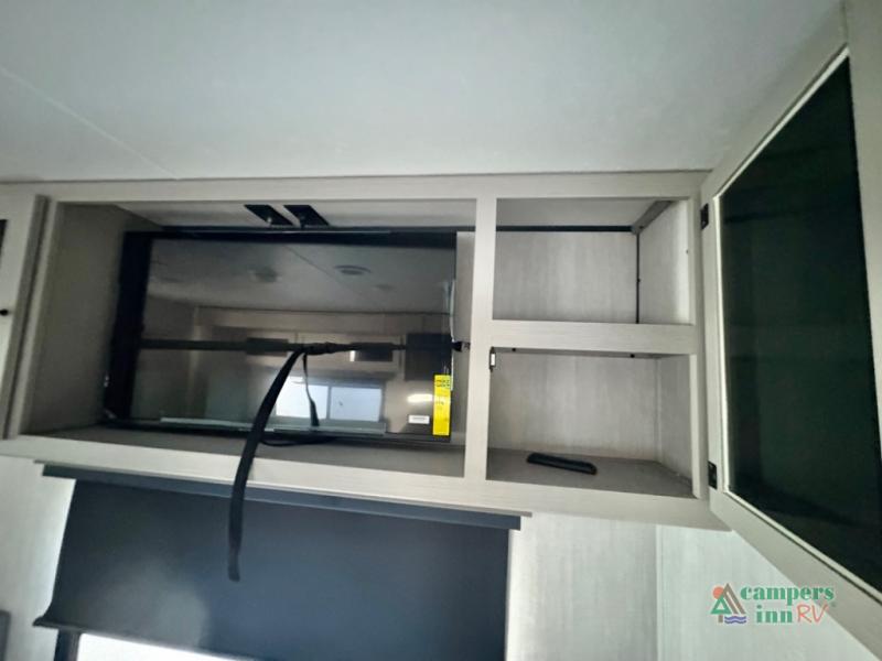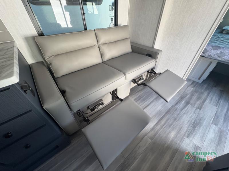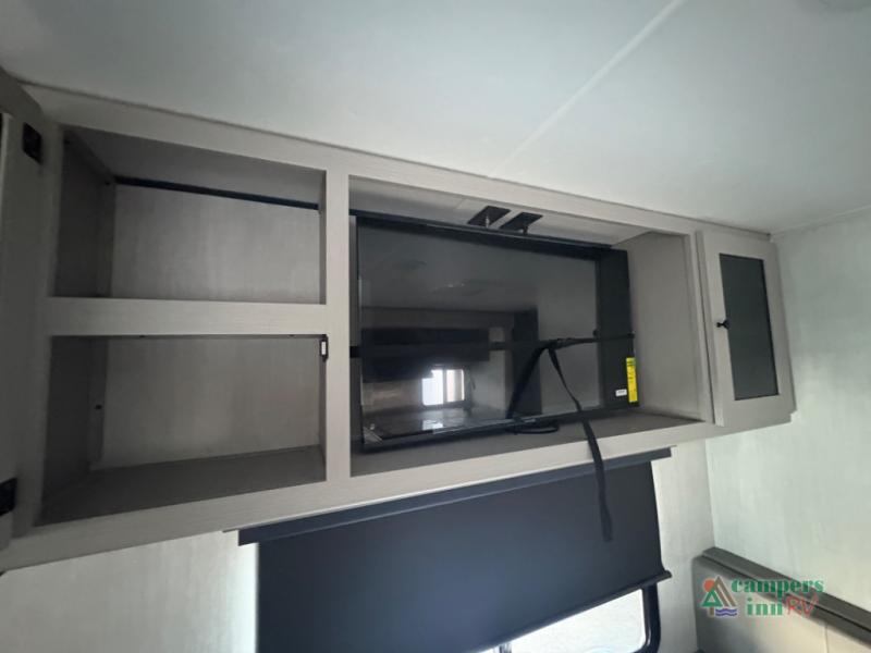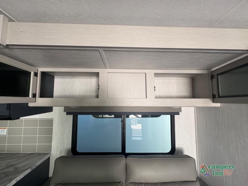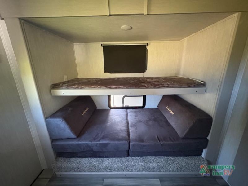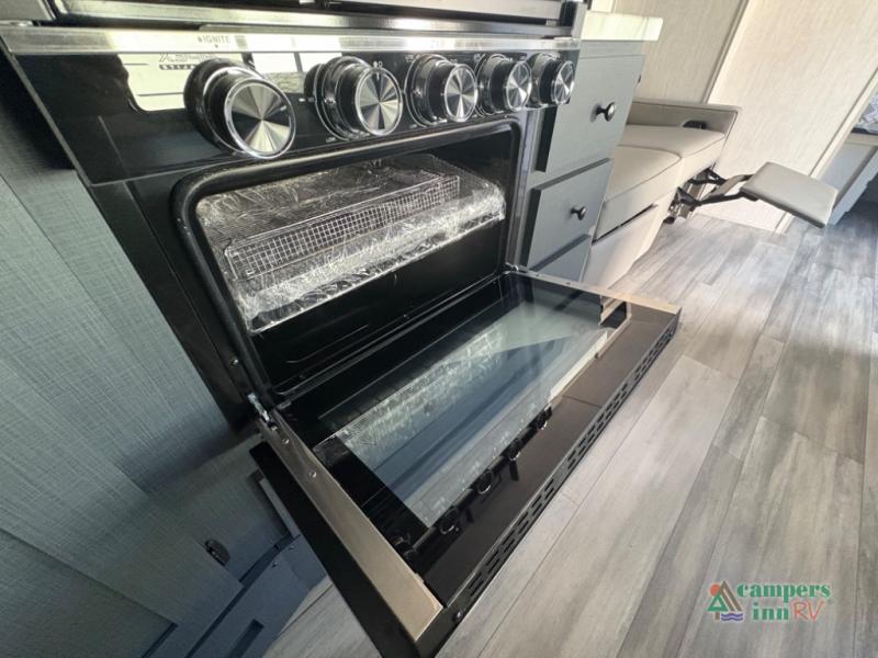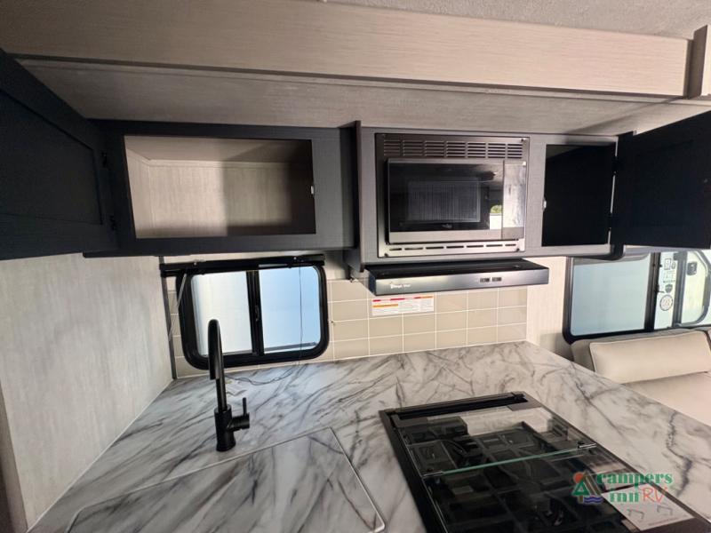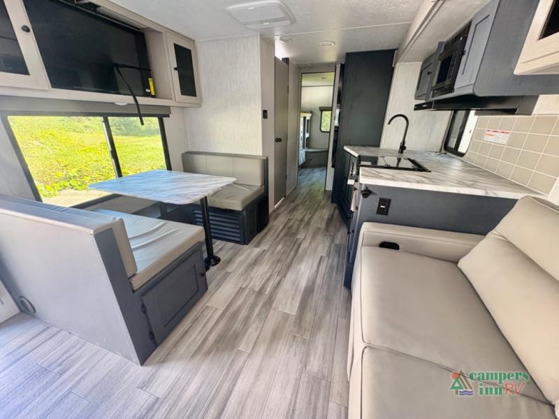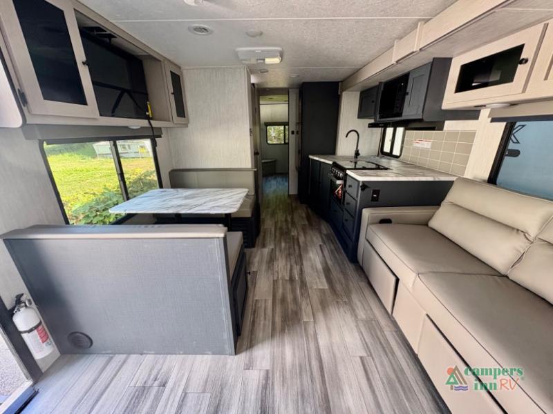 Double slides, a bunkhouse, plus a private bedroom and sleeping for nine make this model ready for anything! There is a private bunkhouse with a slide out futon and an overhead bunk, plus a second bunk for the kids to enjoy. Up front, a queen bed with super storage will provide two a comfortable night's rest in a private bedroom, and any other guests can sleep on the booth dinette and sofa in the main living area. The chef can cook indoors, or outdoors on the outside kitchen, and since there is an 18' power awning with LED lights, you can enjoy a bit of outdoor living space as well!