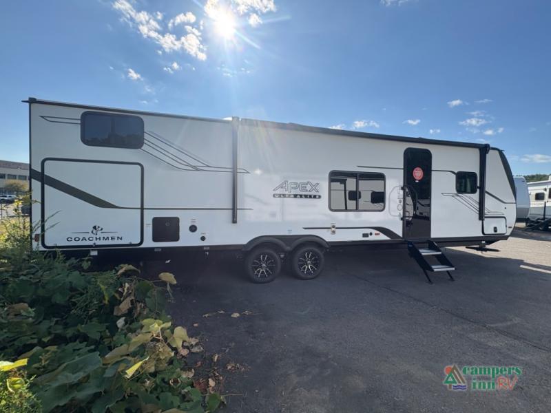 Lightweight living and camping is found with the Apex Ultra-Lite travel trailers by Coachmen. These eco-friendly units are made to last thanks to the Azdel composite sidewalls, the laminated aluminum floor, and the vacuum-bonded laminated crowned roof. Easy lube axles make towing easier than ever, plus there is a friction hinge entrance door, a 200-watt solar panel with a 30 Amp control charger, and slam latch baggage door catches for easy unloading. Some of the interior comforts you'll fall in love with are the one-piece seamless edge countertops, the hard valances with night shades, the matte black hardware, and the Casino Bisque cabinetry. The Apex Ultra-Lite trailers also include a USB charge station, plus a digital TV antenna with cable hook-ups and Wi-Fi capability for the option to stay connected as you camp!