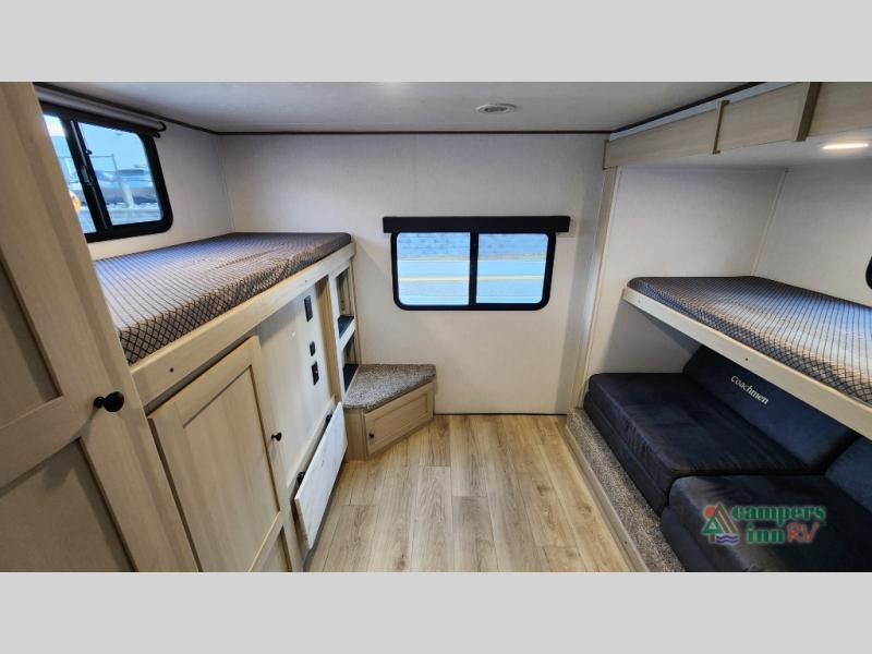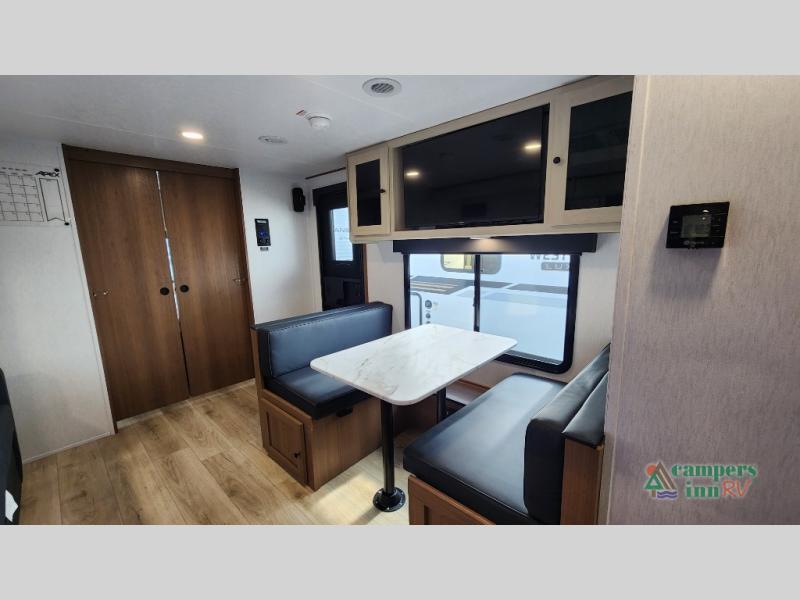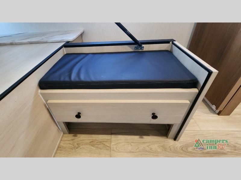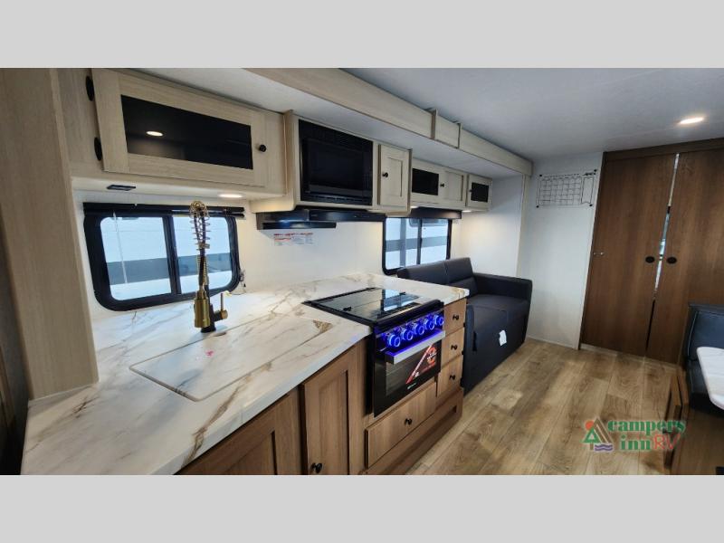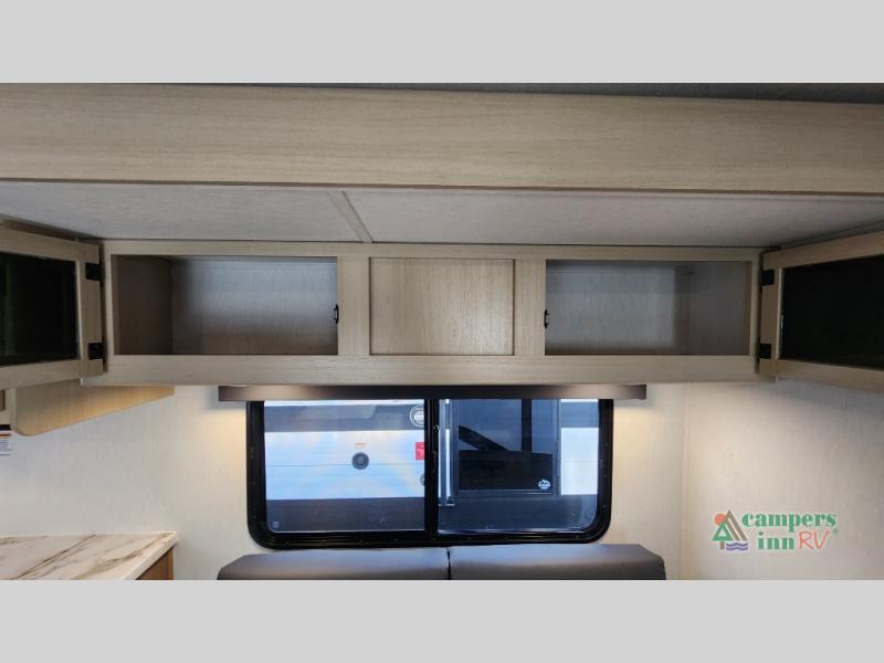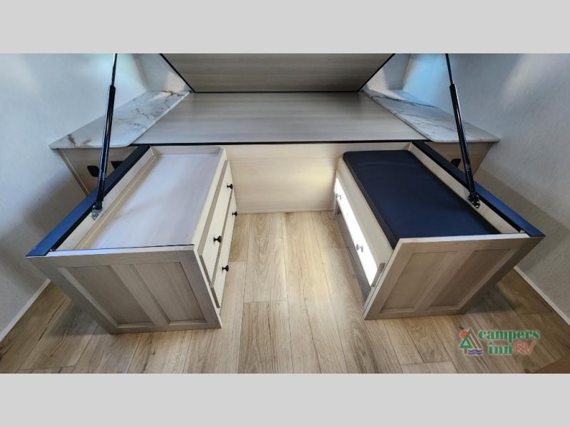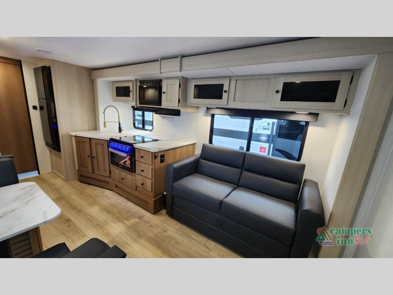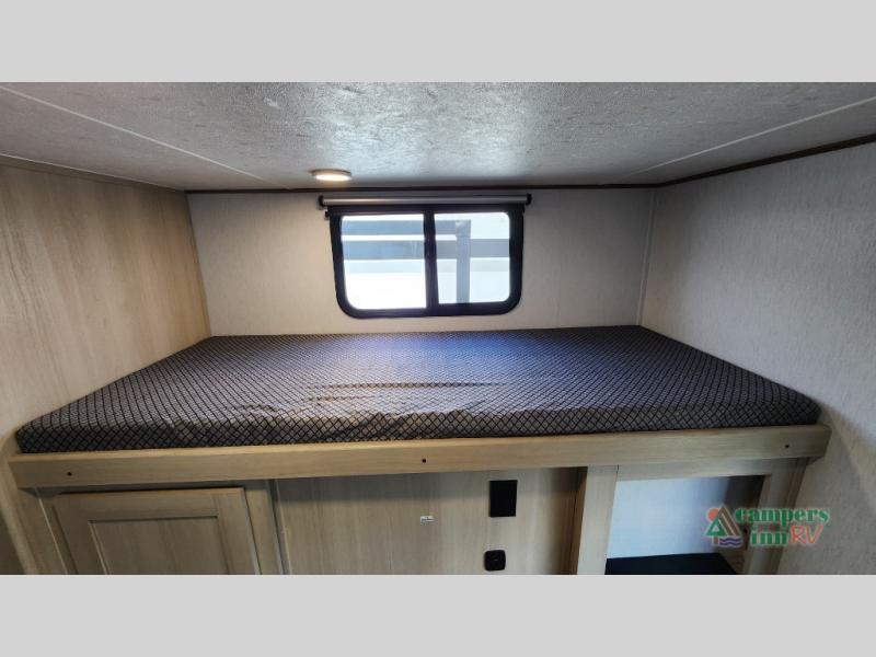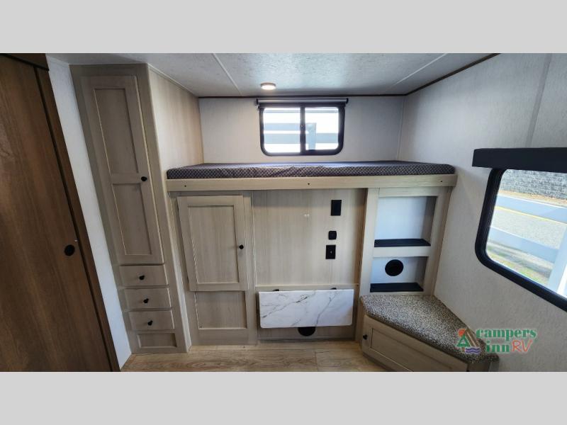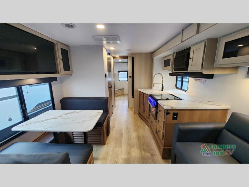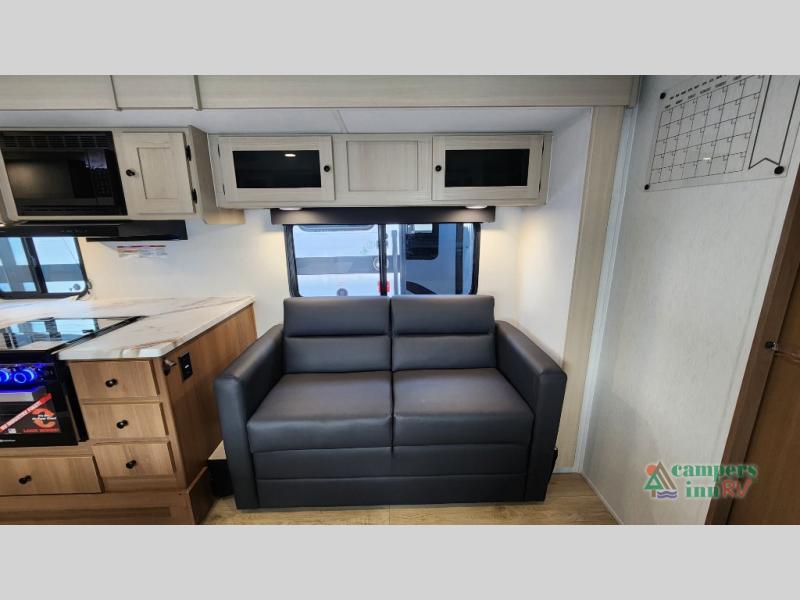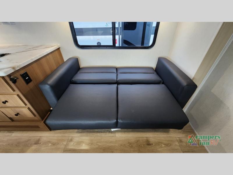 Step inside and discover spacious living with two slide-outs, a private bunkhouse for the kids or guests, and a separate queen bedroom up front for peaceful nights. The booth dinette and sofa create a cozy living area for meals, movie nights, or rainy-day games — and when it’s time to head outside, the 18' power awning with LED lighting extends your living space right to the campsite.