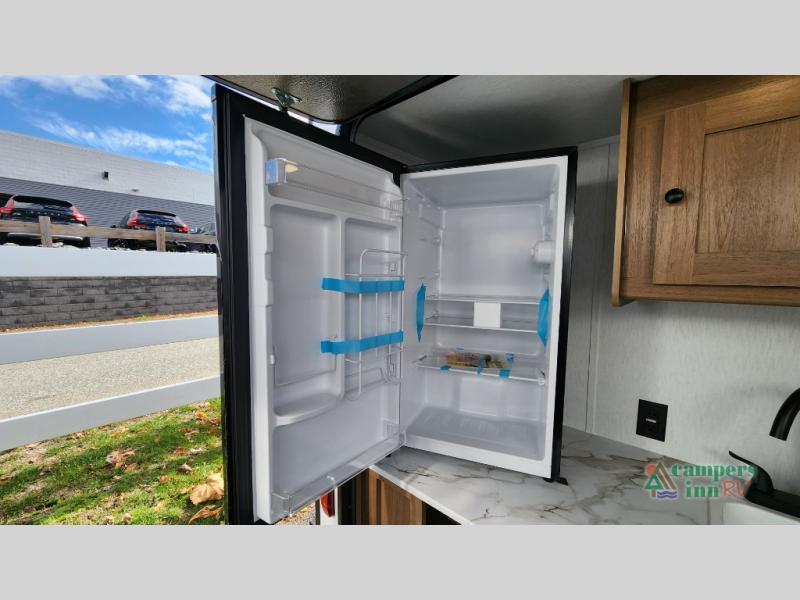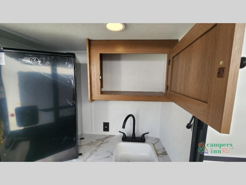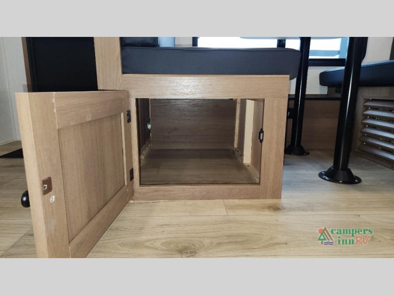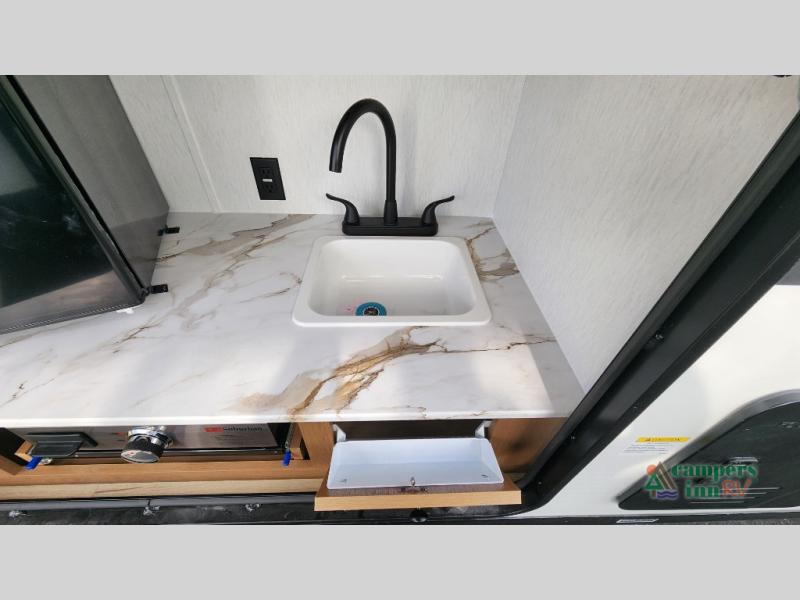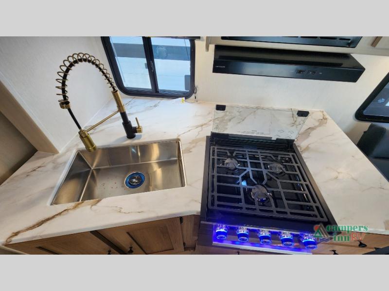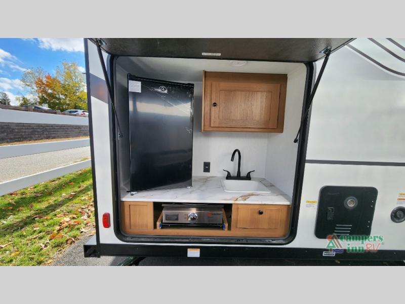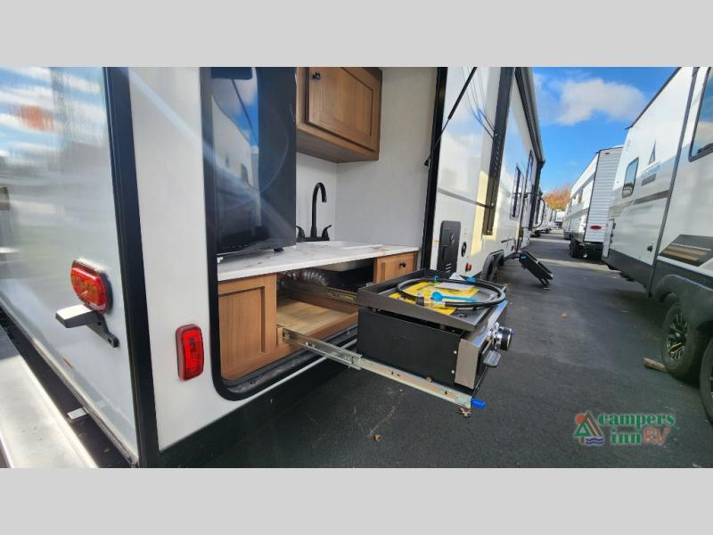 The outdoor kitchen with mini-fridge and cooktop keeps the fun going outdoors. Enjoy fresh air, cook your favorite meals, and make the most of your time in nature without ever feeling confined to the trailer.