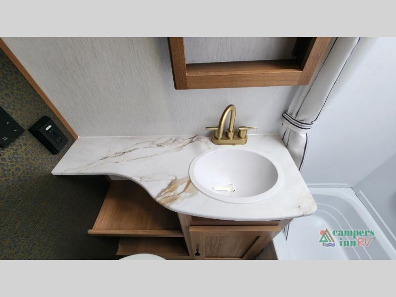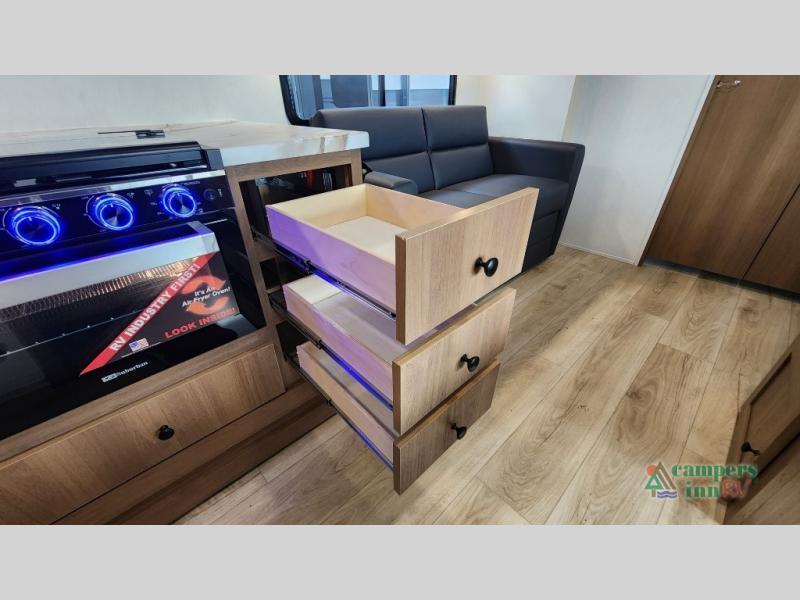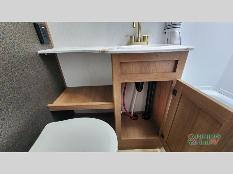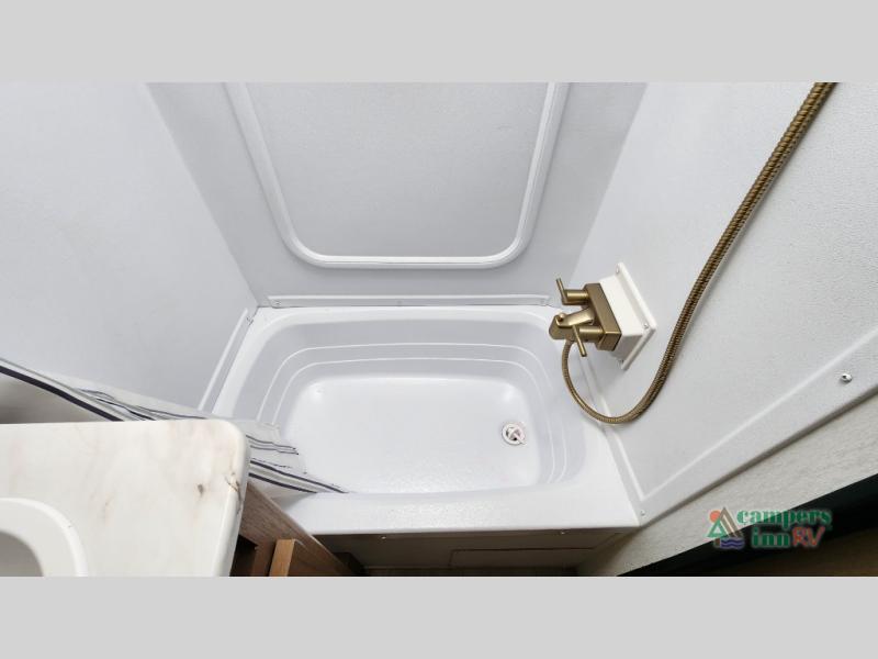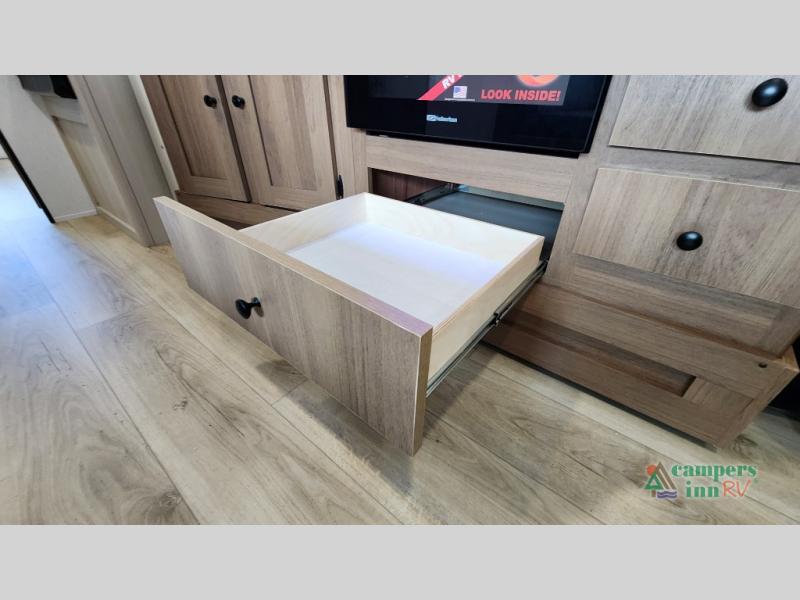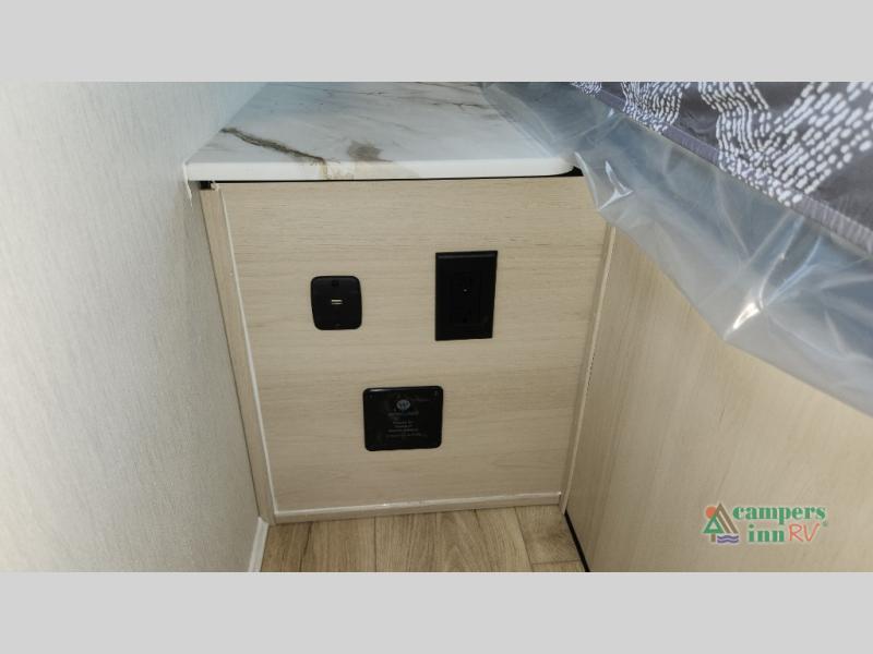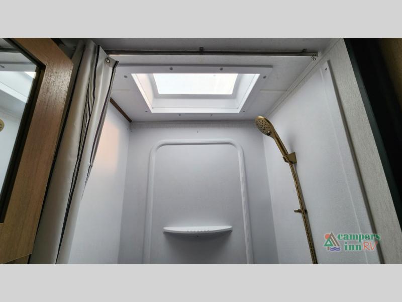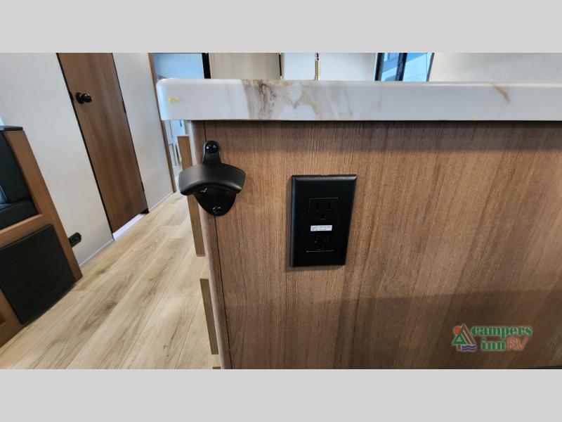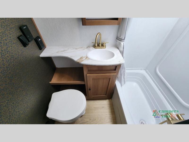 Inside, you’ll find the thoughtful touches that make every trip feel like home — seamless edge countertops, energy-efficient LED lighting, USB charging ports, a full entertainment setup, and plenty of storage throughout. The full bathroom with a tub/shower combo gives families extra comfort, and the 50-gallon fresh water tank lets you stay off the grid longer. Optional solar panel prep or integrated solar capability helps keep your power flowing wherever you roam.