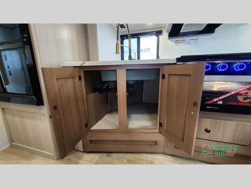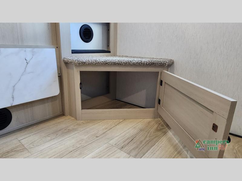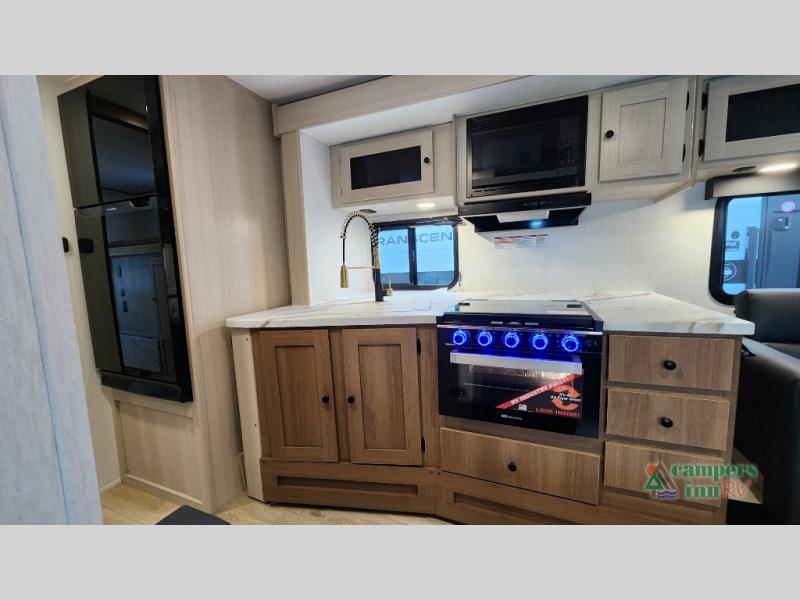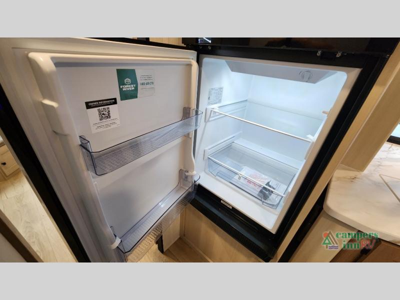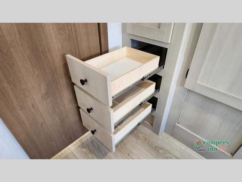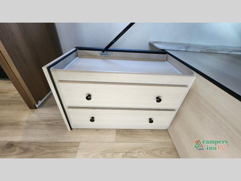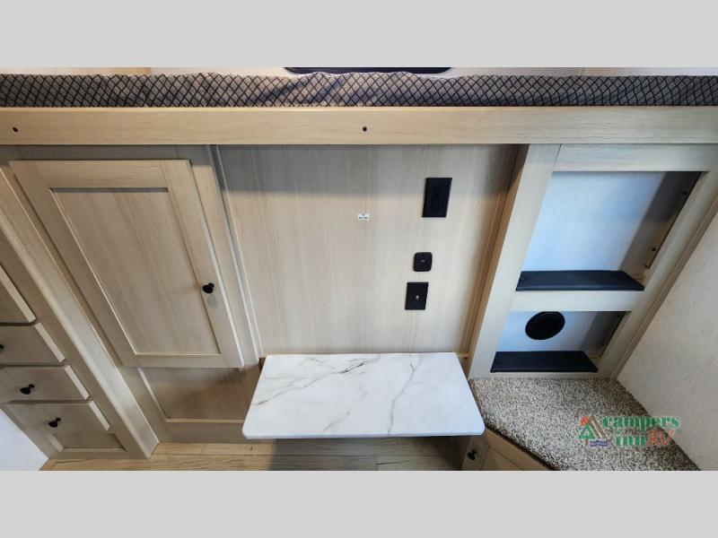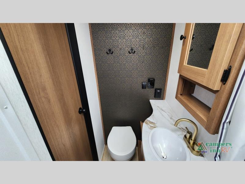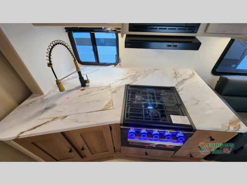 Inside, you’ll find the thoughtful touches that make every trip feel like home — seamless edge countertops, energy-efficient LED lighting, USB charging ports, a full entertainment setup, and plenty of storage throughout. The full bathroom with a tub/shower combo gives families extra comfort, and the 50-gallon fresh water tank lets you stay off the grid longer. Optional solar panel prep or integrated solar capability helps keep your power flowing wherever you roam.