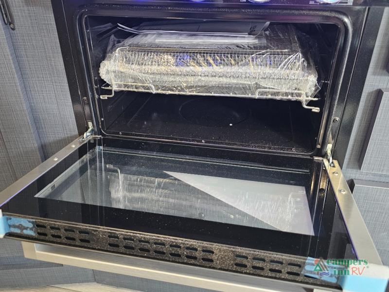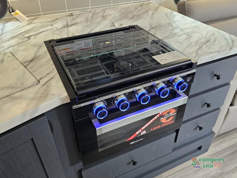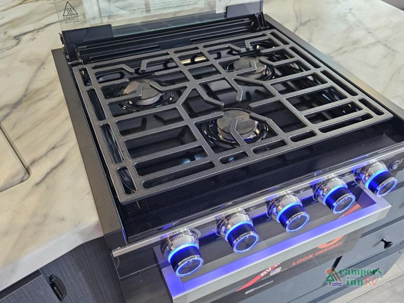 Fully equipped interior kitchen with three-burner cooktop, oven, microwave, and refrigerator