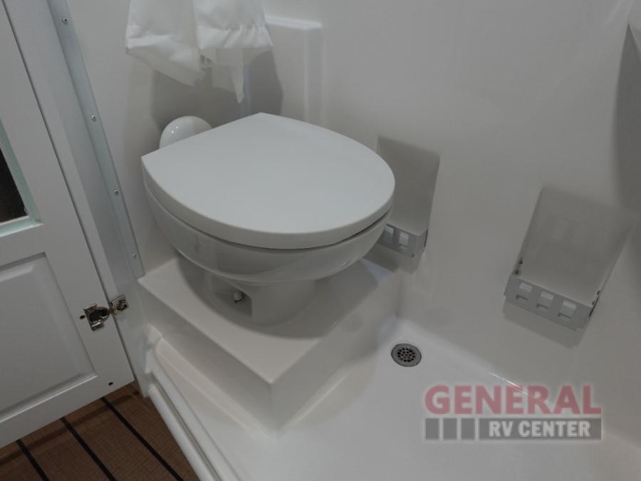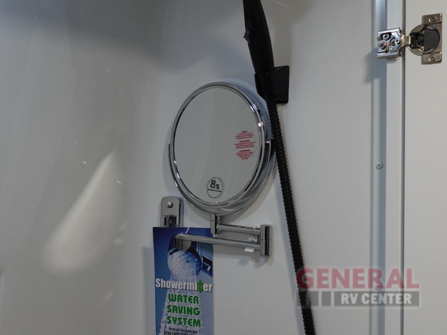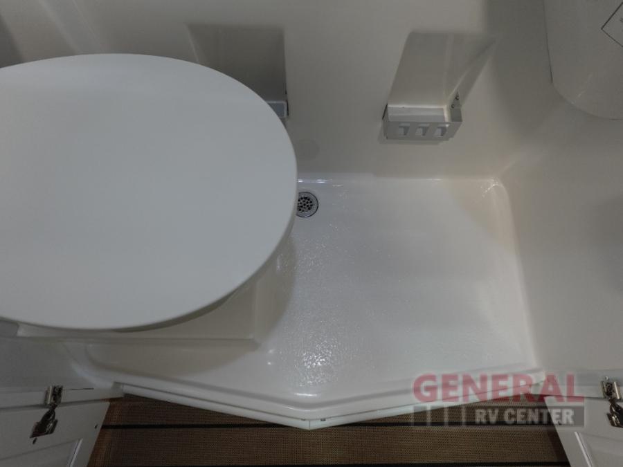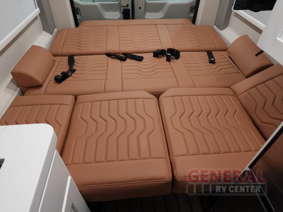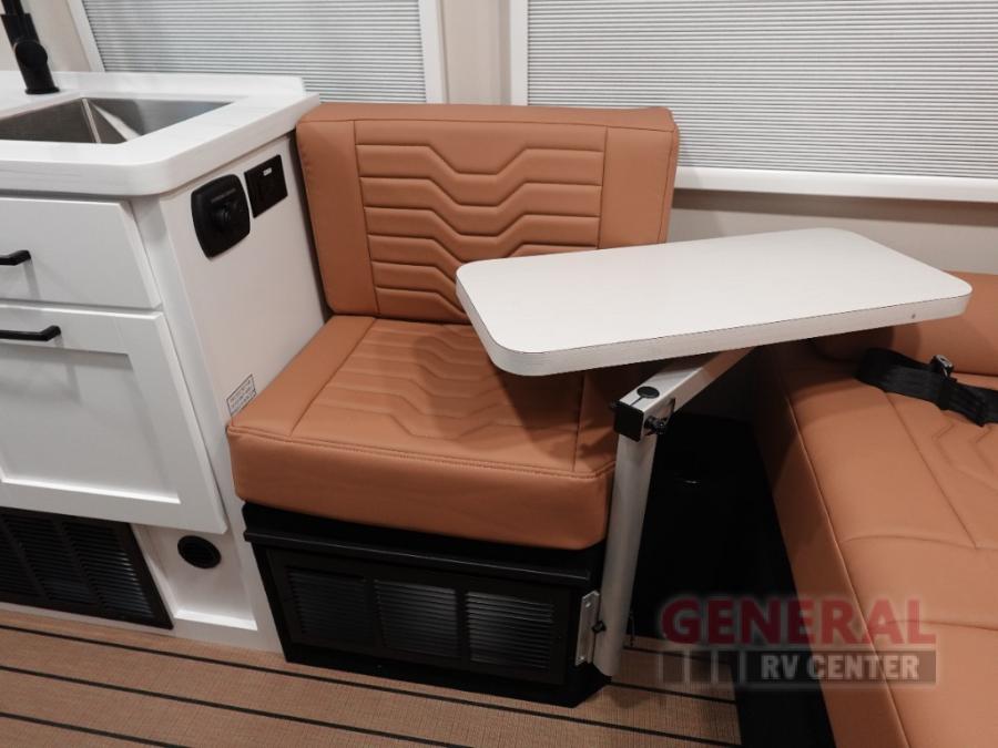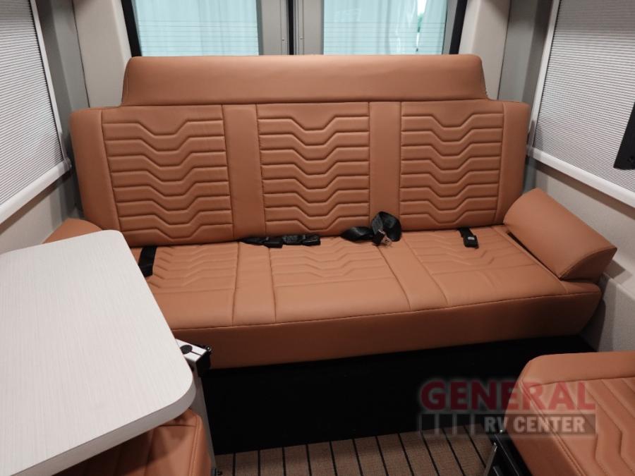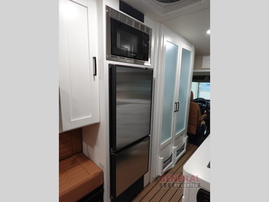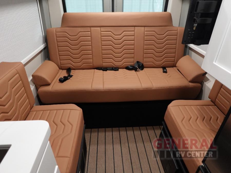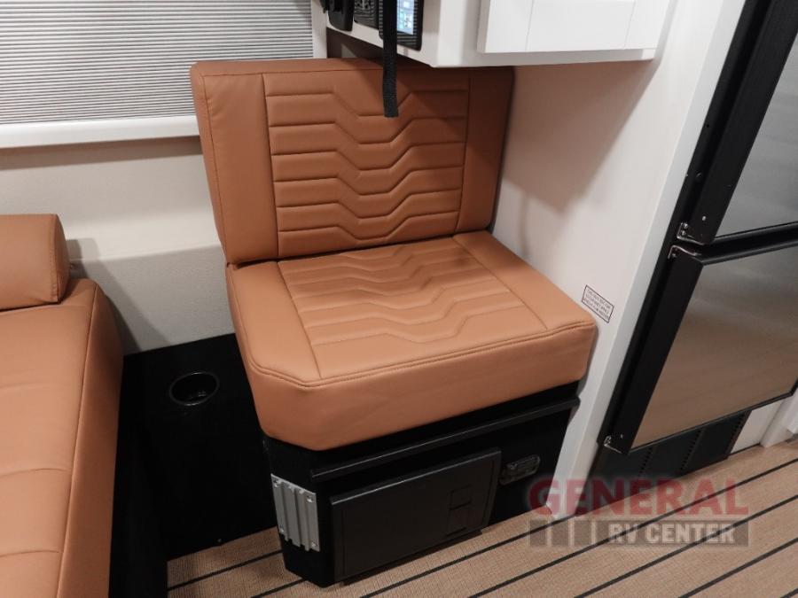 This all-wheel drive coach is perfect for trips near and far. Once you park, you can swivel the captain's seats around to enjoy lunch at the swivel table, and you can freshen up in the convenient wet bath before heading out to stretch your legs. There is an induction cooktop, a round sink, plus a Nova Kool compressor refrigerator for your perishables. The two jump seats and rear power sofa will convert to a comfortable bed at night, and the swivel table in between will allow you to play a game of cards before bed. And don't worry about storage space since this model includes overhead compartments and a wardrobe to keep your clothes wrinkle-free!
