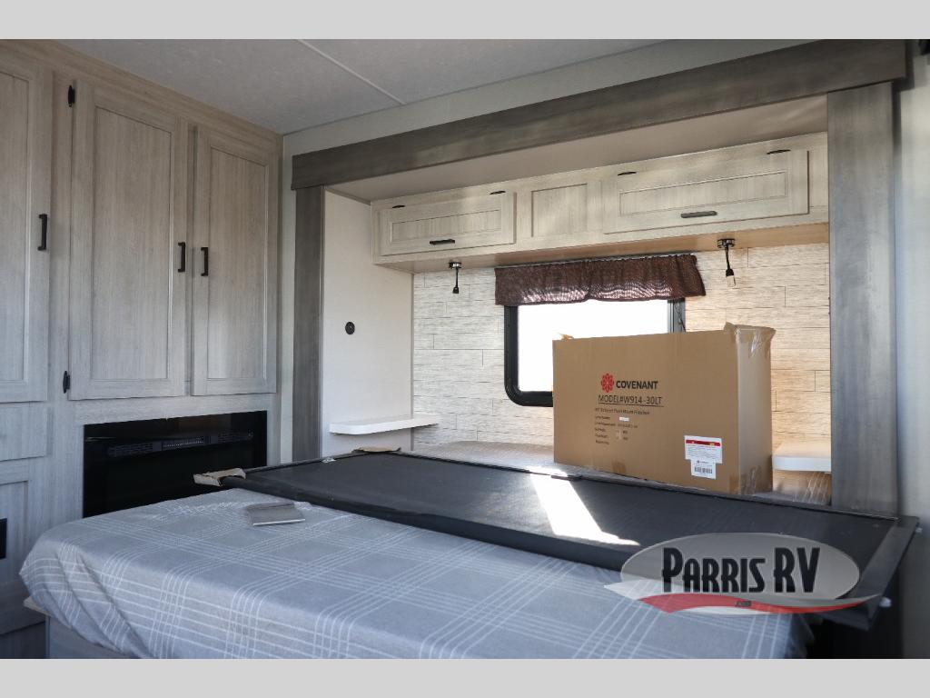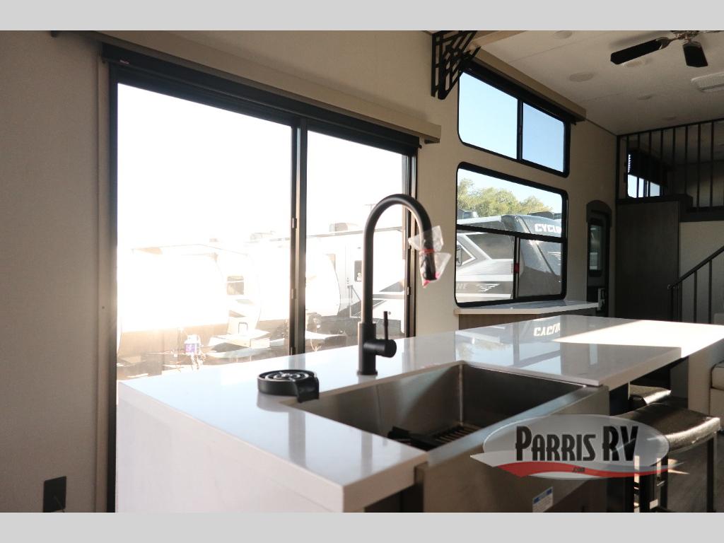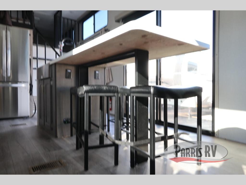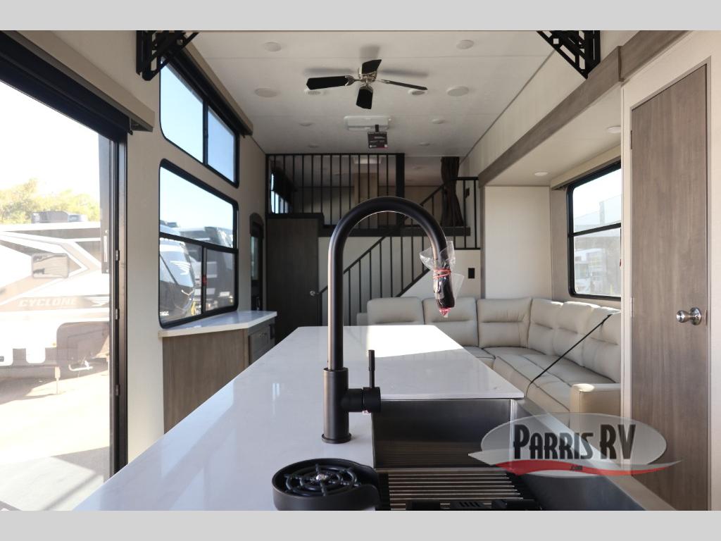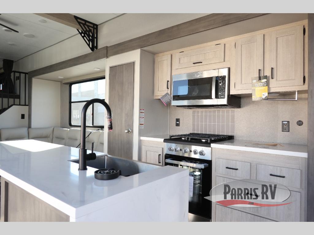 This unit with dual lofts and tons of sleeping space is ideal for a larger group! Lofts at either end of the unit overlook the living area and have a total of five bunk mats, with four 42" x 74" and one smaller 28" x 74". Downstairs there's a private bedroom with a queen bed and fireplace. The main living area has a huge hide-a-bed sectional sofa so you can fit even more guests, or just relax and watch the TV on the power lift in the entertainment center. The kitchen is well-equipped with a residential refrigerator, microwave, and pantry. The centerpiece here is a kitchen island with a deep basin farm-style sink and bar stool seating so your group can gather together and make new memories! The full bath in the rear has a roomy 48" x 30" shower with glass door, and a linen closet.