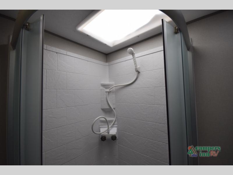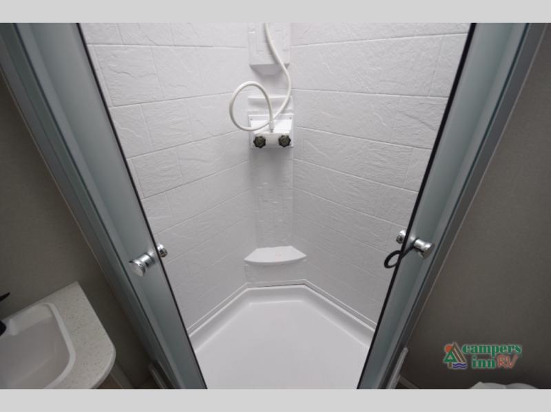 The rear bathroom includes a roomy 34" x 34" corner shower, plus extra space to move around and freshen up after a day of adventure.
