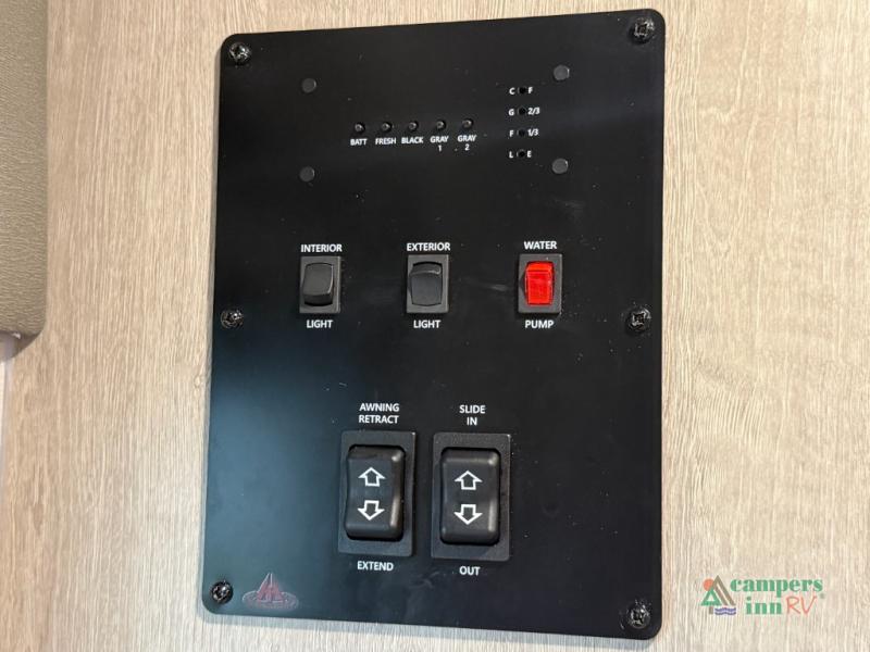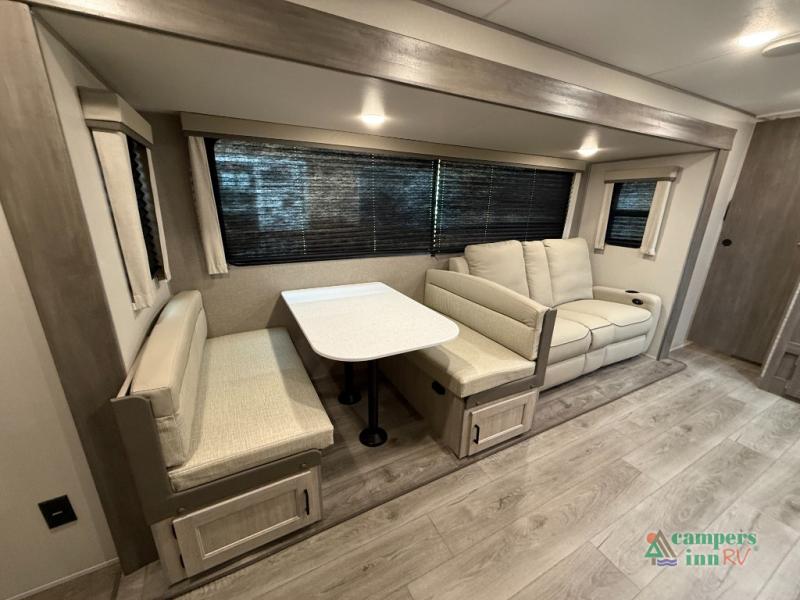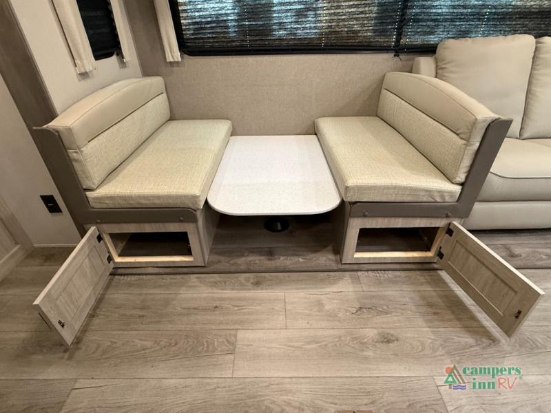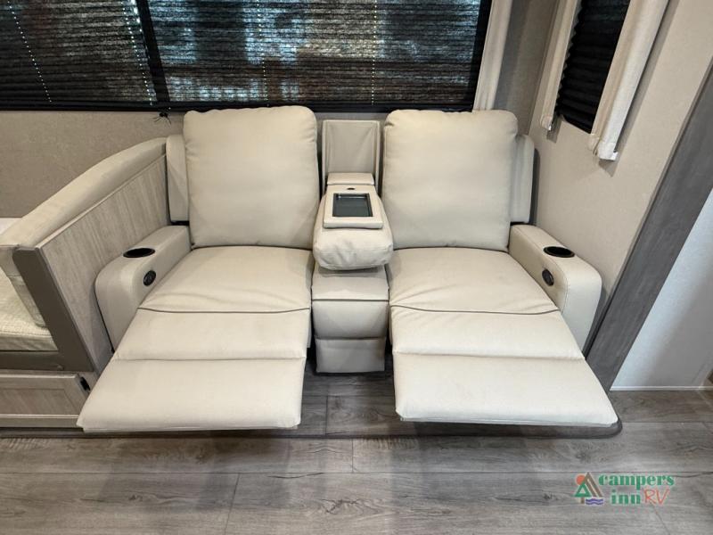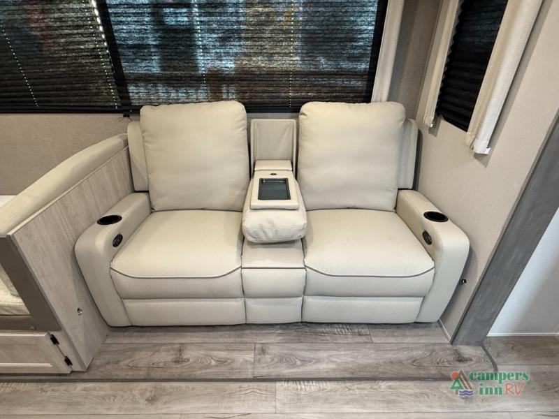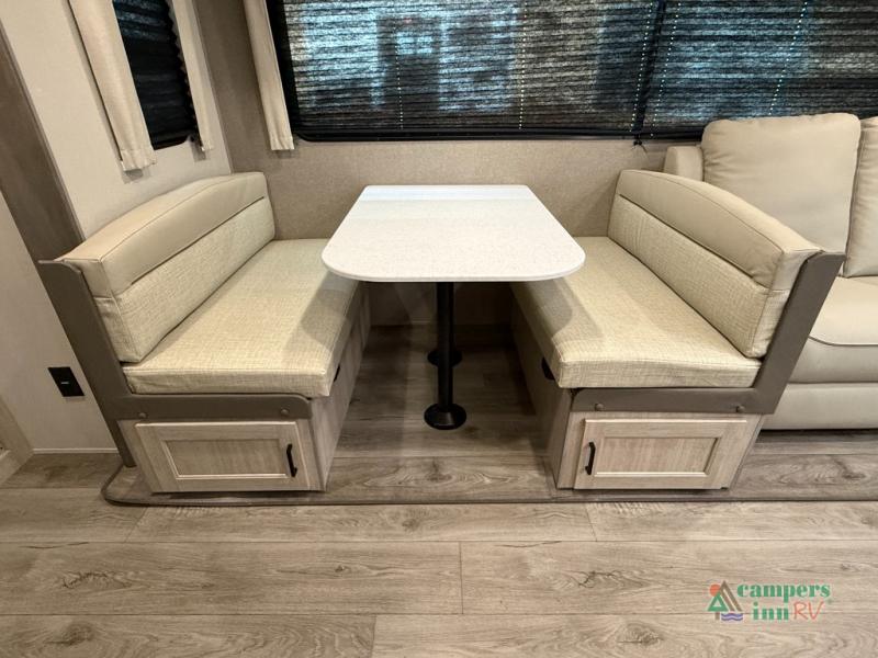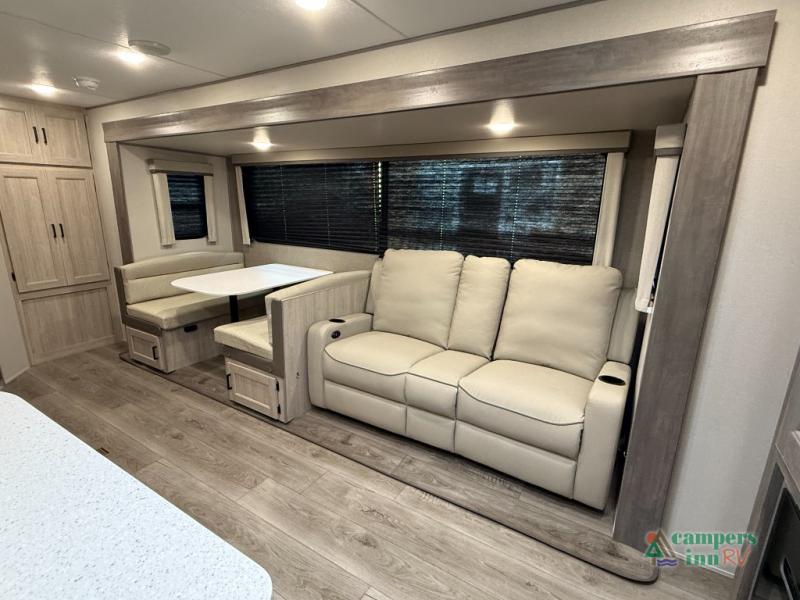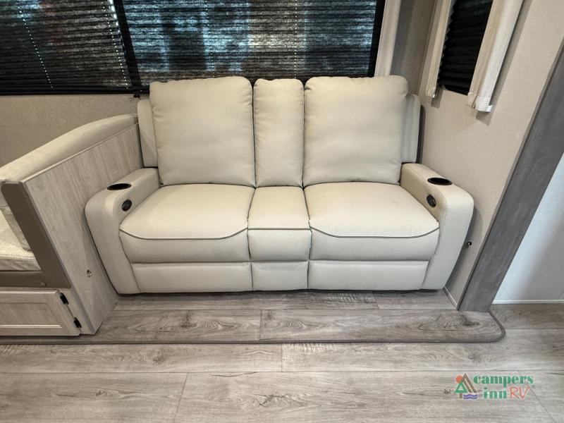 Large “super slide” in the living area that includes both a sofa and a dinette.