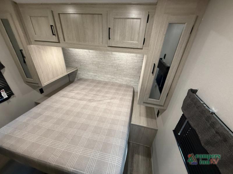 Private front bedroom with queen bed, nightstands, wardrobes, overhead storage.