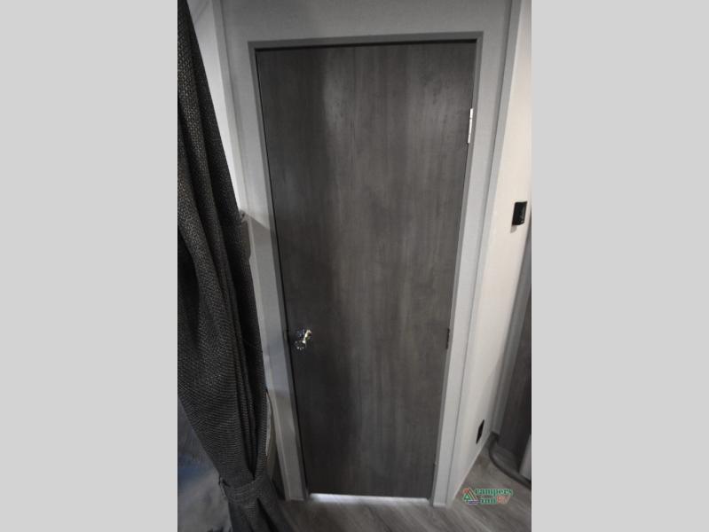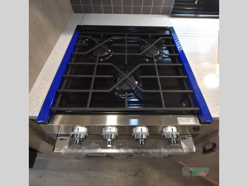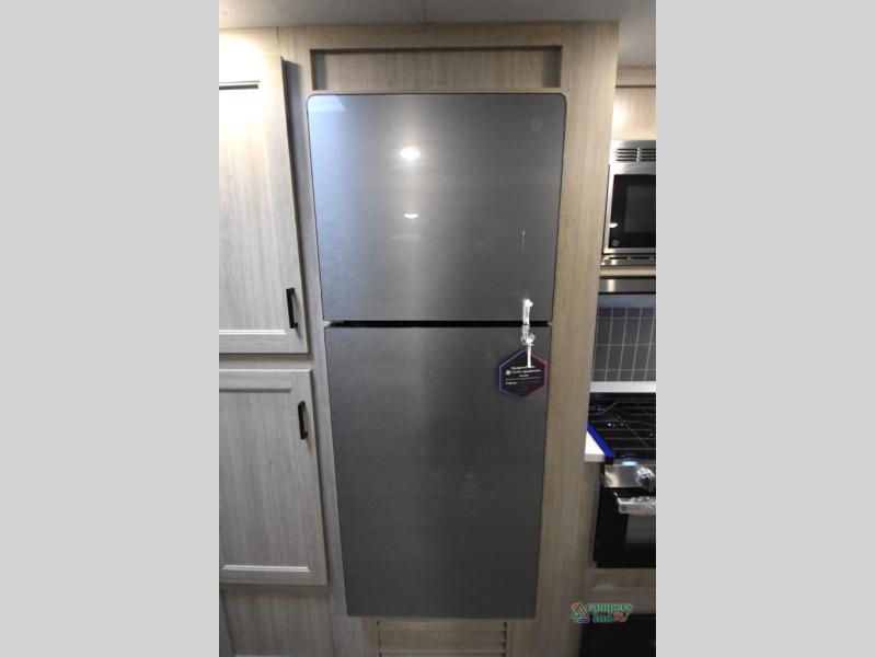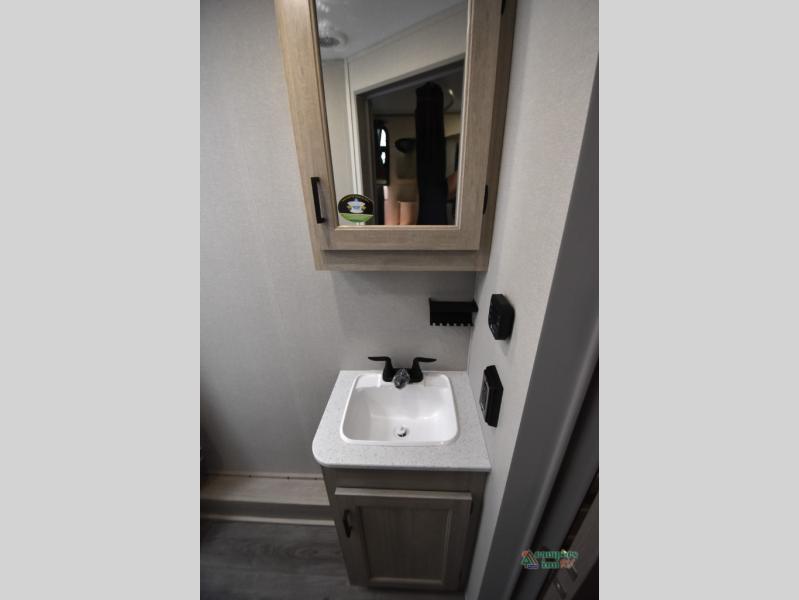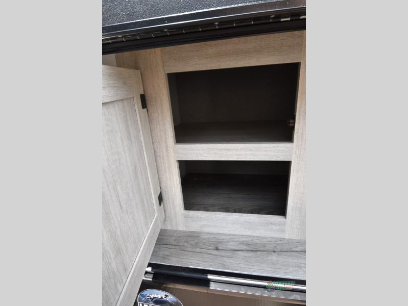 When you enjoy camping with your own accommodations and space for the whole crew, hitch this trailer up and head to the campgrounds! After loading everything easily thanks to the dual entry doors and all the interior and exterior storage, you will have no worries that you left anything behind. The electric awning is easy to set up, like the large slide out, and the awning offers multicolor LED lights to choose from by using the remote. When you are outside the cook might like to make a meal using the outside camper kitchen. The interior kitchen offers full amenities including a pantry, and everyone can enjoy the angled entertainment center. There are double-size bunks with a ladder for the kids and a walk-around queen bed for the owner to sleep on, plus furniture in the living area that doubles as additional sleeping space!