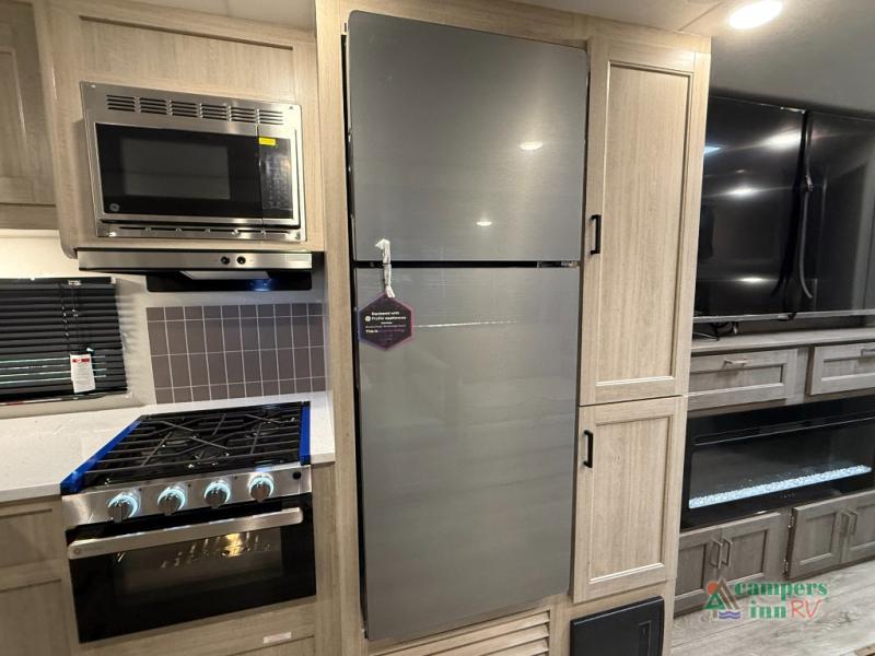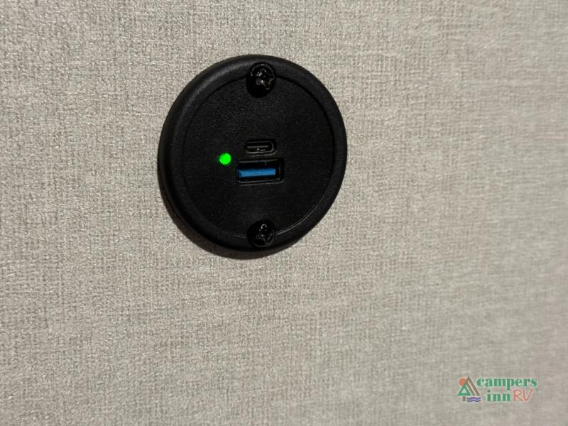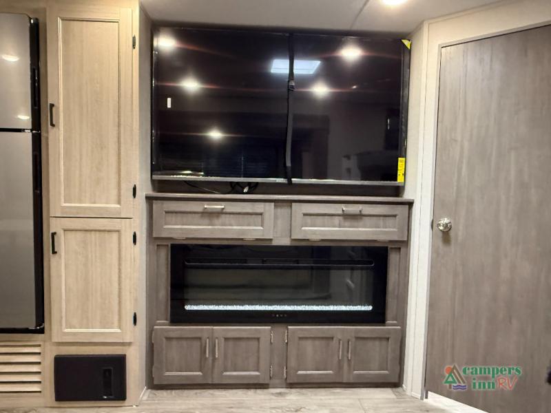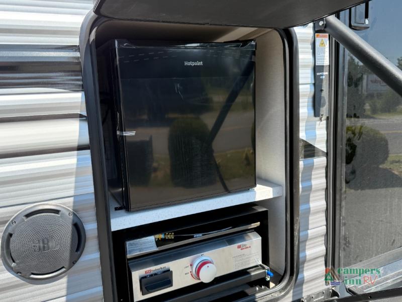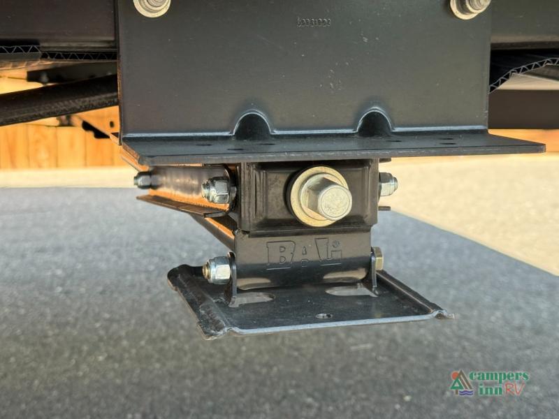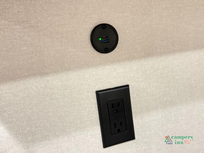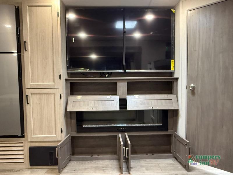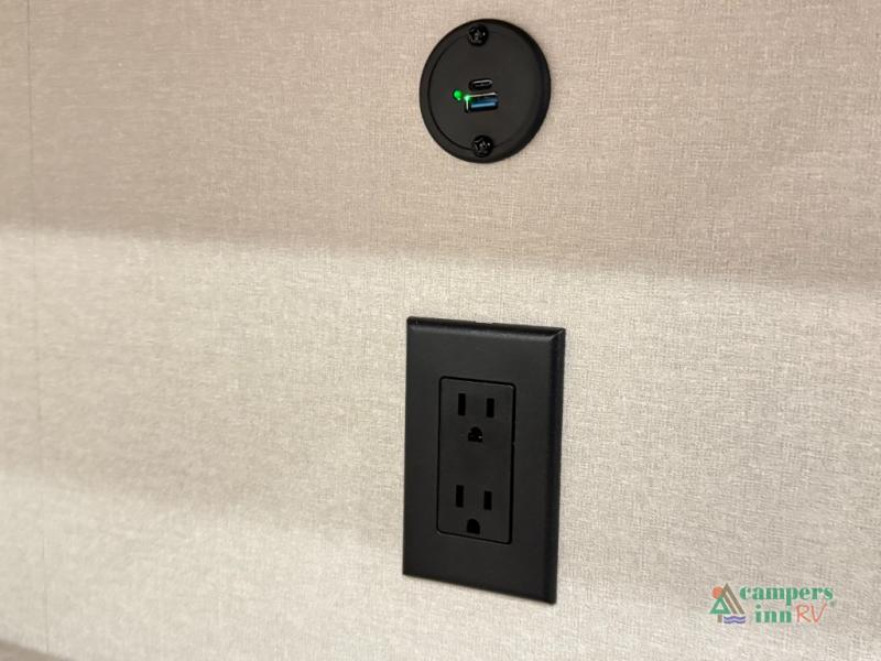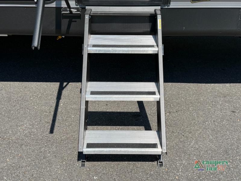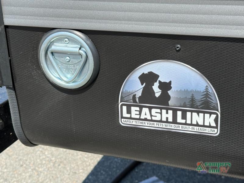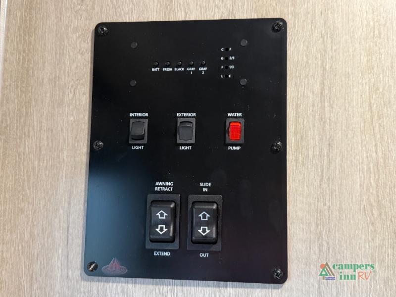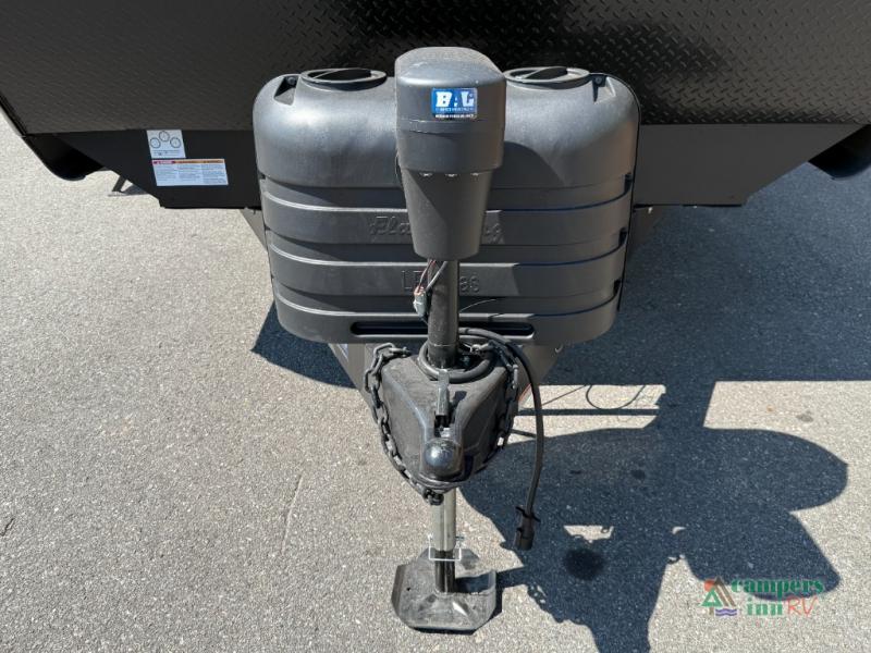Electric awning with multicolor LED strip, electric tongue jack, black tank flush, LP tank quick-connect, flip-down cargo rack(optional)—built for convenience