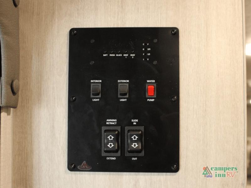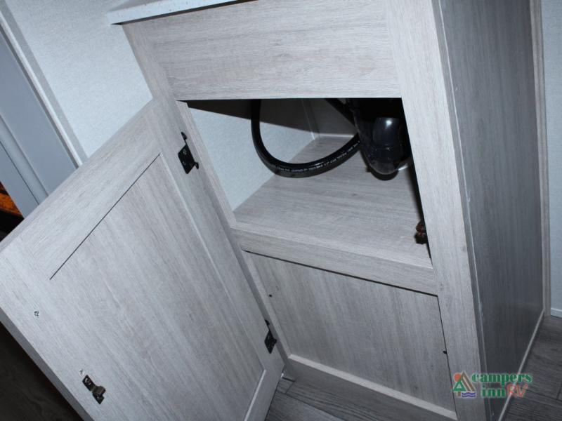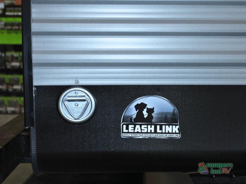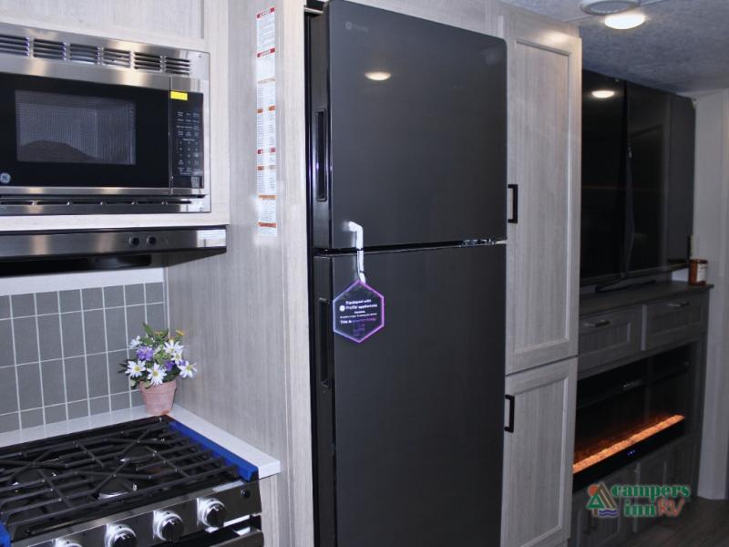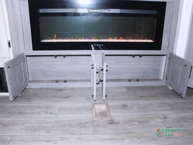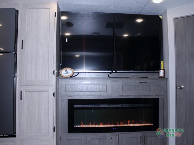 Enjoy more time outside with the 21' electric awning, complete with LED lighting for evening hangouts. The exterior camper kitchen includes a griddle and mini fridge—ideal for flipping pancakes or grilling burgers while staying connected to the action. Add in a TV hookup, pass-thru storage, and a fold-down table, and you’ve got a fully functional outdoor entertainment zone.
