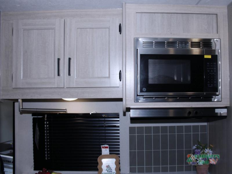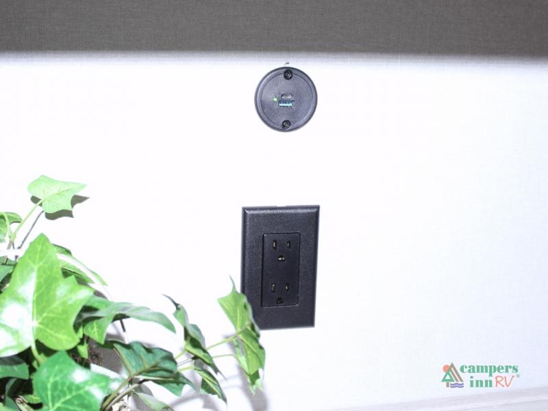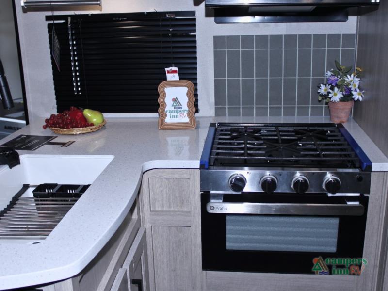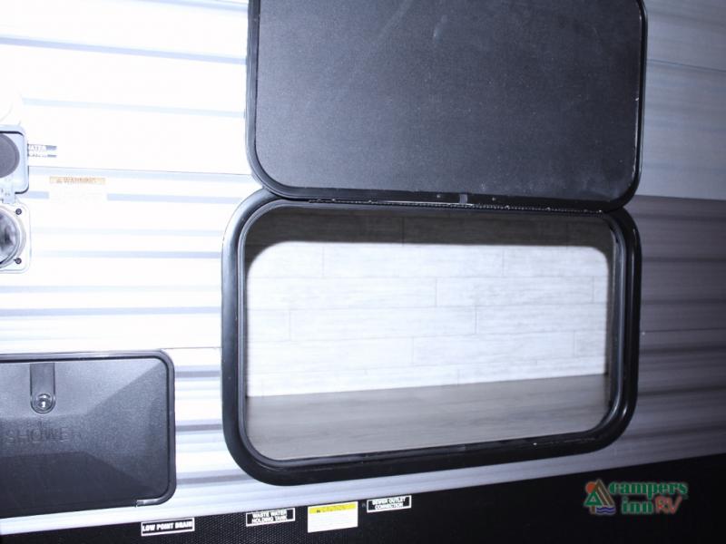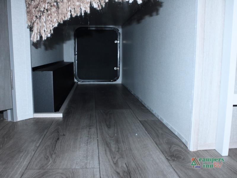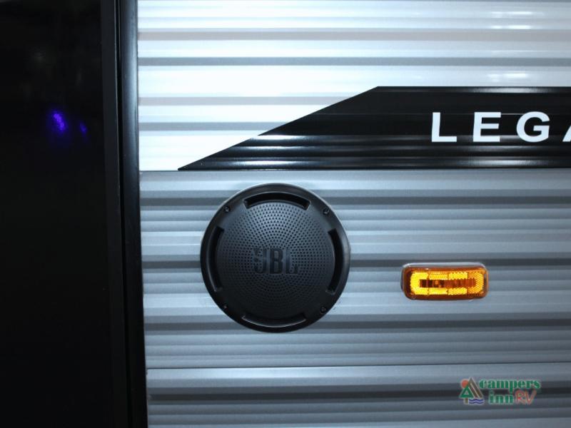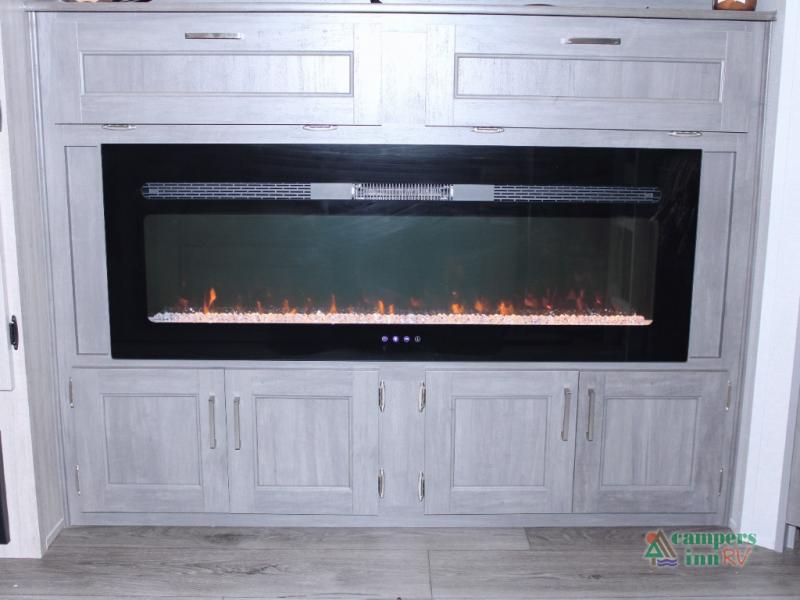 Enjoy more time outside with the 21' electric awning, complete with LED lighting for evening hangouts. The exterior camper kitchen includes a griddle and mini fridge—ideal for flipping pancakes or grilling burgers while staying connected to the action. Add in a TV hookup, pass-thru storage, and a fold-down table, and you’ve got a fully functional outdoor entertainment zone.
