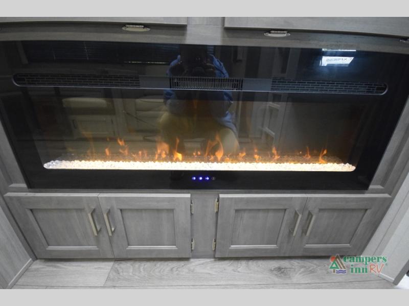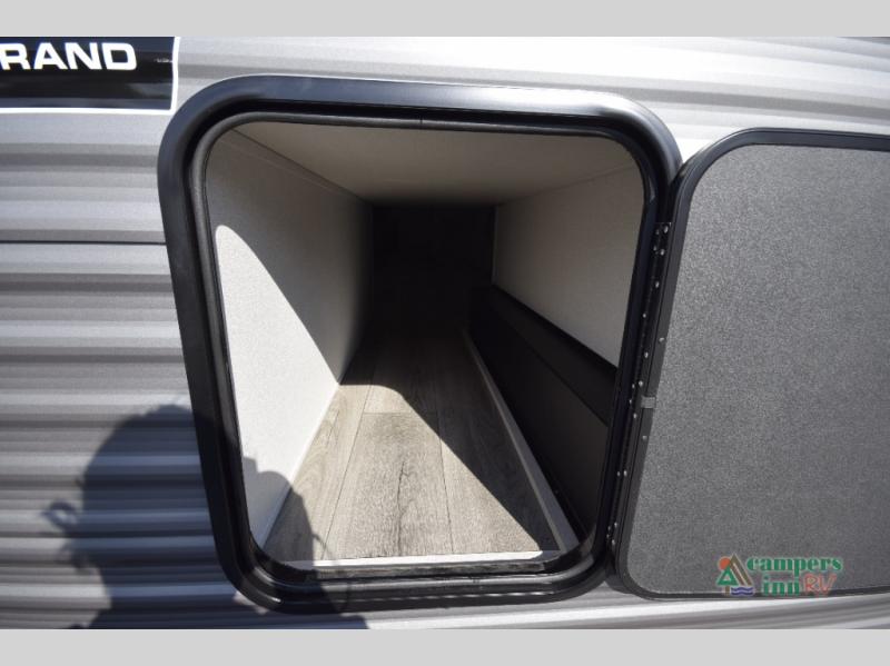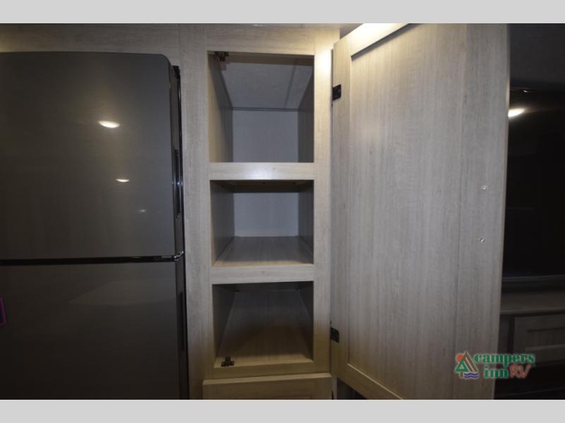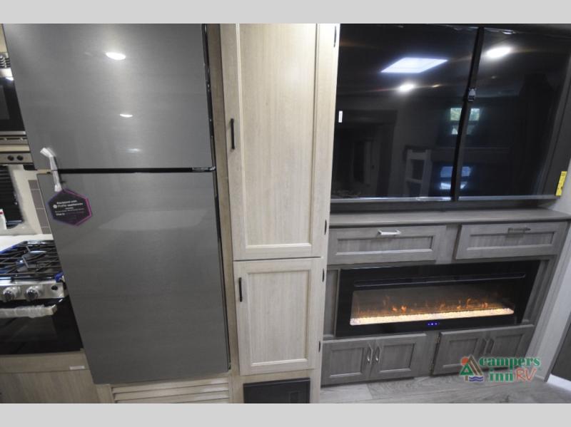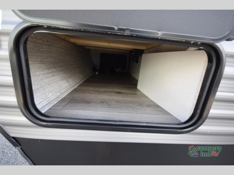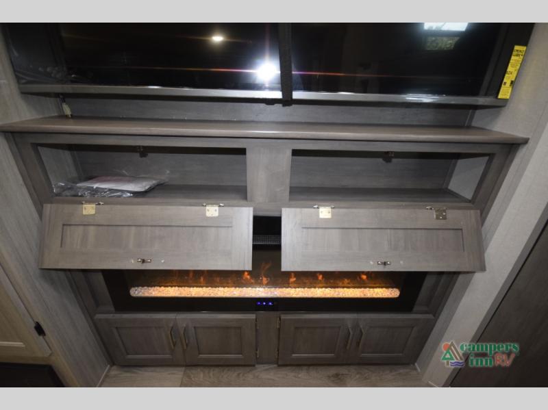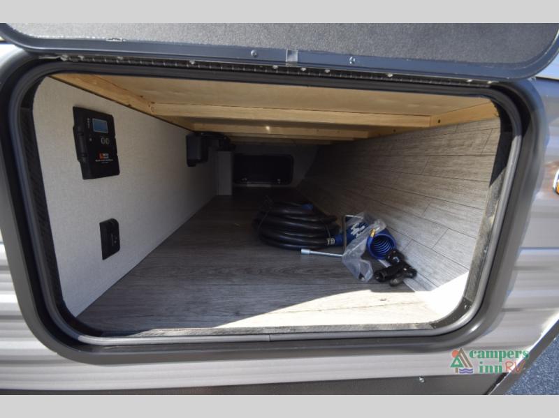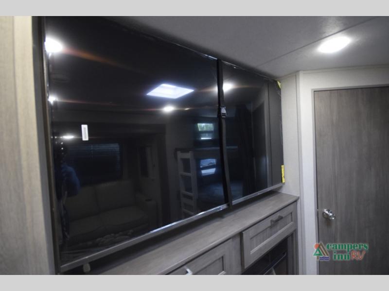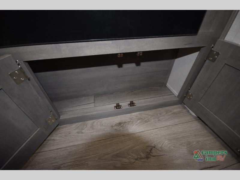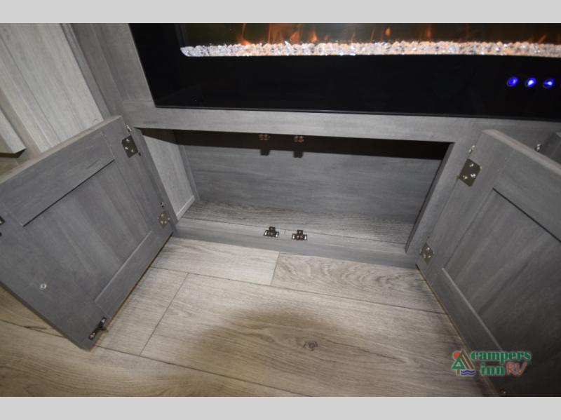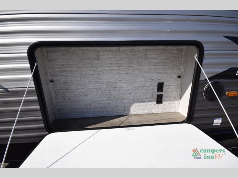Start your camping experience outside under the 21' electric awning with LED lighting, where you can fire up the exterior camper kitchen—complete with a griddle and mini fridge—for quick meals without missing the action. There’s also a pass-through storage compartment, fold-down table, and TV hookup, perfect for tailgating or evening movie nights under the stars.
