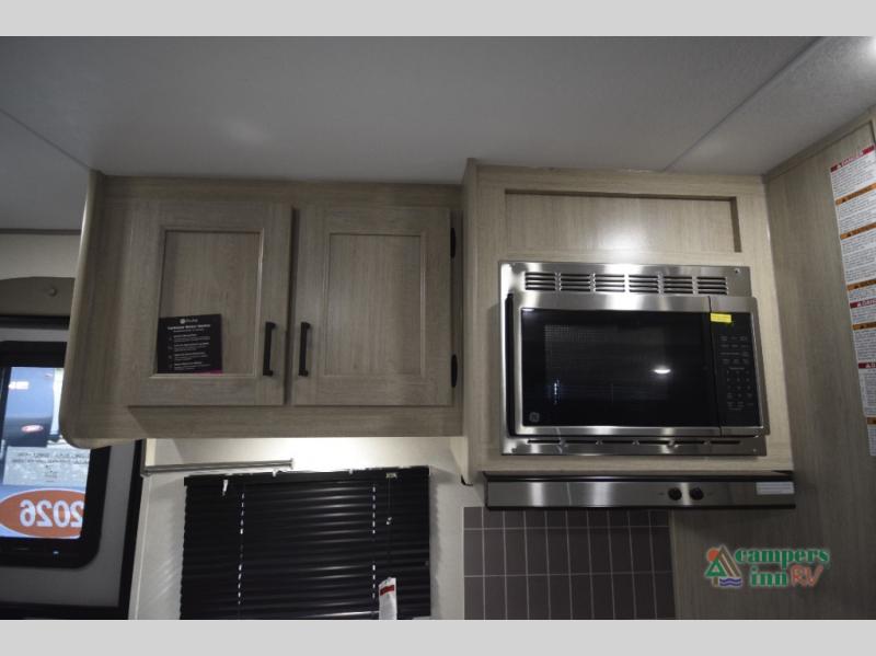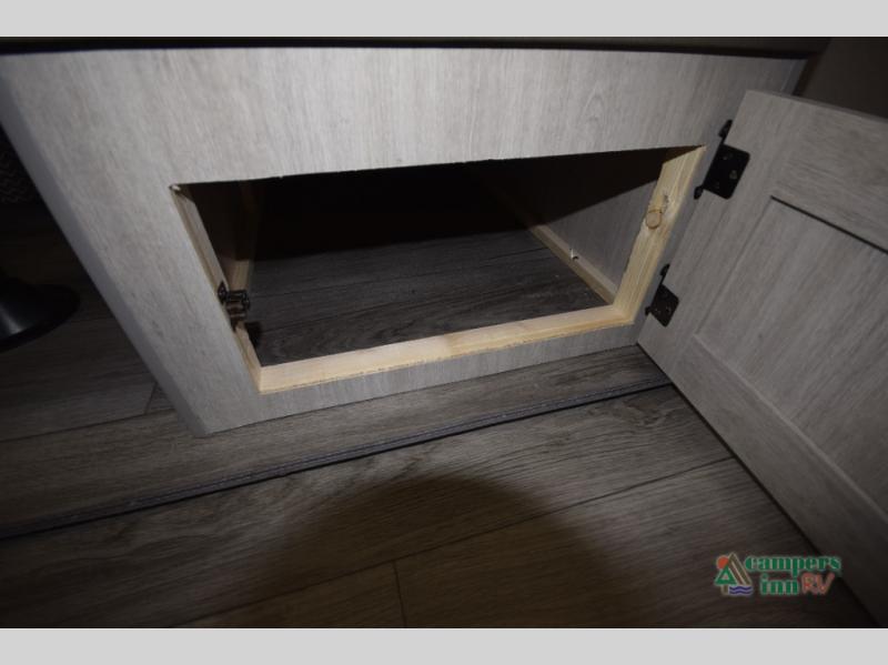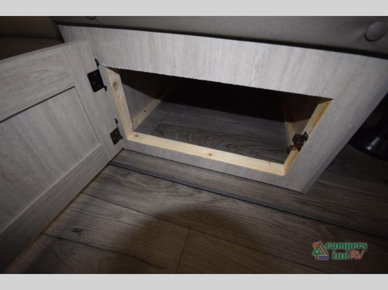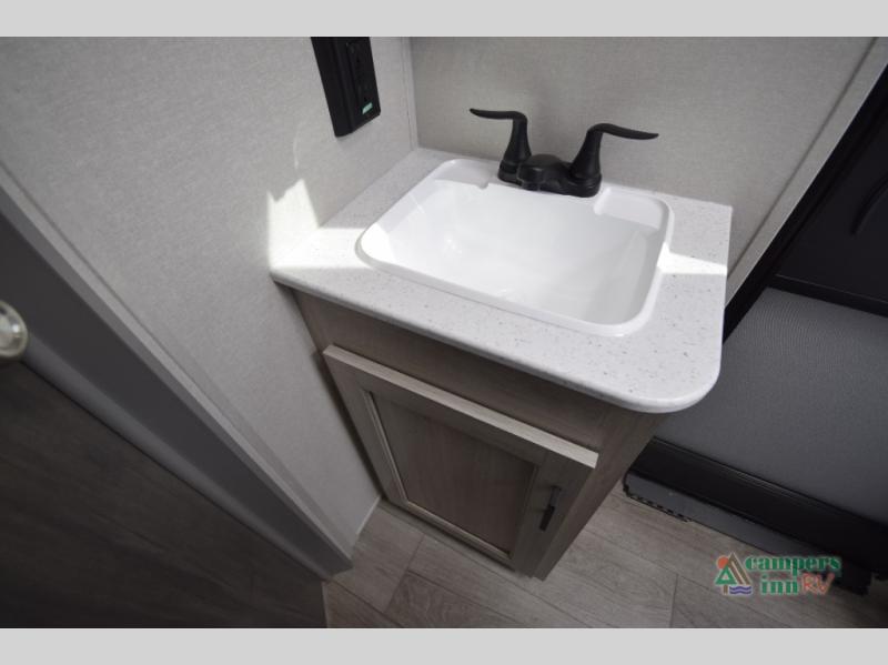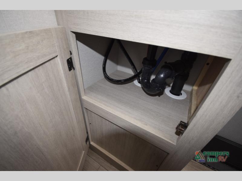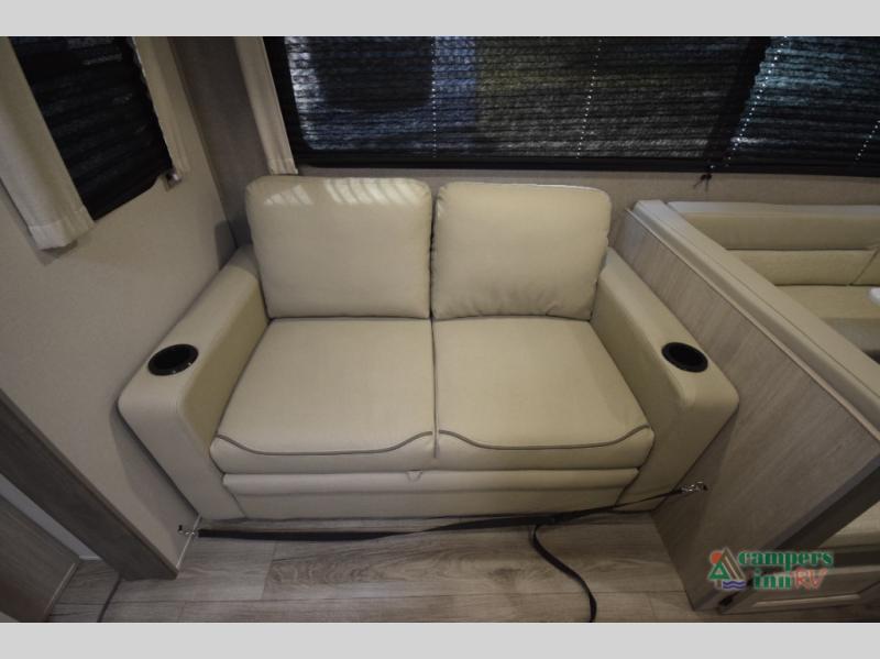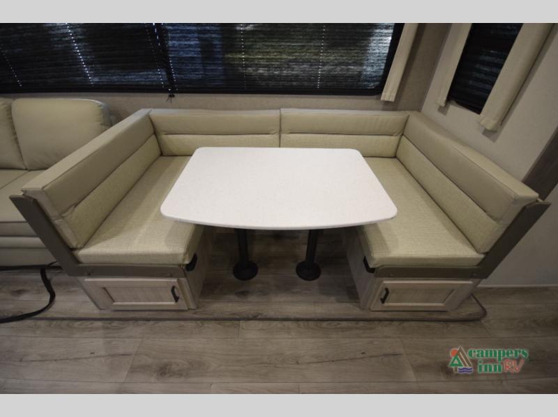 Step inside and feel the space open up thanks to the large slide-out that houses a roomy U-shaped dinette and a versatile trundle sofa—ideal for lounging by day and sleeping by night. The panoramic picture window floods the living area with natural light and lets you soak in the views wherever you camp.