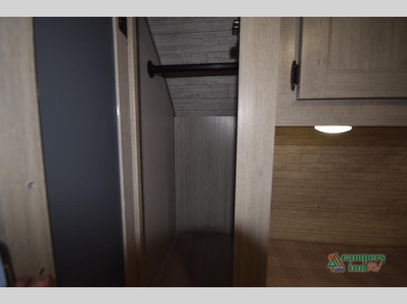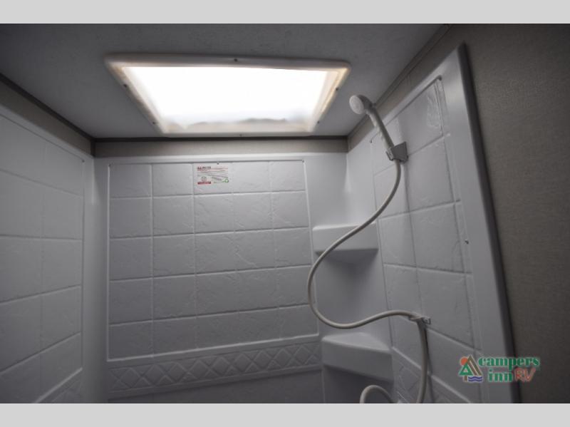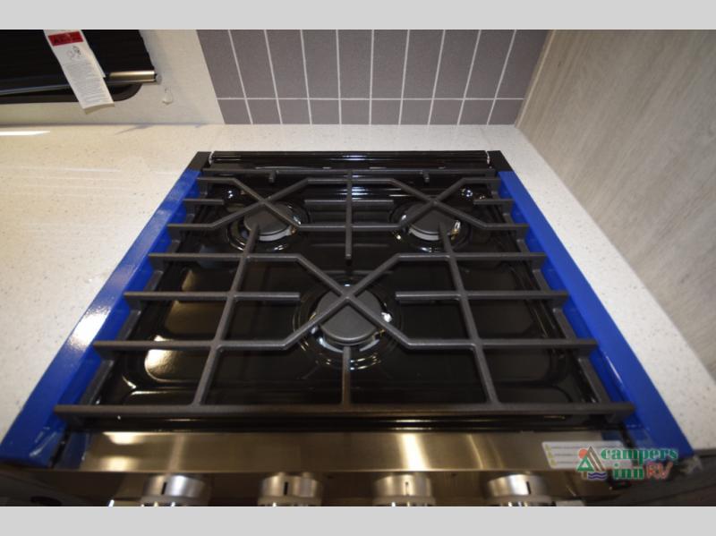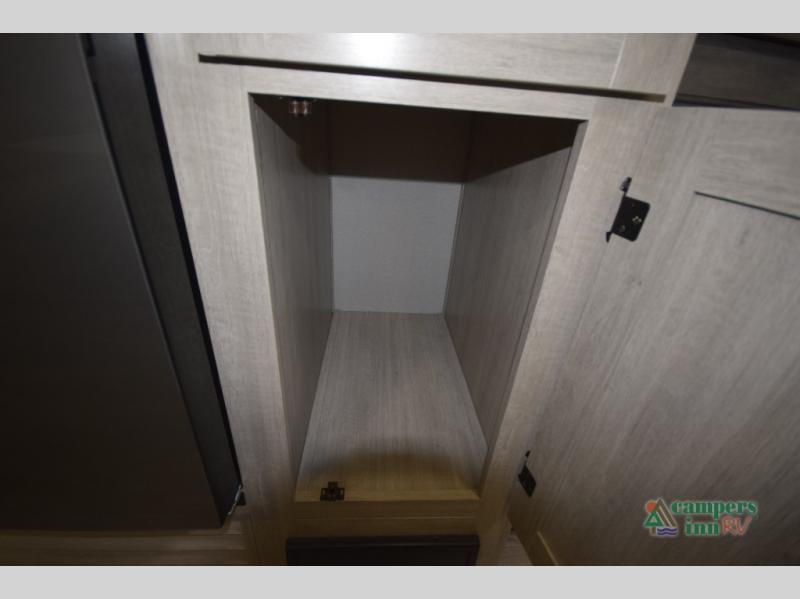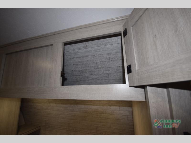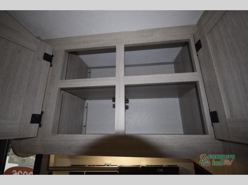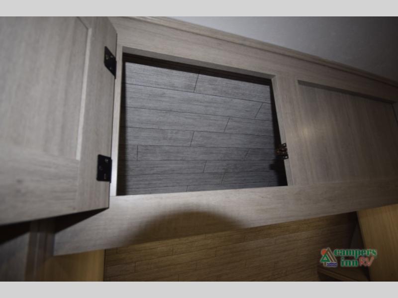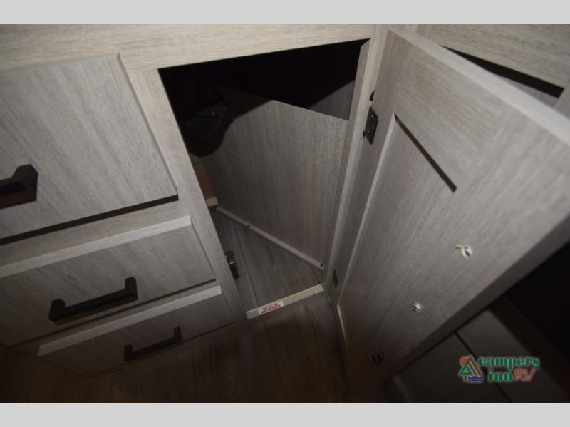 Step inside and feel the space open up thanks to the large slide-out that houses a roomy U-shaped dinette and a versatile trundle sofa—ideal for lounging by day and sleeping by night. The panoramic picture window floods the living area with natural light and lets you soak in the views wherever you camp.