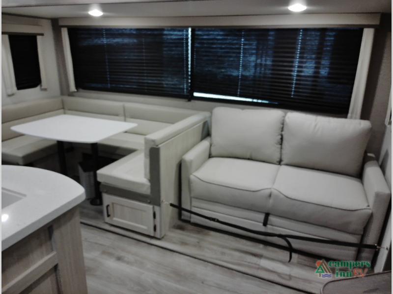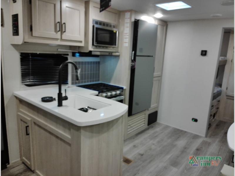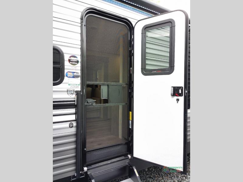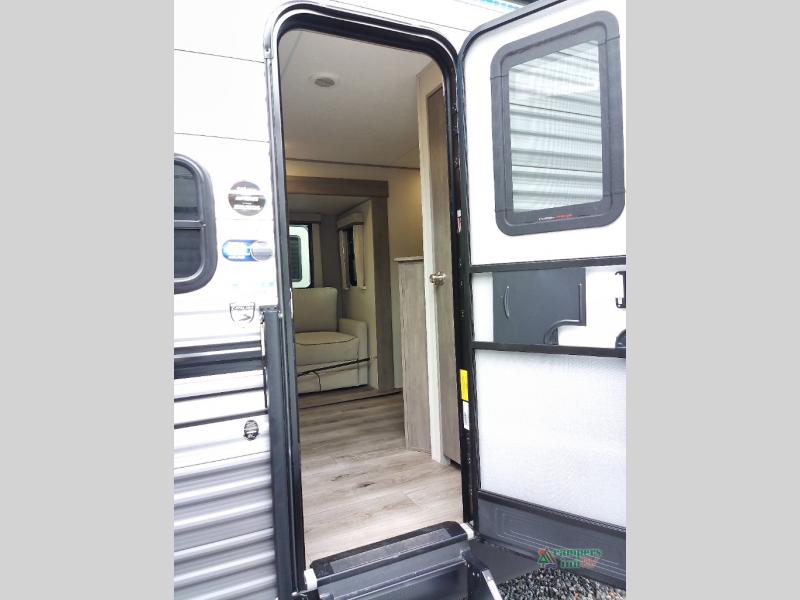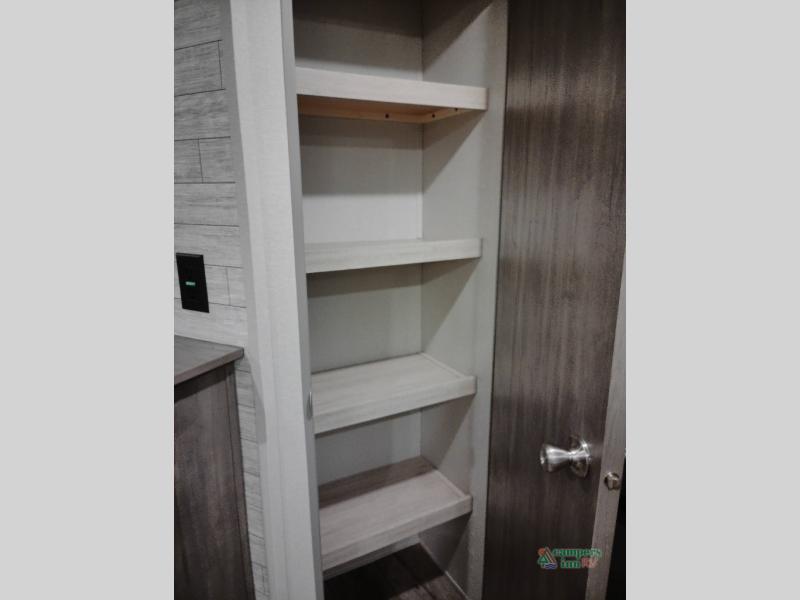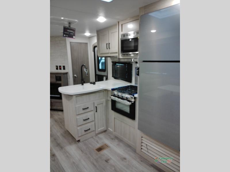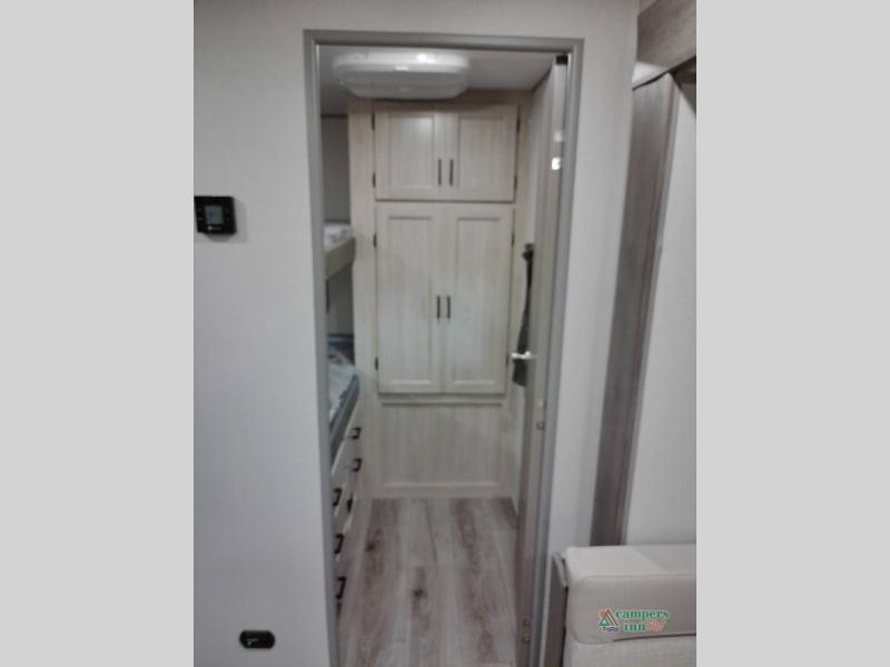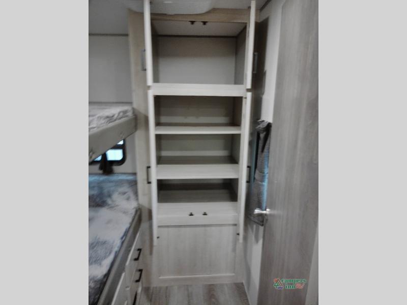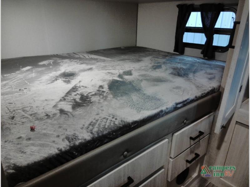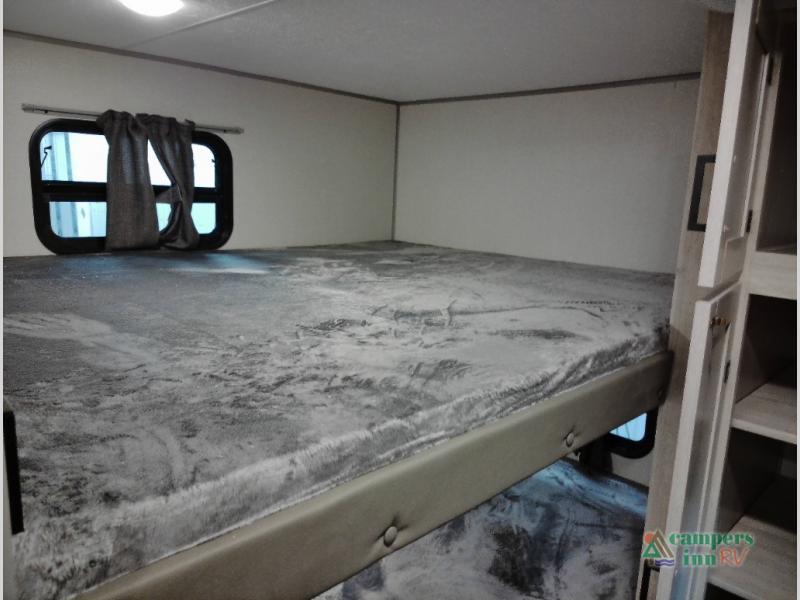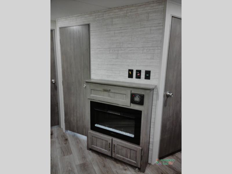 Not only will you be comfortable in this trailer, your friends will have comfort and privacy thanks to having their own bunkhouse with queen-size bunk beds, underbed storage, and a linen closet for clean clothes! The front master bedroom includes a walk-around queen bed, dual wardrobes, plus quick access to the dual entry bath! The combined living and kitchen is spacious thanks to the slide out U-shaped dinette and sofa with drink holders. You can even add the fireplace option if you want that feature. The cook will have full amenities to whip up meals including overhead cabinets for dishes and snacks, plus an outdoor camper kitchen with a pull-out griddle, a cabinet, and a refrigerator!