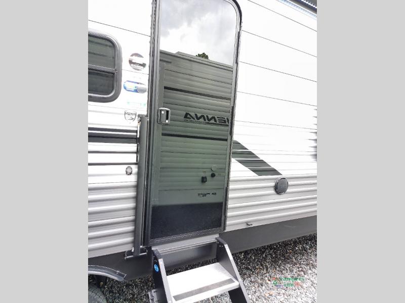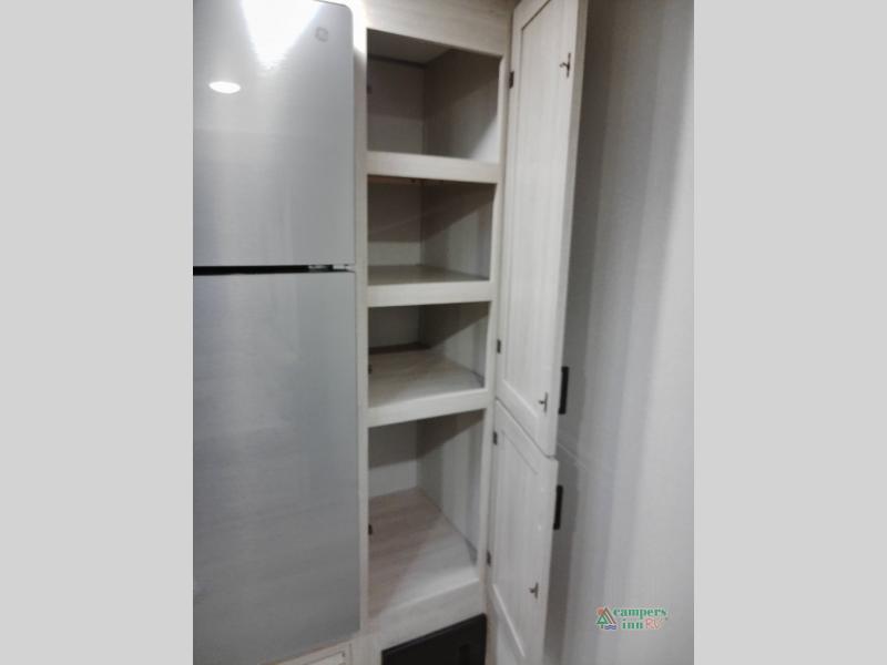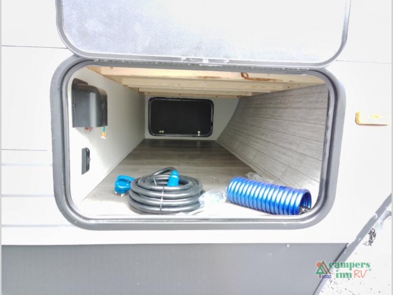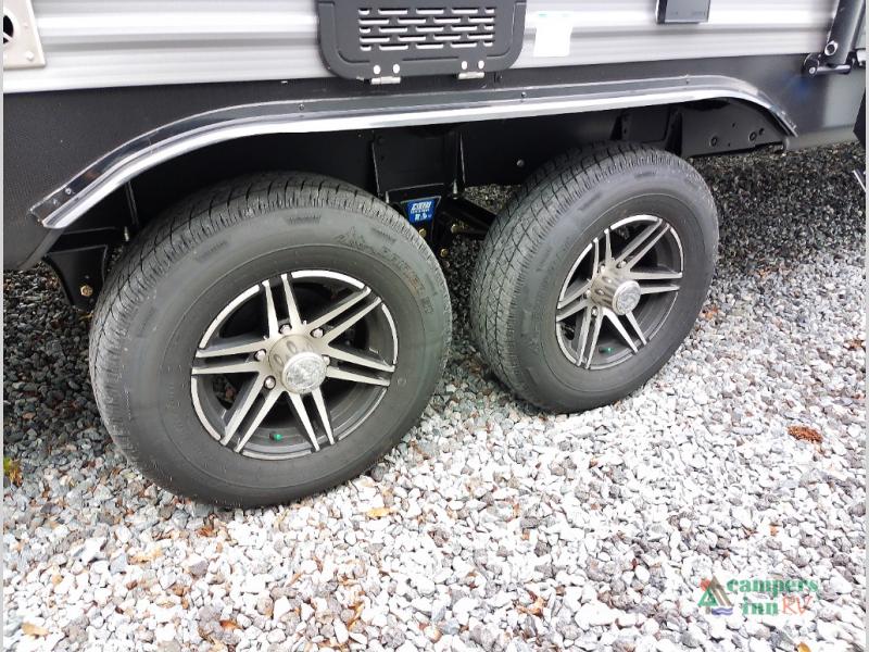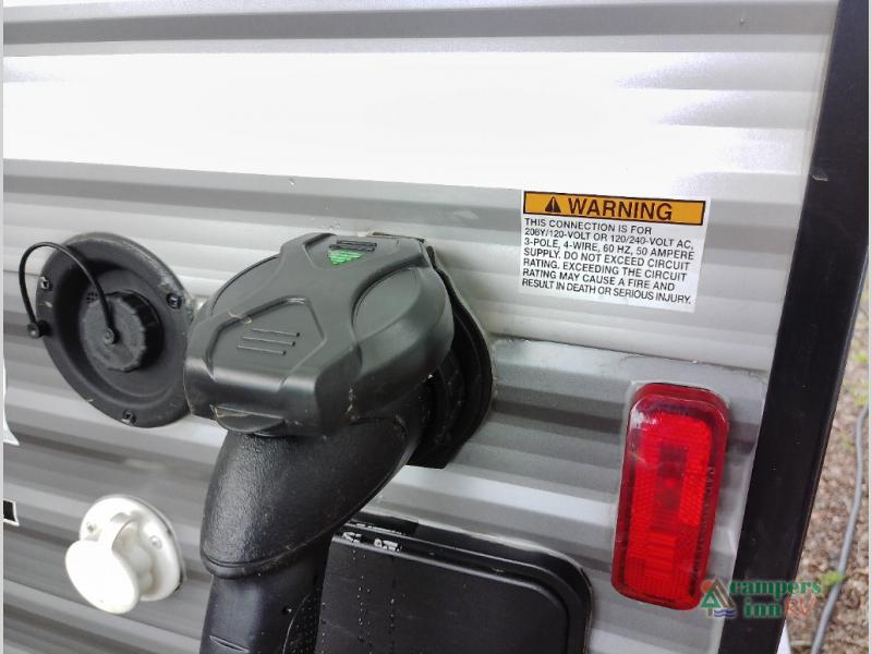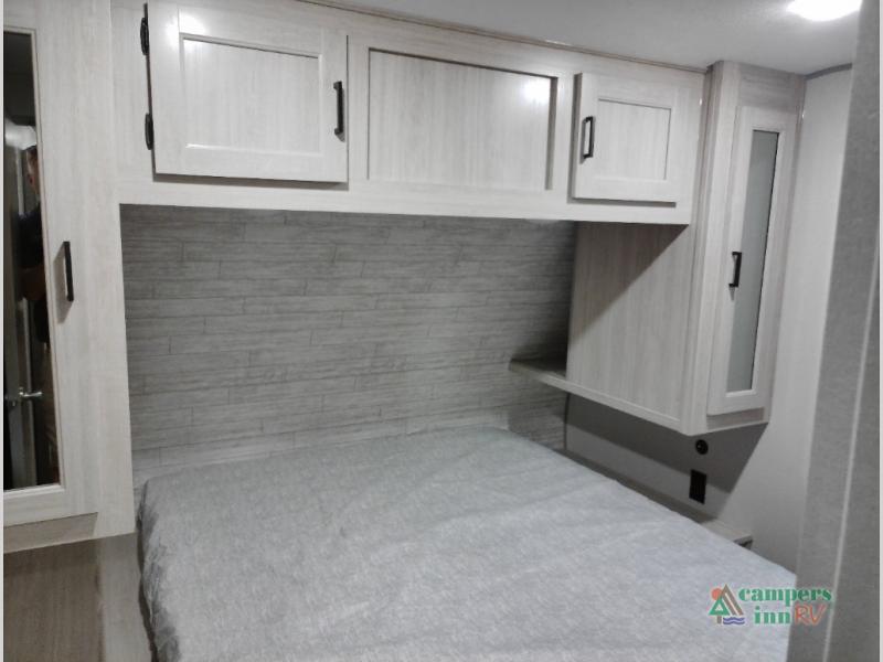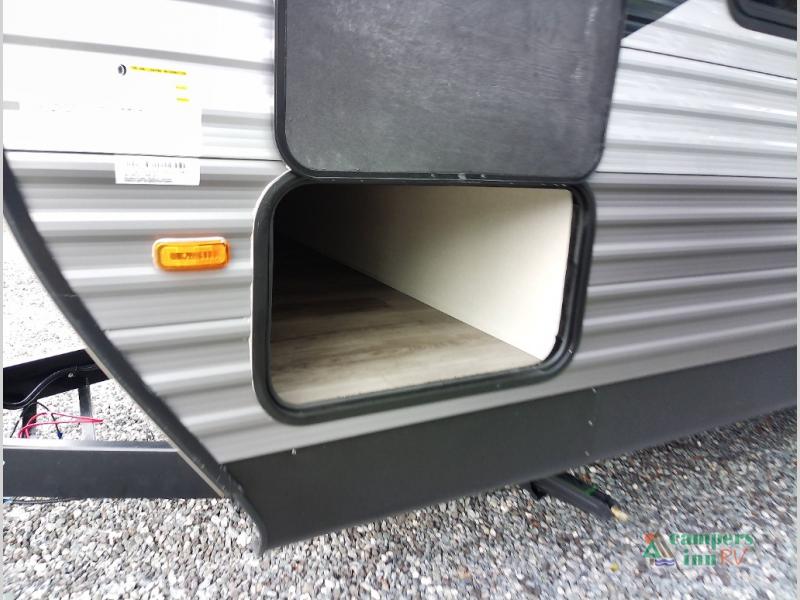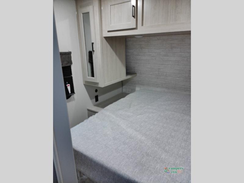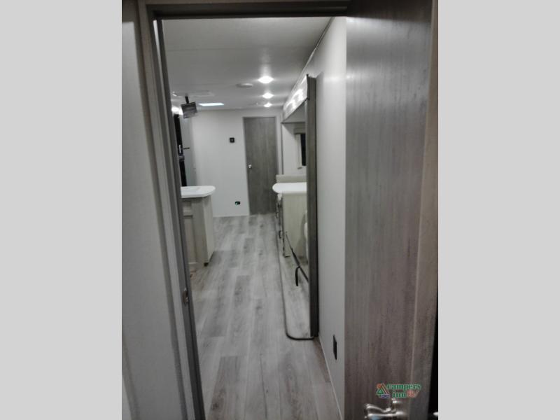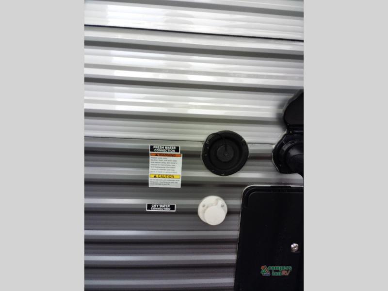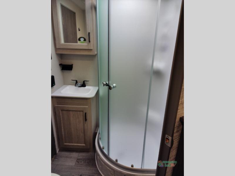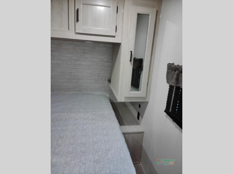 Not only will you be comfortable in this trailer, your friends will have comfort and privacy thanks to having their own bunkhouse with queen-size bunk beds, underbed storage, and a linen closet for clean clothes! The front master bedroom includes a walk-around queen bed, dual wardrobes, plus quick access to the dual entry bath! The combined living and kitchen is spacious thanks to the slide out U-shaped dinette and sofa with drink holders. You can even add the fireplace option if you want that feature. The cook will have full amenities to whip up meals including overhead cabinets for dishes and snacks, plus an outdoor camper kitchen with a pull-out griddle, a cabinet, and a refrigerator!