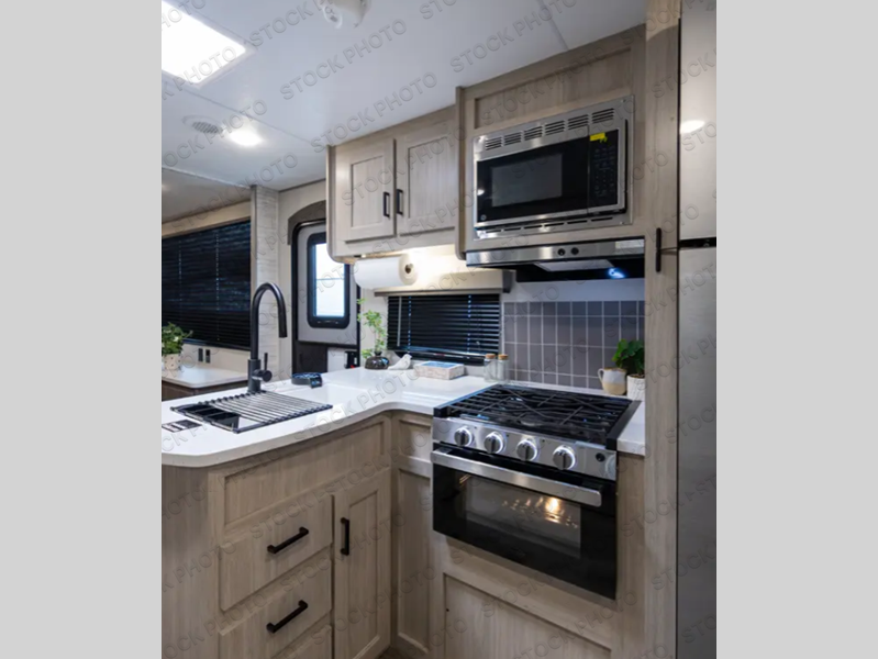 This family-friendly trailer offers lots of floor space thanks to the triple slides throughout! You and your family will love the combined living and kitchen area with a slide out booth dinette and a sofa with drink holders. The L-shaped kitchen counter allows the cook to make meals without moving for anyone trying to get to the full bathroom or the rear bunkhouse. The kids will have their own privacy, two bunk beds, a jack knife sofa with storage totes below plus a TV/wardrobe cabinet. The front private bedroom allows you to sleep like royalty and offers a large closet for your clothing and another closet prepped for a washer/dryer. And don't forget about the full-size camper kitchen and the 21' power awning with multicolor LED lights when you are outside.