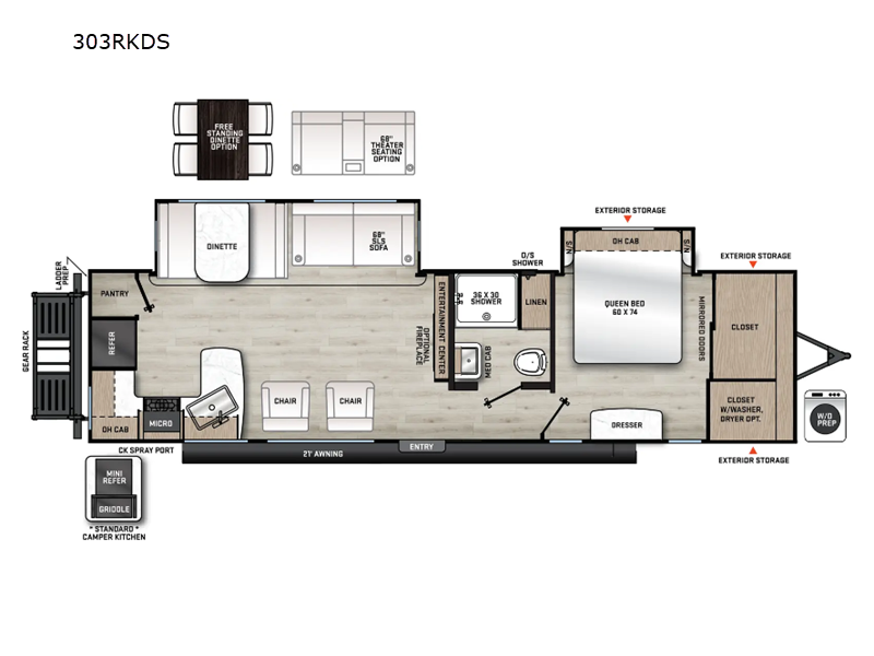 Enjoy relaxing under the 21' electric awning during the daytime for some protection from the sun, and at night with multicolor LED lights to set the mood for the evening. You can store beverages in the exterior mini fridge for convenience, and there is exterior storage for outdoor games and such. The interior is spacious with a large slide out booth dinette and sofa with drink holders, yet you might like to choose the free standing dinette option in place of the booth dinette. There is also a fireplace option under the entertainment center for a more cozy feel. The two recliner lounges are sure to be a favorite spot, and the cook will love the rear kitchen including the U-shaped counter when preparing meals and drying the dishes. The front bedroom features a queen bed slide, a large closet and a dresser, plus second closet with washer and dryer prep.