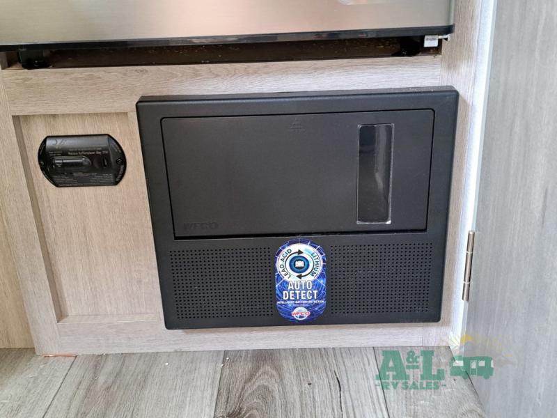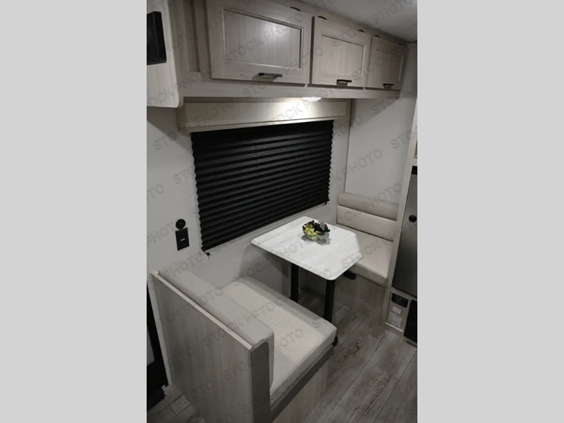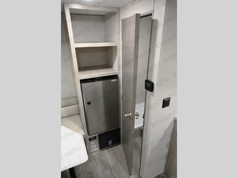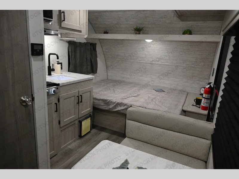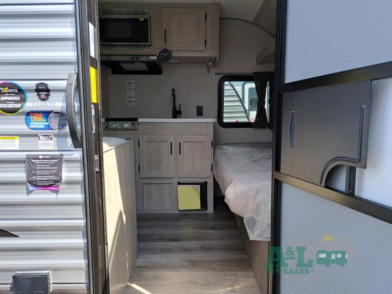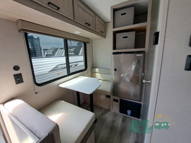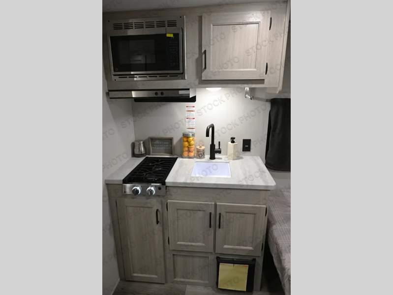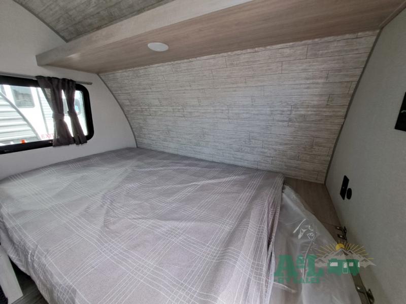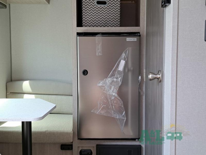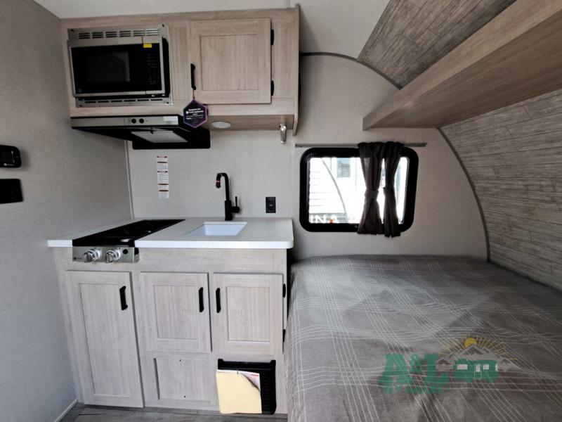 Lightweight camping is easier than you think with this travel trailer in tow! The front 54" x 74" queen bed will provide a great night's rest each night, while your overnight guest takes the booth dinette. There is a handy shelf above the front bed for your belongings plus additional bedroom storage. A private bath includes a 24" x 32" shower and a toilet with a mirror behind it so you can freshen up each day. You'll also find a two burner cooktop and microwave oven to make meals each day plus a 3.3 cu. ft. 12V refrigerator for food storage!