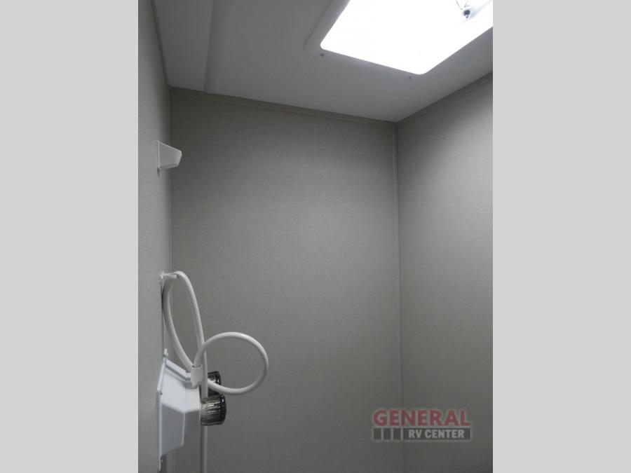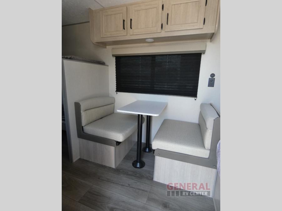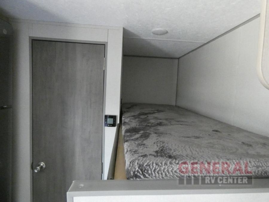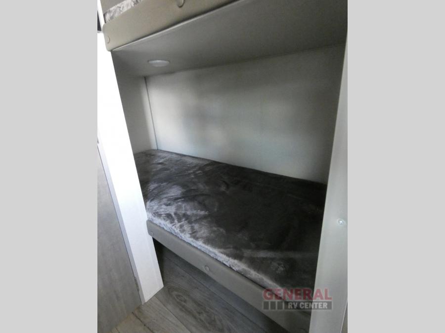 This travel trailers is perfect for a young family or smaller group. You can easily sleep four or more with the rear set of bunk beds and queen bed up front. There is also a 60" sofa for inside down-time, as well as complete kitchen and bath amenities so you can cook and stay clean while traveling. The rear corner bath features a toilet and 36" x 30" shower, and it's conveniently located next to the bunk beds which is great for little ones at night. Cooking inside will be easy with a GE stainless two-burner cooktop and single sink, plus there is also a GE microwave oven for snacks and things that you can easily warm up. If you plan to spend most of your time outdoors, you will find plenty of storage space in the front exterior storage compartment, and there is also plenty of storage inside as well.