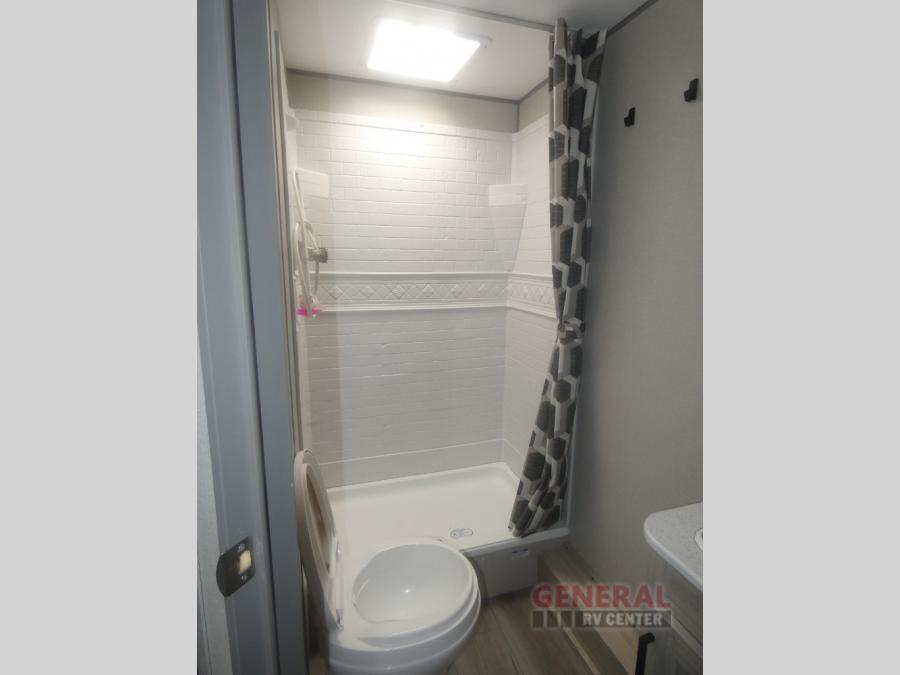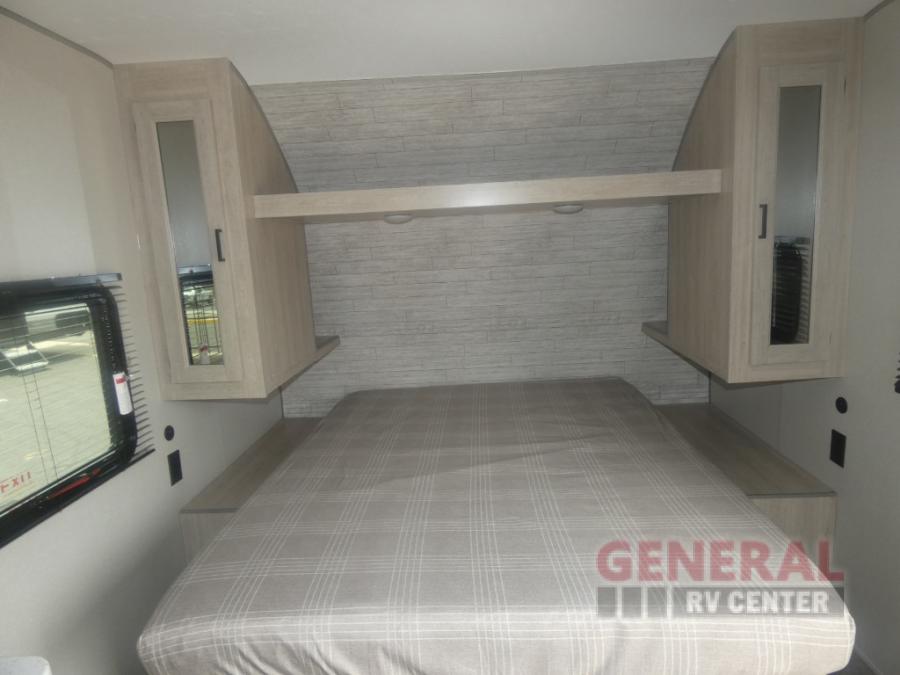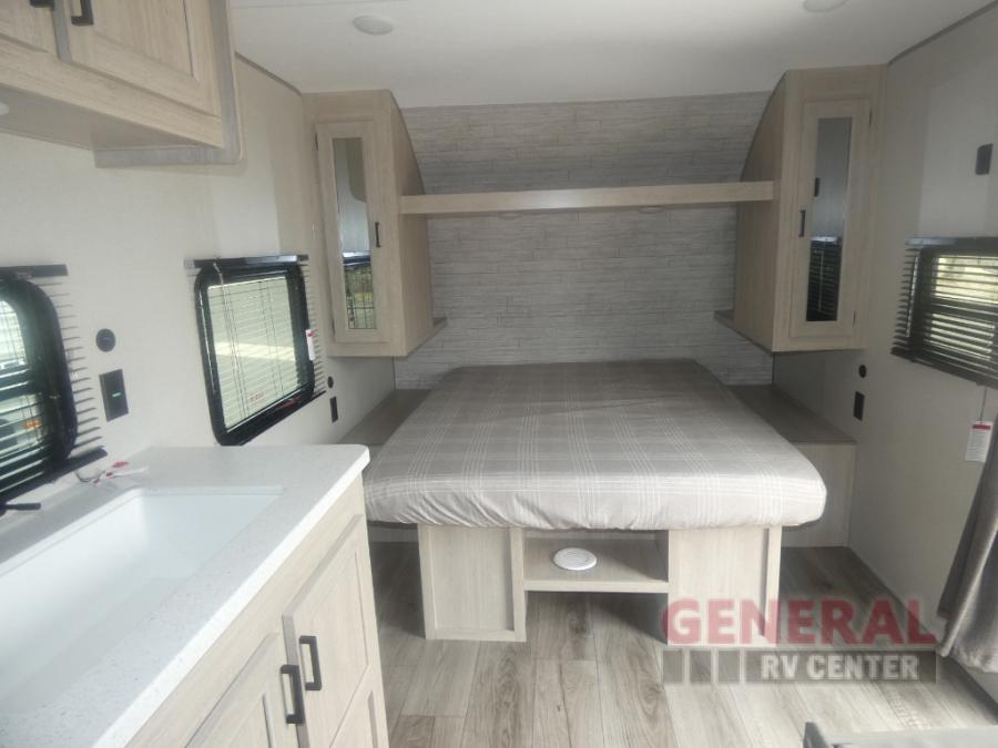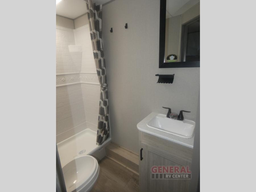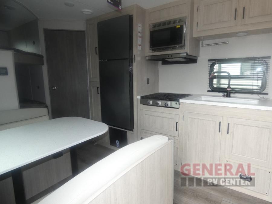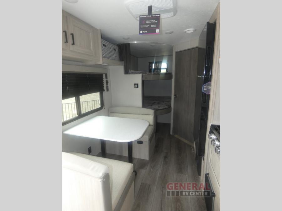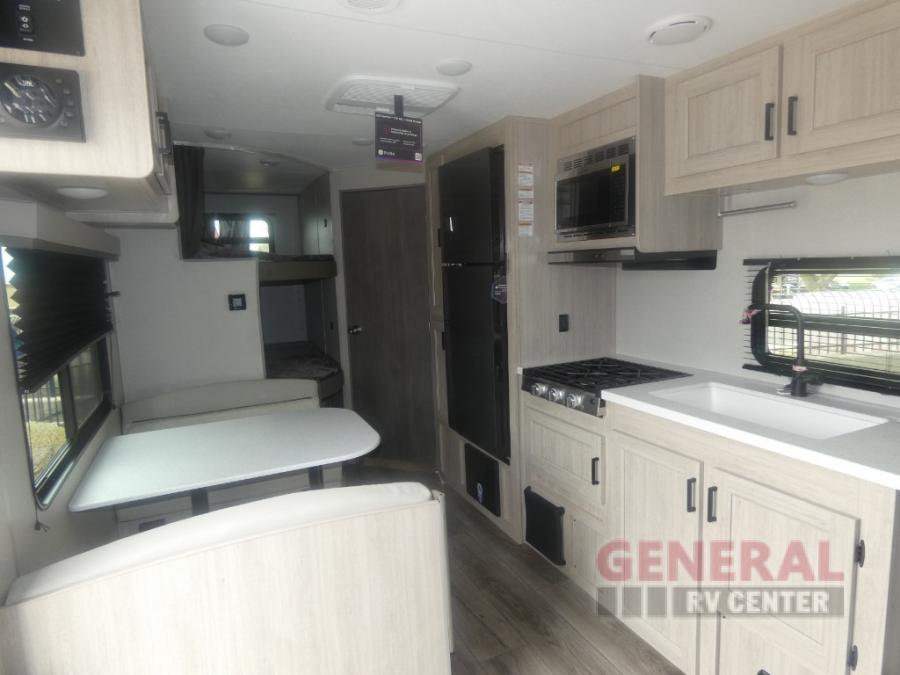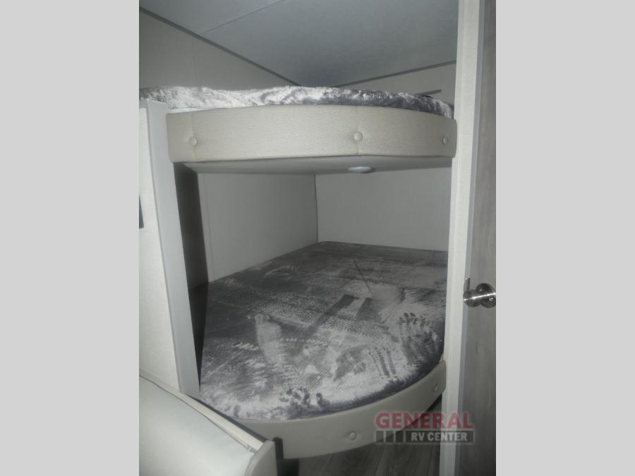 You'll love camping and spending time together in this travel trailer for seven! The bunk beds include under-bunk storage to keep bags out of the way, and the full bath is right next to the bunks for easy nighttime use. A semi-private bedroom up front includes a privacy curtain so you can get dressed each morning, and there are dual wardrobes to keep your things tidy. The chef of your group can whip up breakfast each morning on the three burner cooktop or in the GE stainless microwave, and there is a GEĀ 10.7 cu. ft. 12V refrigerator to keep perishables fresh! A booth dinette provides a place to dine, or you can take your plate outdoors to sit under the 15' power awning with multicolored lights!