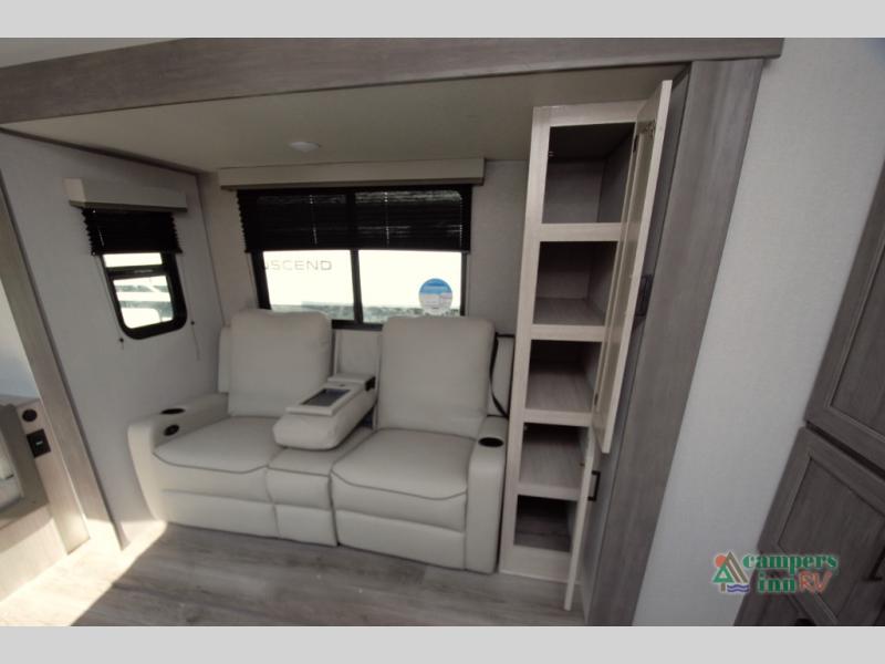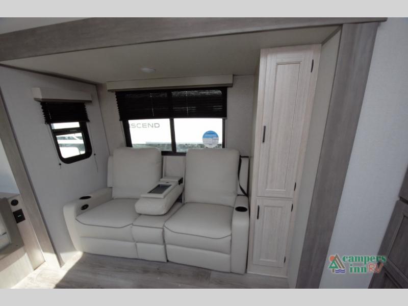 The rear U shaped dinette is perfect for meals, game nights, or additional sleeping space. Dual end tables add function, and the theater seating in the slide out provides a comfortable place to unwind after a day outdoors.