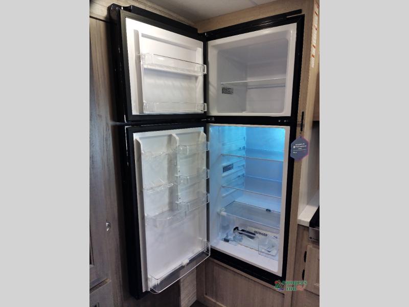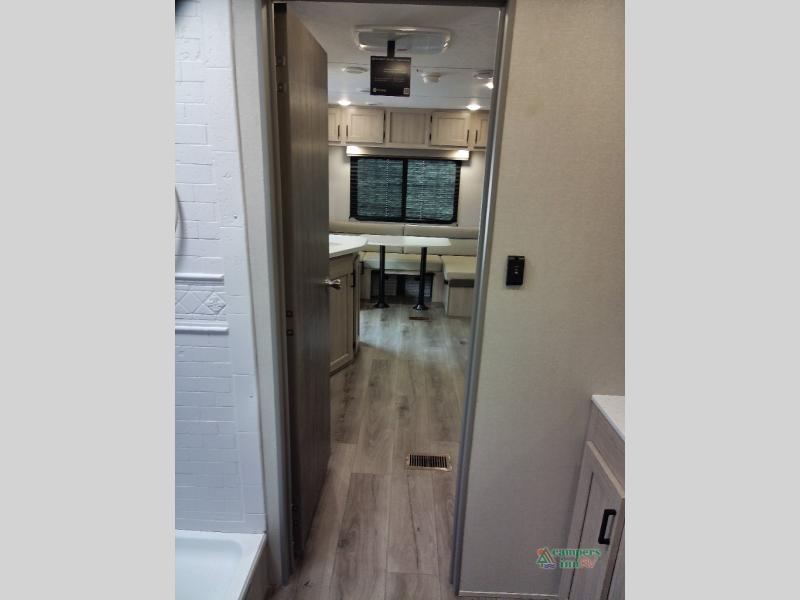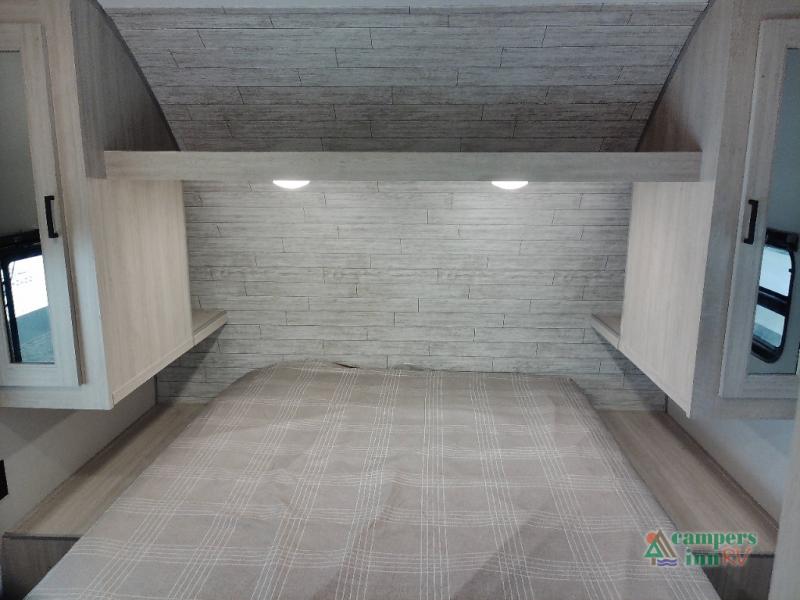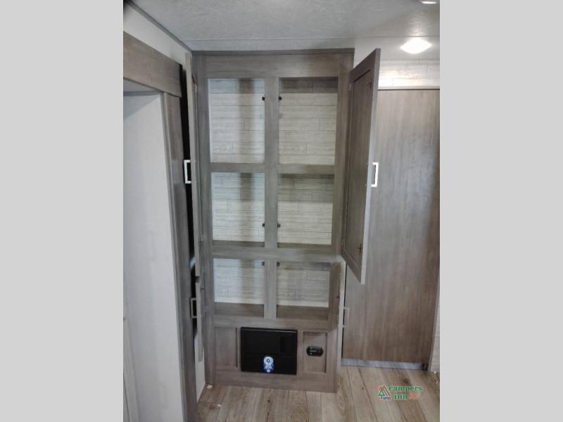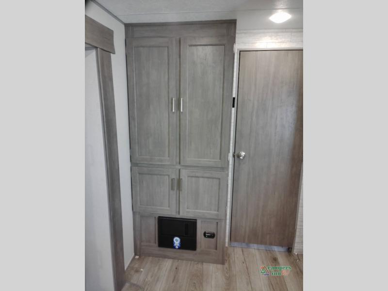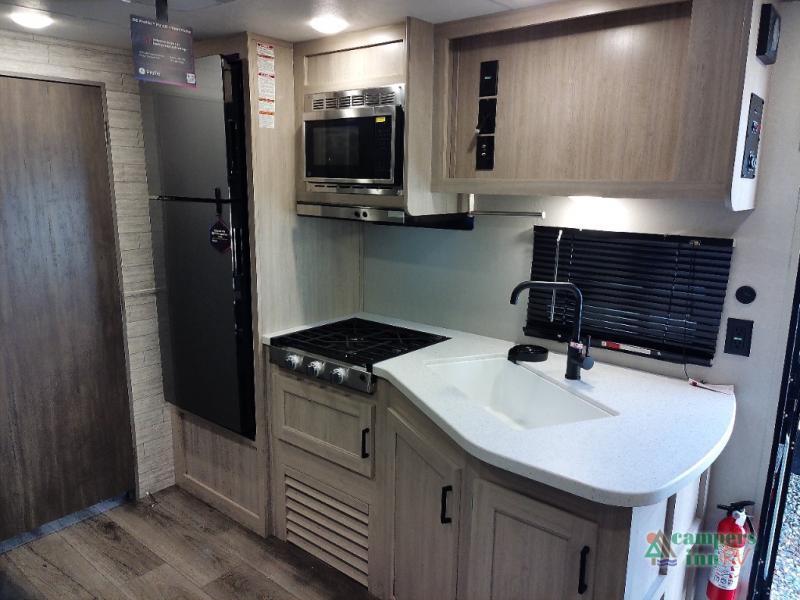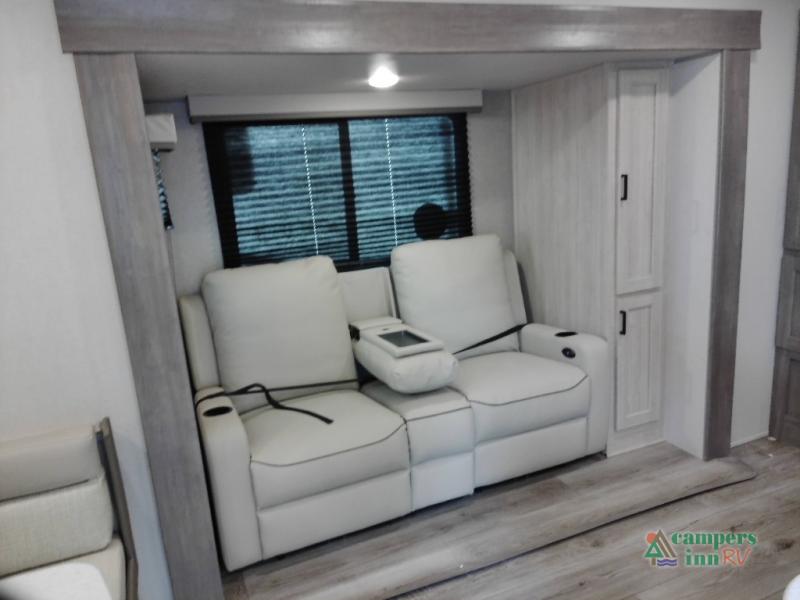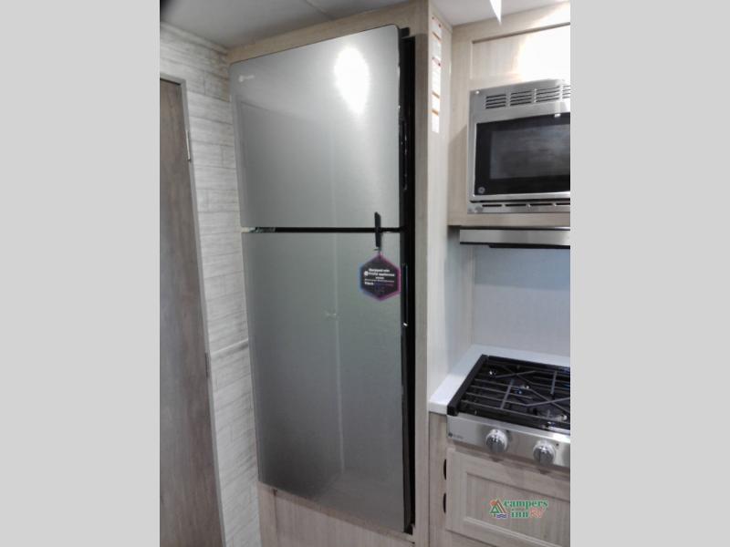 You and your spouse will love the layout of this trailer with a walk-through bathroom which is convenient for you when you are in the front bedroom, and handy for your guests when they stay overnight on the U-shaped dinette. The 68" theater seating includes dual end tables to set your drink on, and the U-shaped dinette will be perfect to dine around or play games at. The galley kitchen offers all the appliances needed to make all your meals, such as a GE stainless three burner cooktop, a GE stainless microwave, plus a GE stainless10.7 cu. ft. 12V refrigerator. You will have your own side of the walk-around queen bed and a wardrobe, as well as USB ports and 110V outlets in the nightstands.