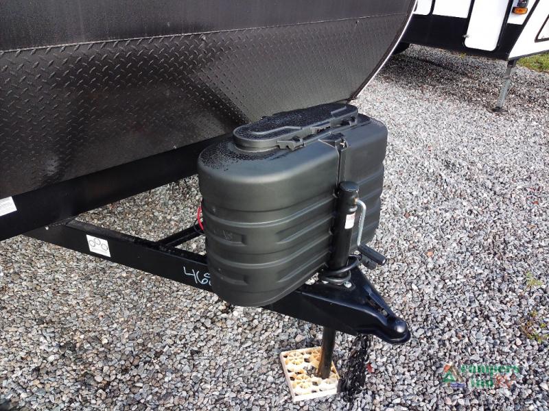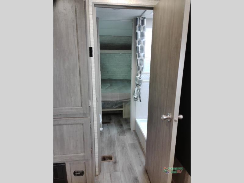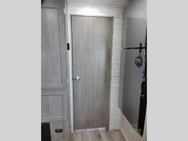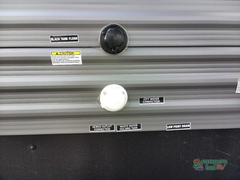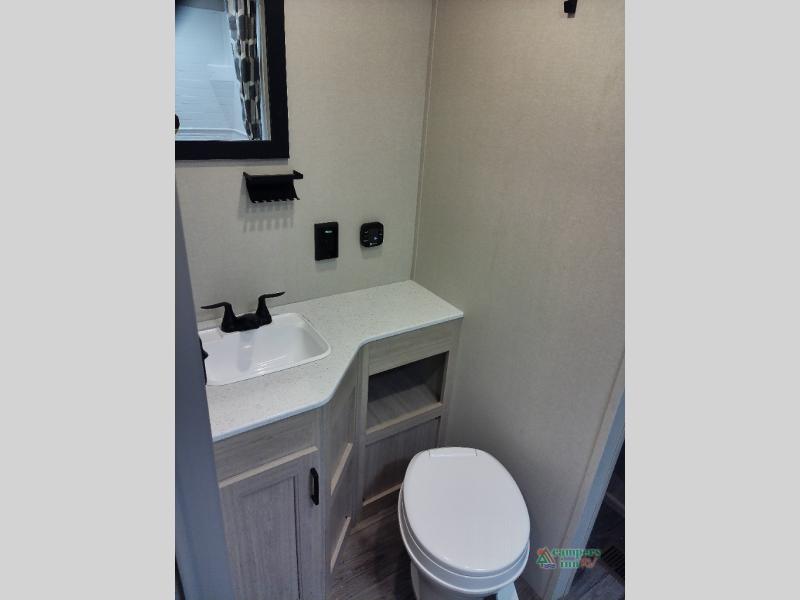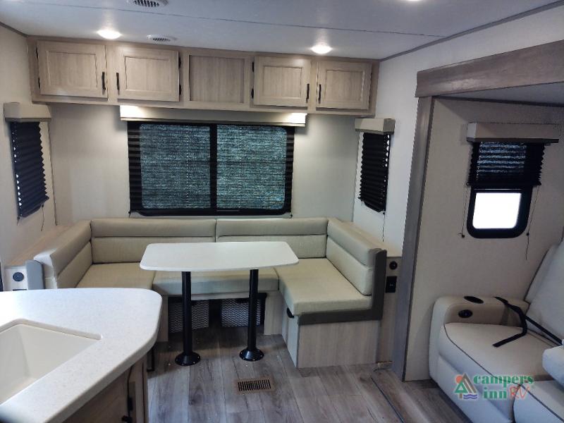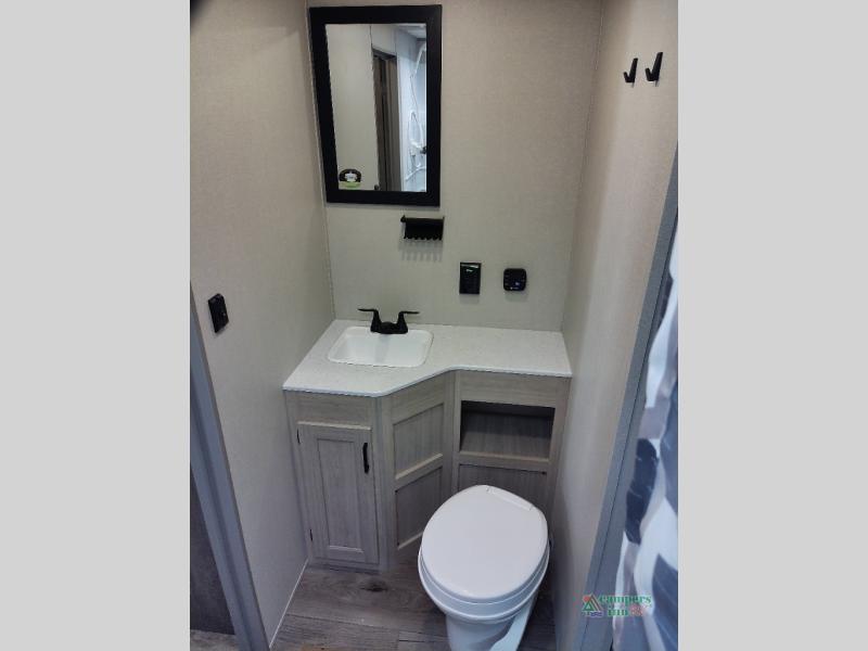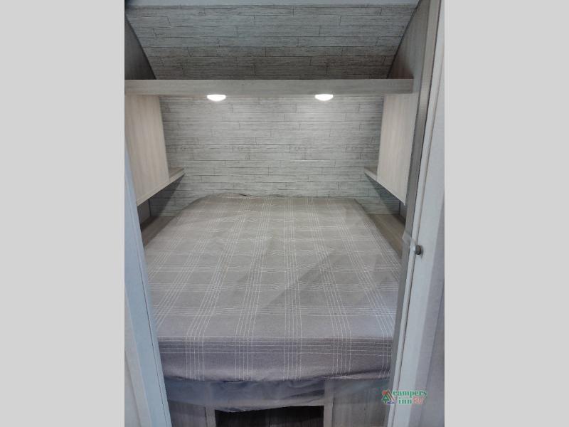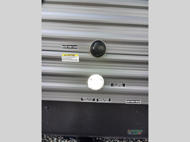 You and your spouse will love the layout of this trailer with a walk-through bathroom which is convenient for you when you are in the front bedroom, and handy for your guests when they stay overnight on the U-shaped dinette. The 68" theater seating includes dual end tables to set your drink on, and the U-shaped dinette will be perfect to dine around or play games at. The galley kitchen offers all the appliances needed to make all your meals, such as a GE stainless three burner cooktop, a GE stainless microwave, plus a GE stainless10.7 cu. ft. 12V refrigerator. You will have your own side of the walk-around queen bed and a wardrobe, as well as USB ports and 110V outlets in the nightstands.