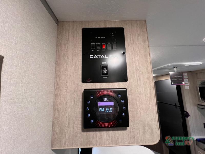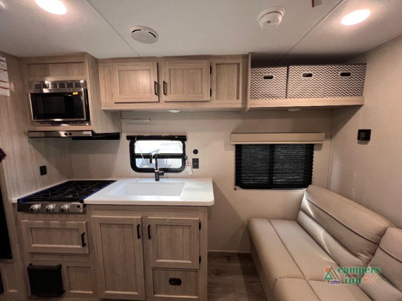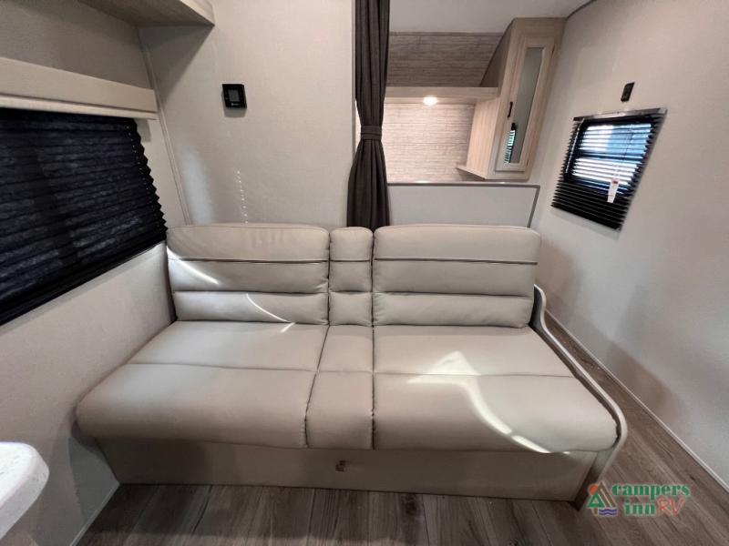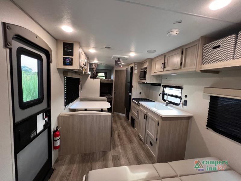 Discover the perfect travel trailer for your family with the 2026 Coachmen Catalina Summit Series 8 261BH. Inside, you’ll have the choice to relax on the cozy sofa or the booth dinette, both offering great spots to unwind after a day of exploring. Above the sofa, a handy shelf with storage totes keeps your belongings organized and accessible, while an additional overhead cabinet above the dinette is perfect for storing games and entertainment essentials.