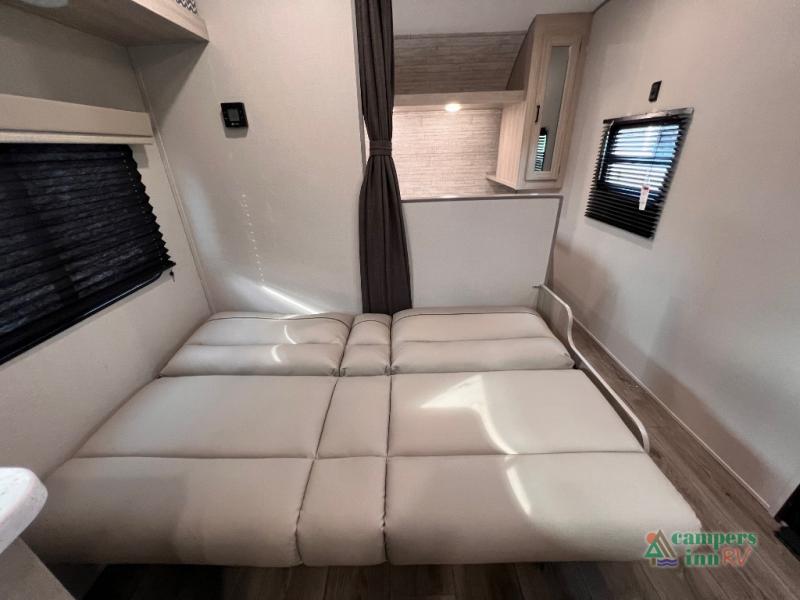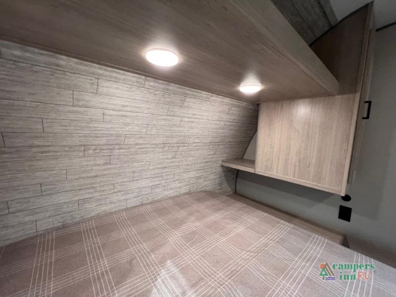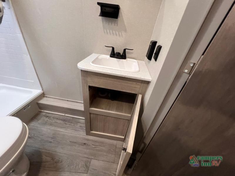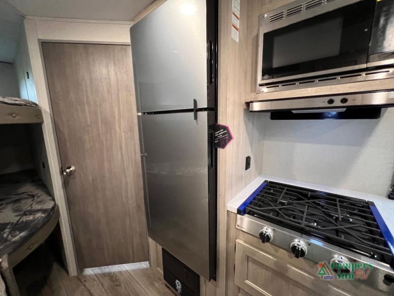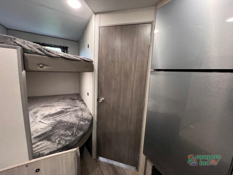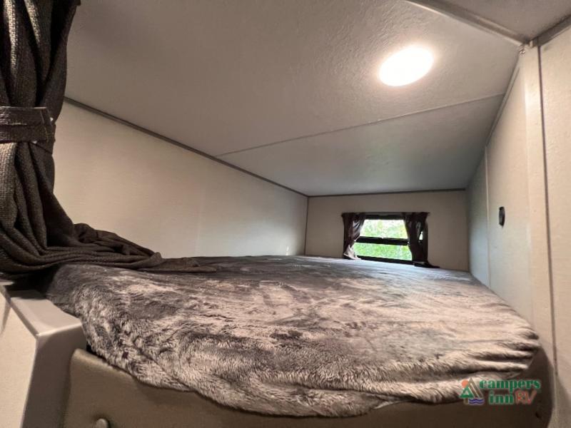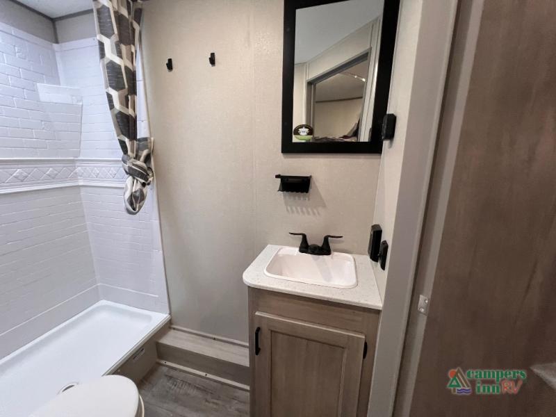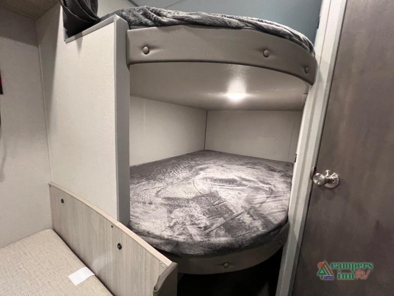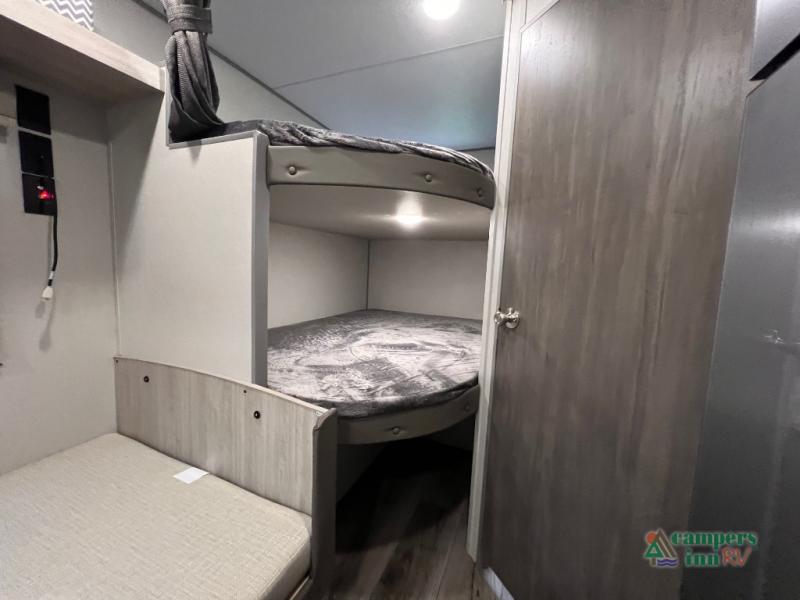The kids will love their own double-size bunks, perfect for sharing sleepovers with friends or siblings, and the nearby full bathroom adds convenience for the whole family. This travel trailer balances comfort and practicality, making every camping trip memorable.