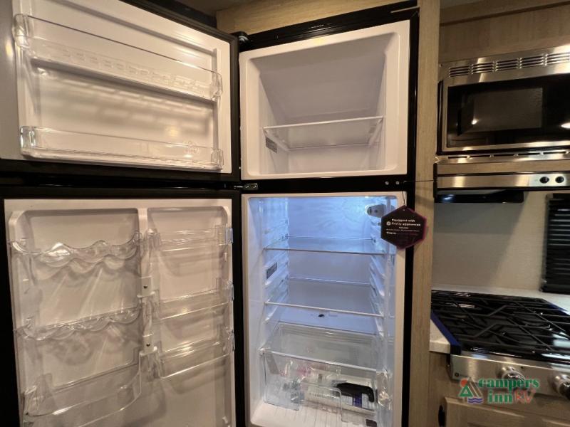 Retreat to the semi-private front queen bedroom for a restful night’s sleep, tucked away from the main living space to offer privacy and comfort. The fully equipped kitchen lets you prepare delicious meals before you head out to explore nearby trails or relax outdoors. Speaking of outdoors, the 15-foot electric awning with multi-color LED lighting and remote control creates the ideal shaded outdoor living space for socializing with fellow campers or simply enjoying the fresh air.
