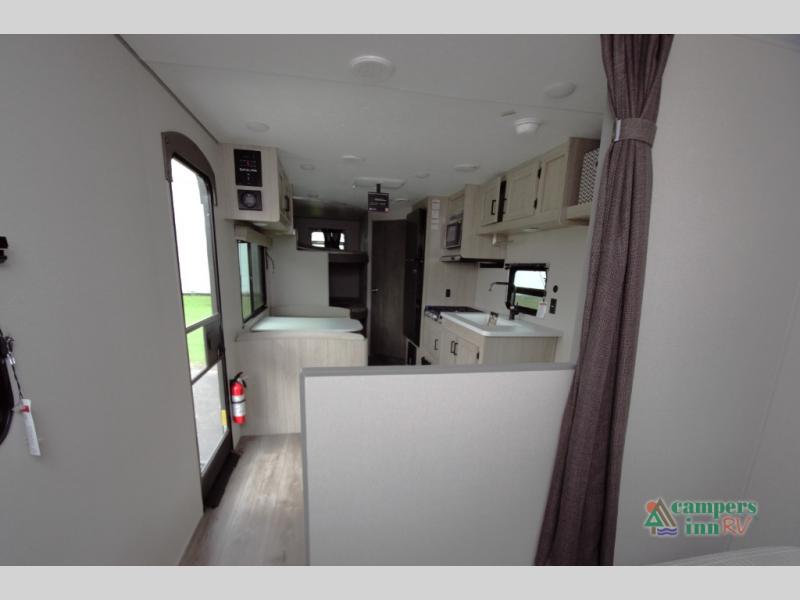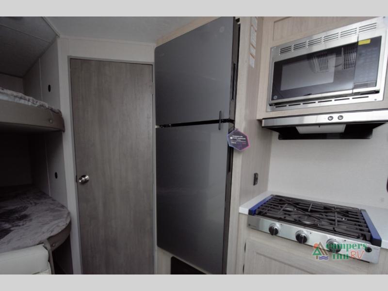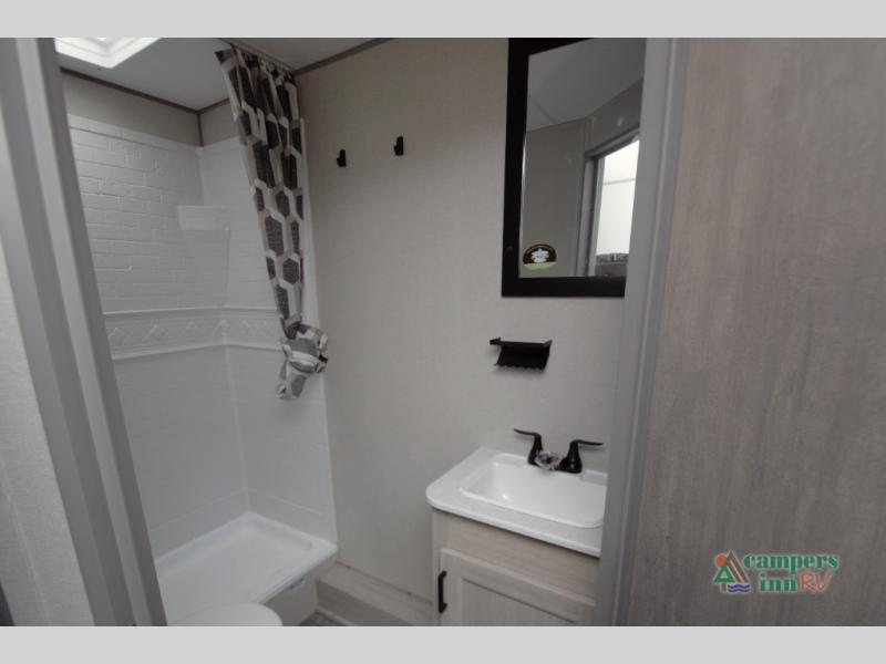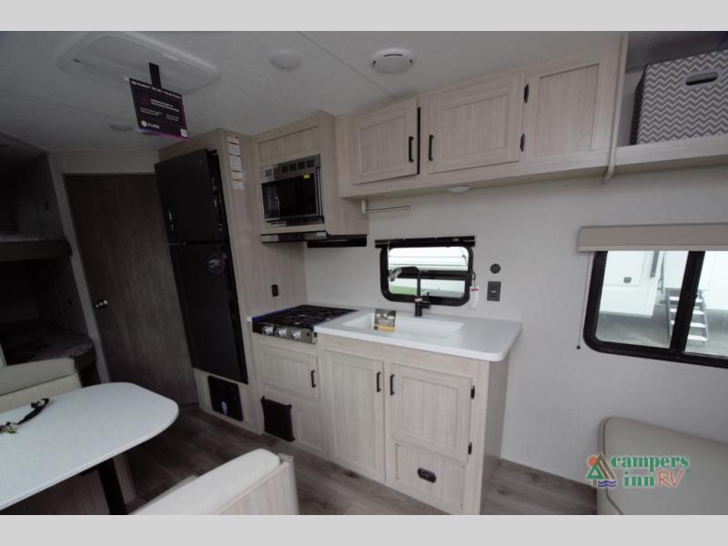 This travel trailer is designed for relaxing and making memories. Choose between the sofa or dinette for meals and game nights. The kitchen is fully equipped for meal prep, and the nearby queen bed offers a private space to rest. Kids will enjoy their own sleeping area with spacious double bunks. A full bathroom adds comfort and convenience on every trip.