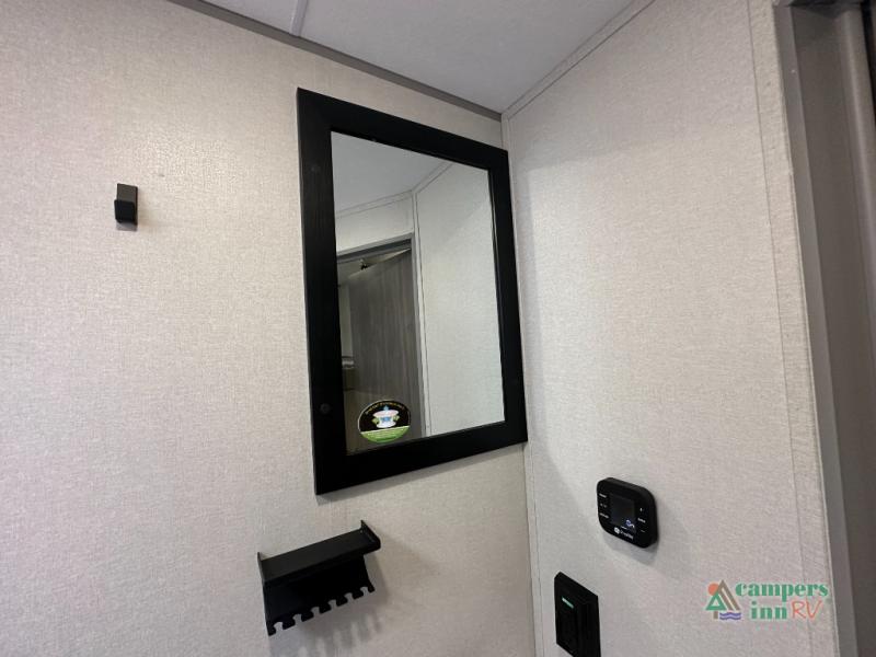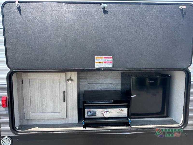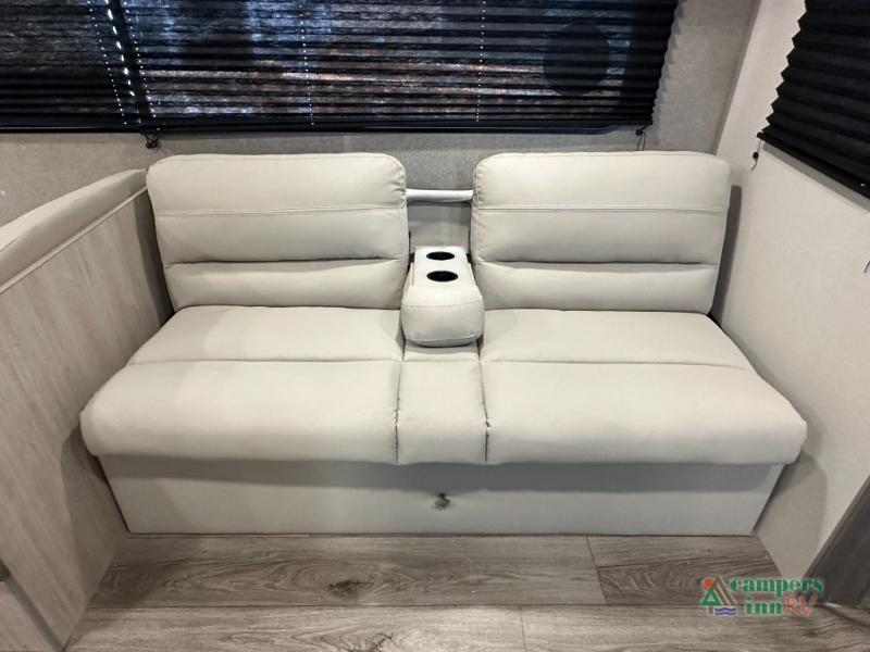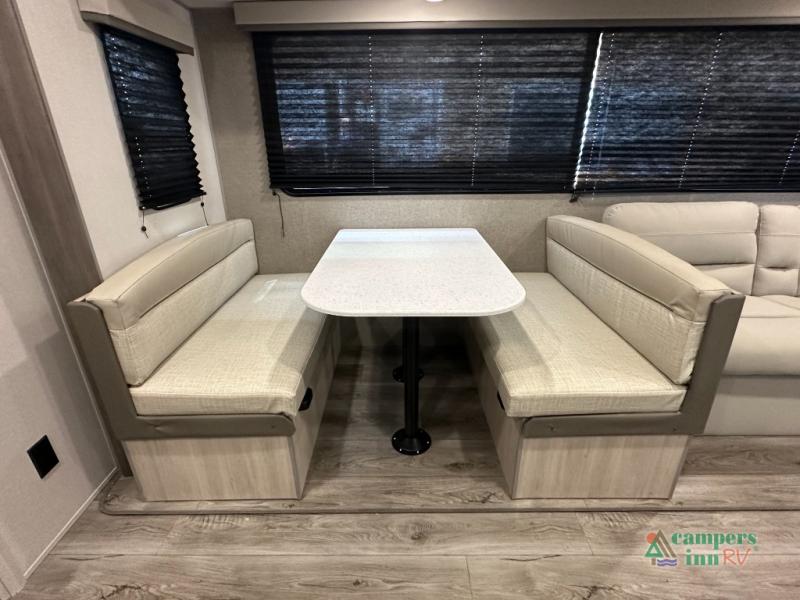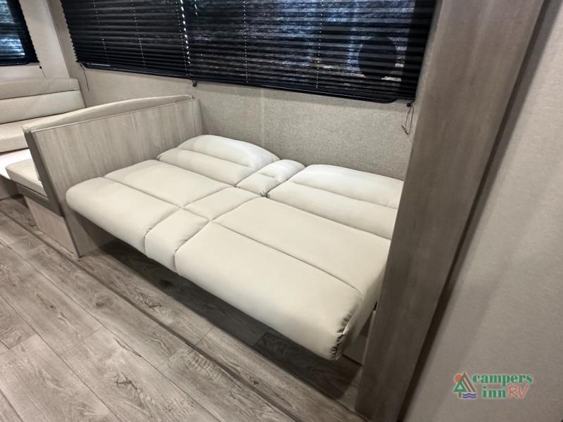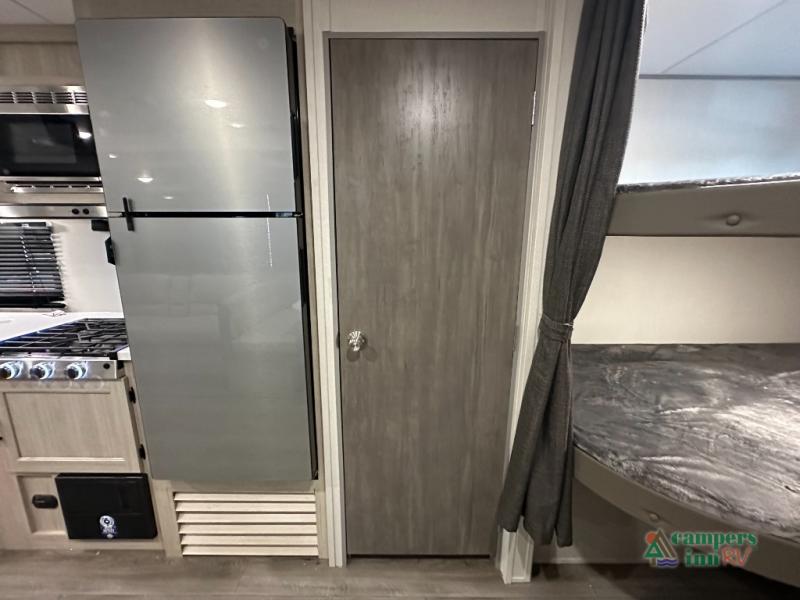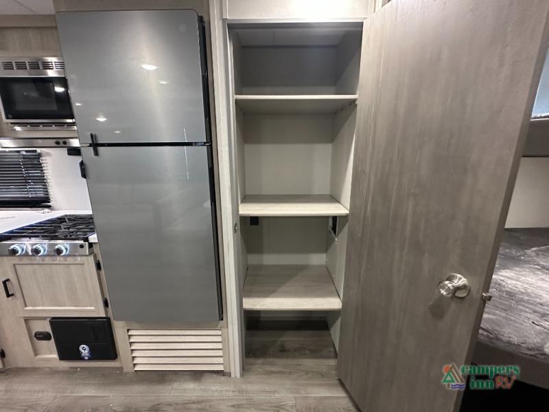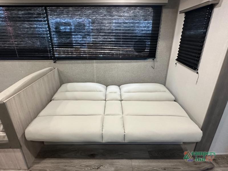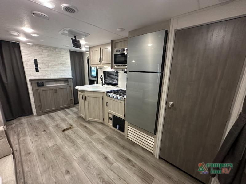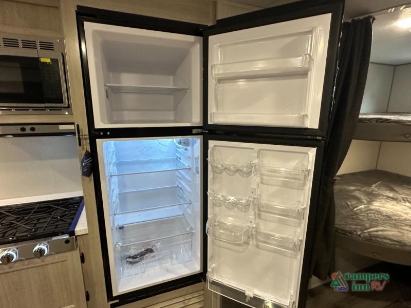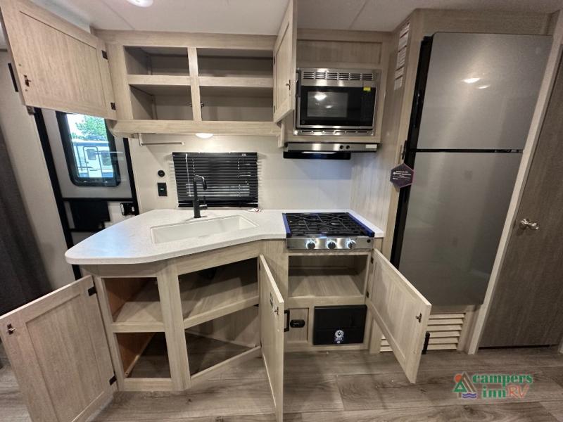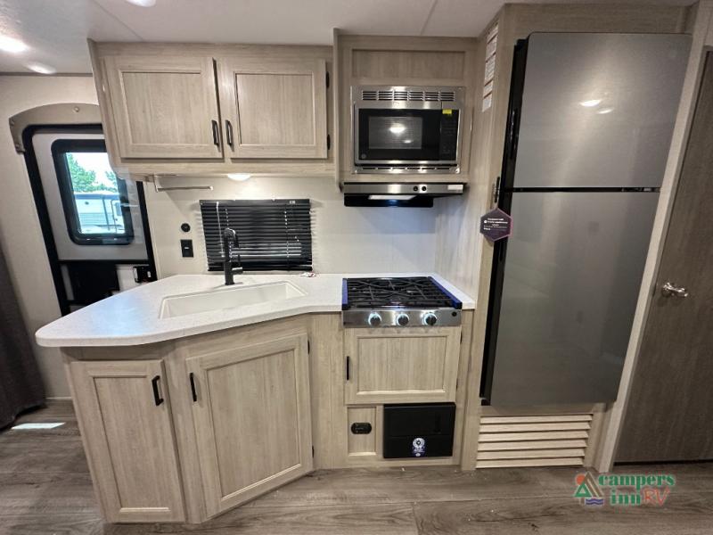 Kitchen includes 3-burner cooktop, microwave, stainless-steel 10.7 cu ft 12V refrigerator.