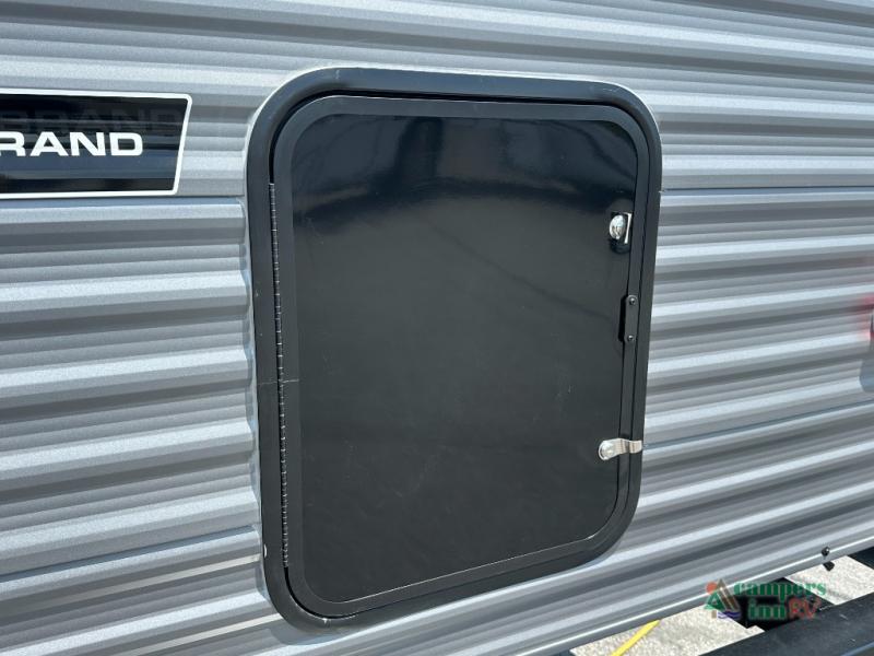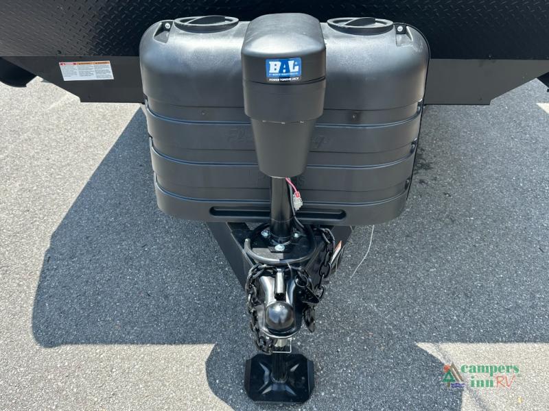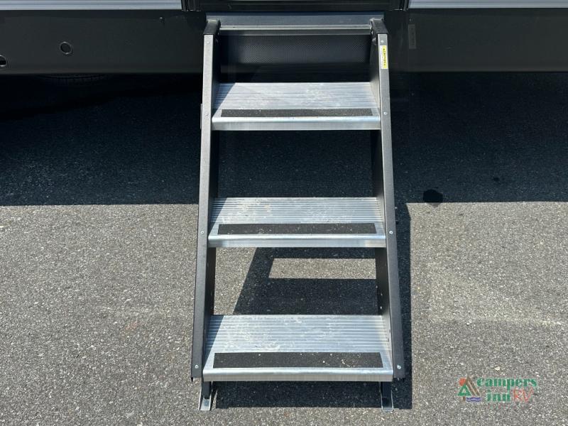 Exterior features: Power awning (~15 ft) with multicolor LED strip & remote, solid steps (MORryde StepAbove), diamond plate rock guard, black tank flush, solar prep, rear ladder prep, tinted privacy windows, etc.