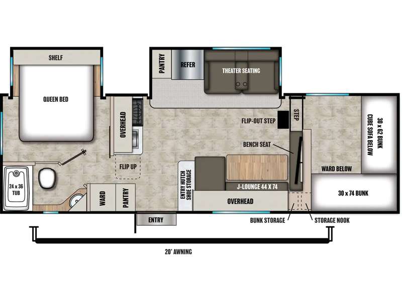 Front bunk room: Two single bunks + a futon. Privacy curtain + built-in storage. Great for kids, guests, or doubling as a hangout/gear space.