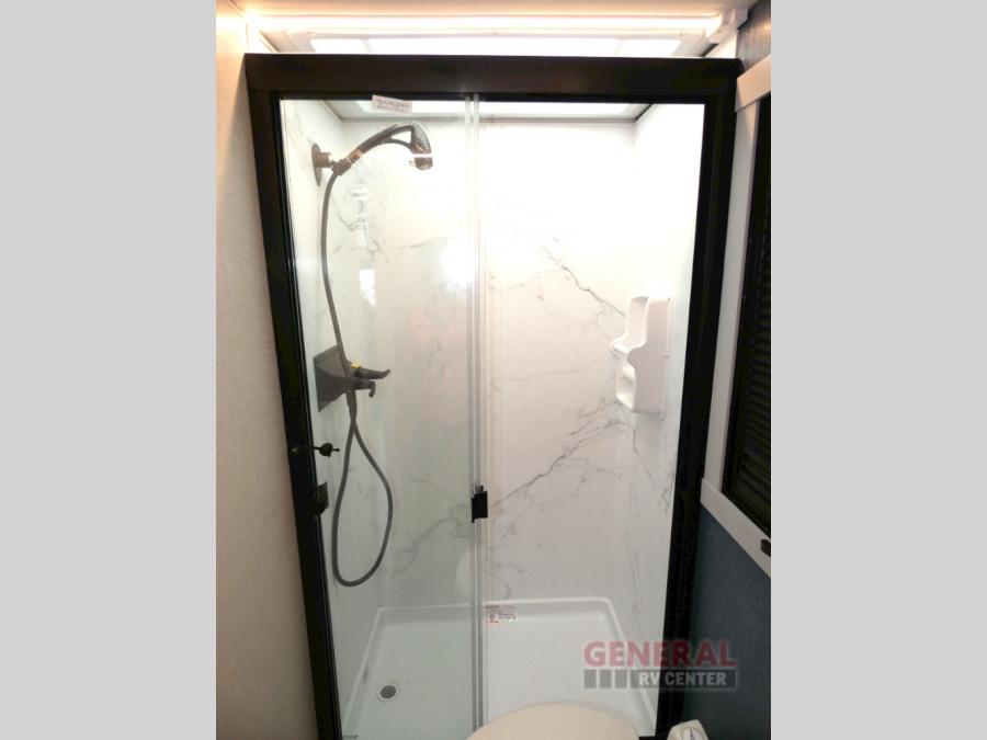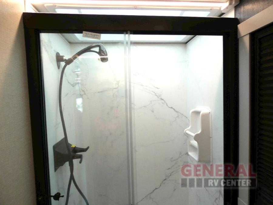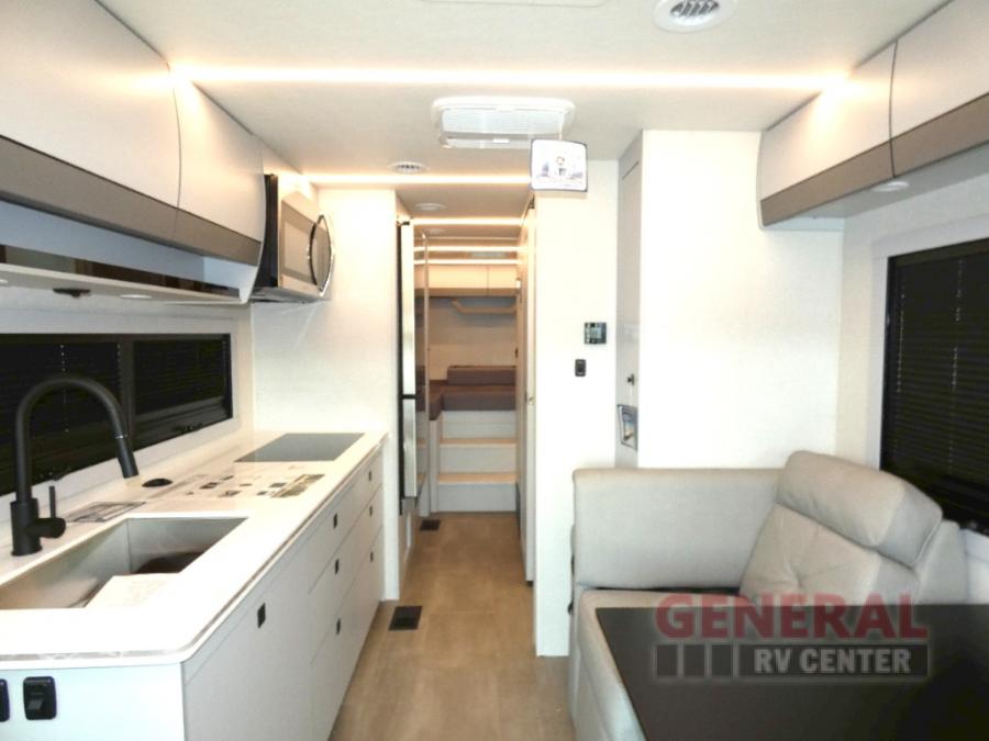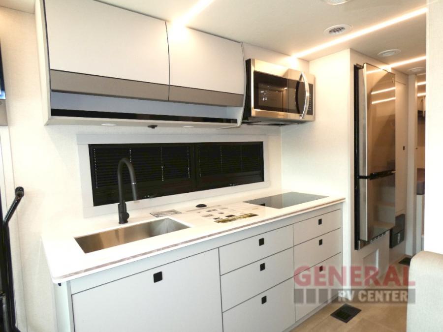 You will find lots of versatility in this coach! The chef can prepare their best home cooked meals with the induction cooktop and stainless steel double door refrigerator to keep your perishables fresh. The full bathroom has a 24" x 36" shower with a skylight above for added natural lighting. There are plenty of overhead cabinets throughout for your items to stay out of the way, plus a 32" TV above the entrance door. You even have an exterior 95" x 38" x 37" mega pass-through storage area for your outdoor gear!